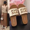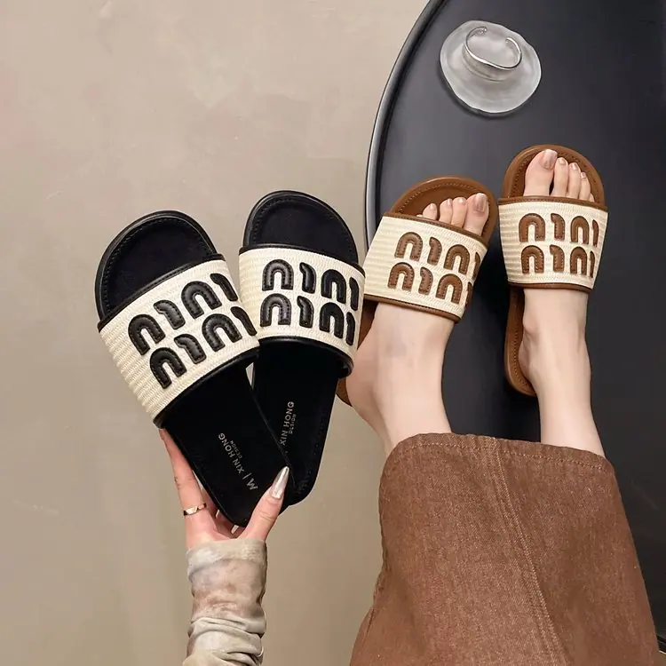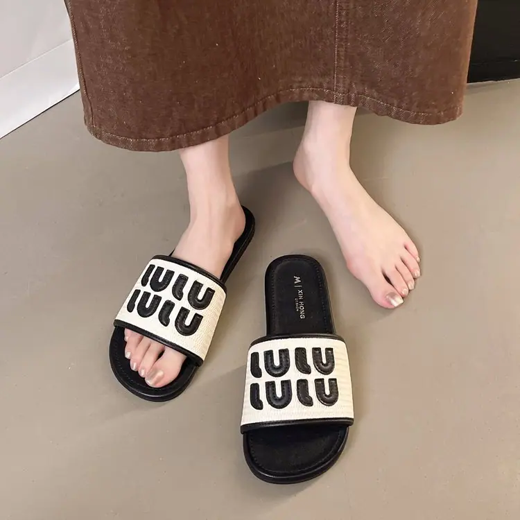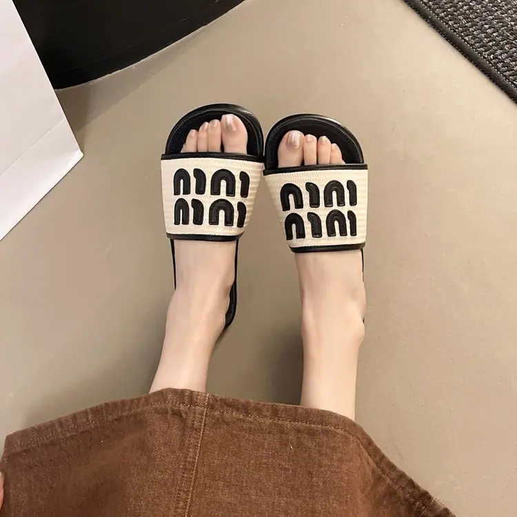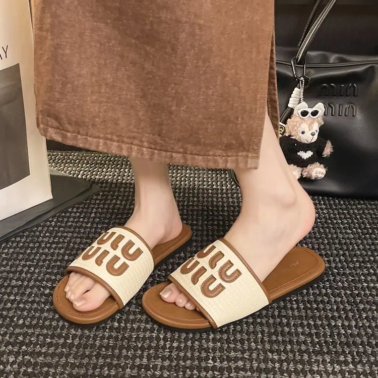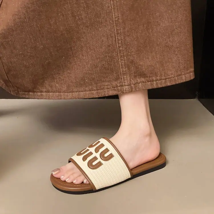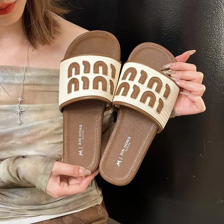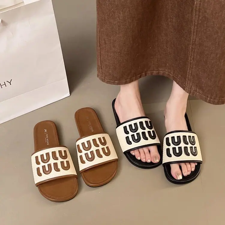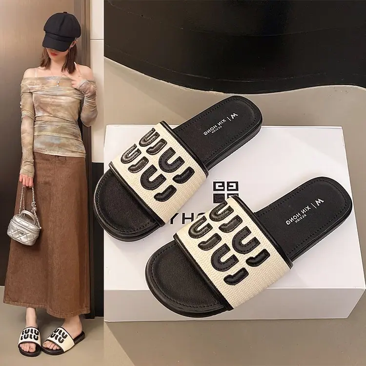 Pantuflas planas de una tira para mujer, verano, nuevo estilo para exterior con falda, pantuflas de playa