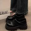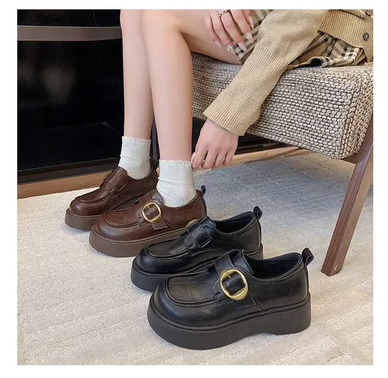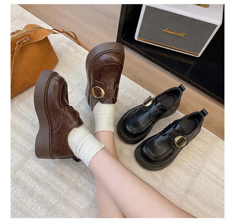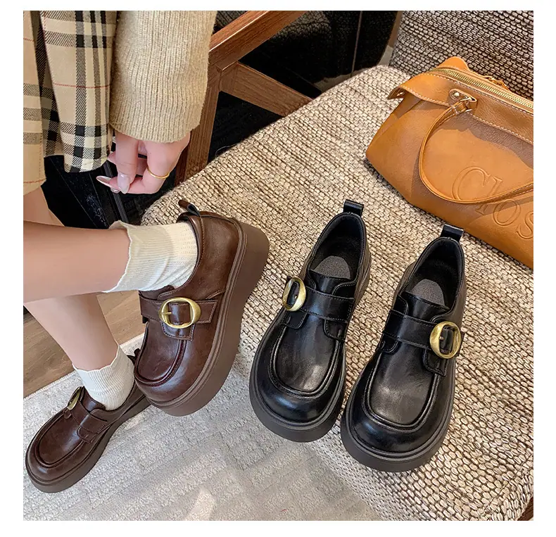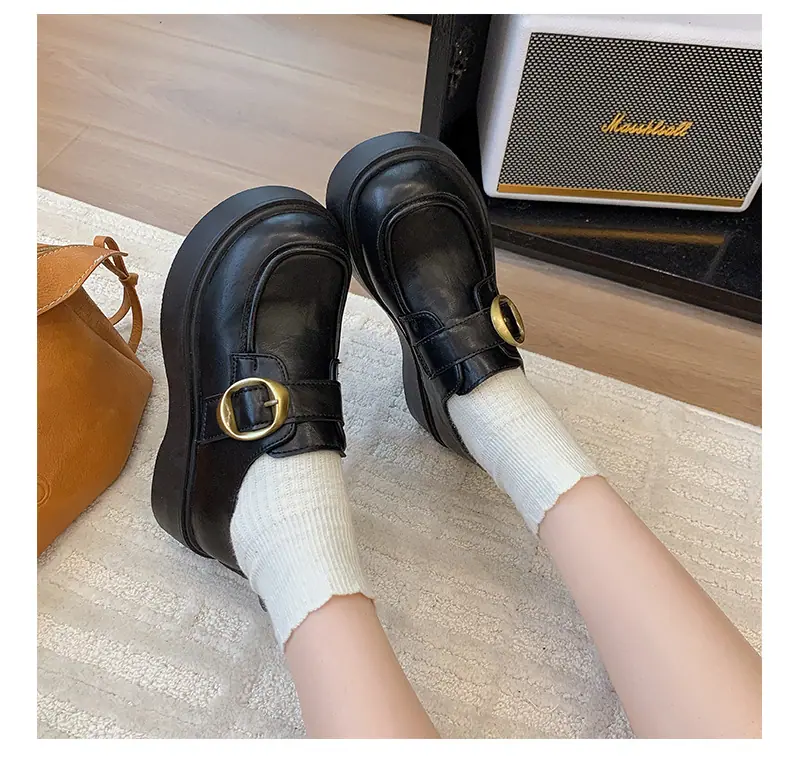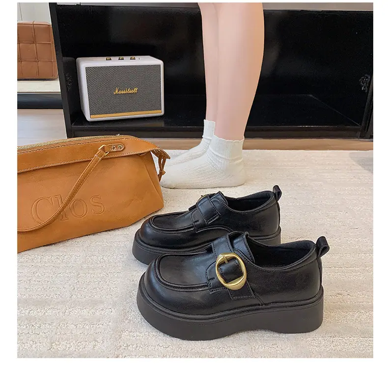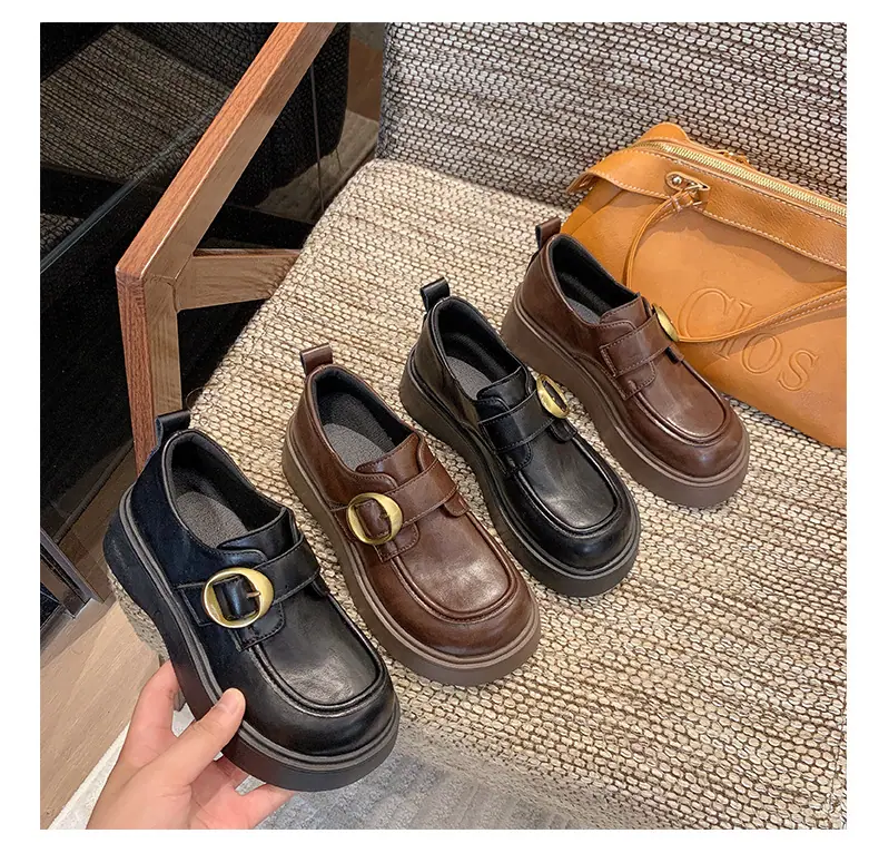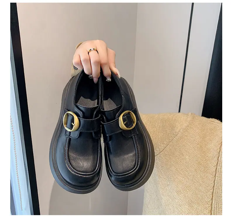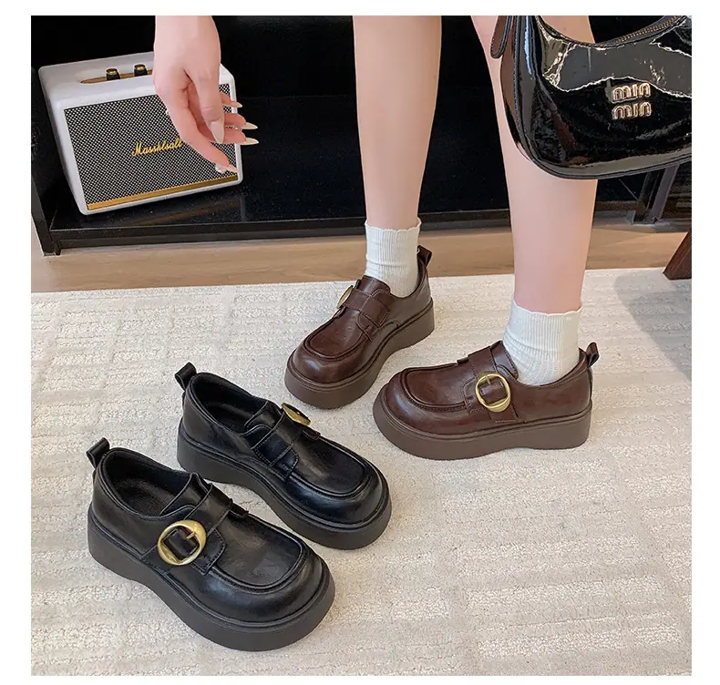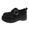 Zapatos pequeños de cuero estilo británico para mujer verano 2025 nuevos plataforma suela gruesa punta redonda versátiles Velcro mocasines negros