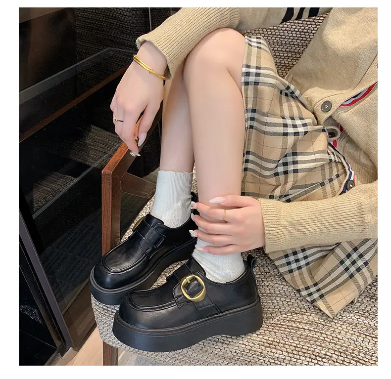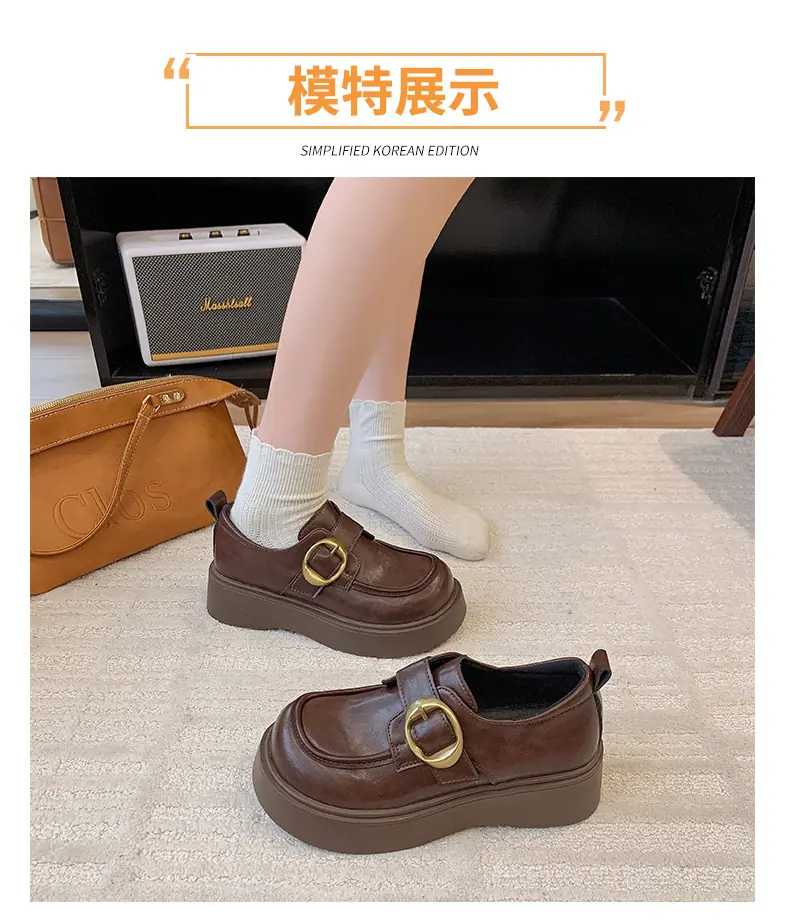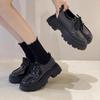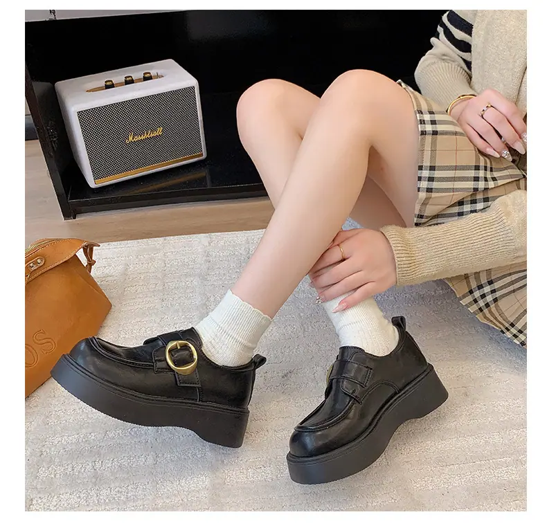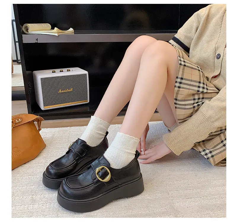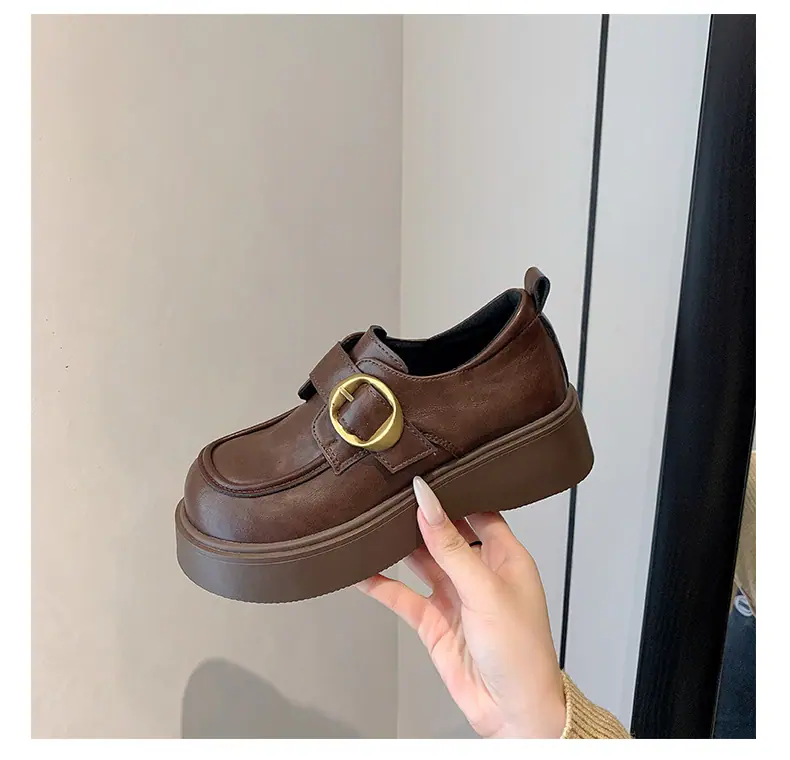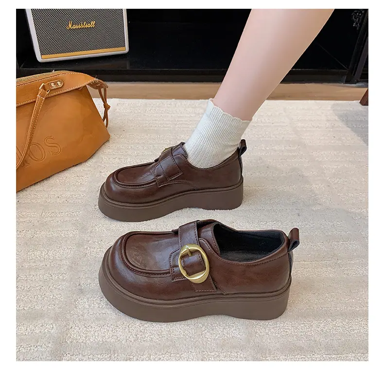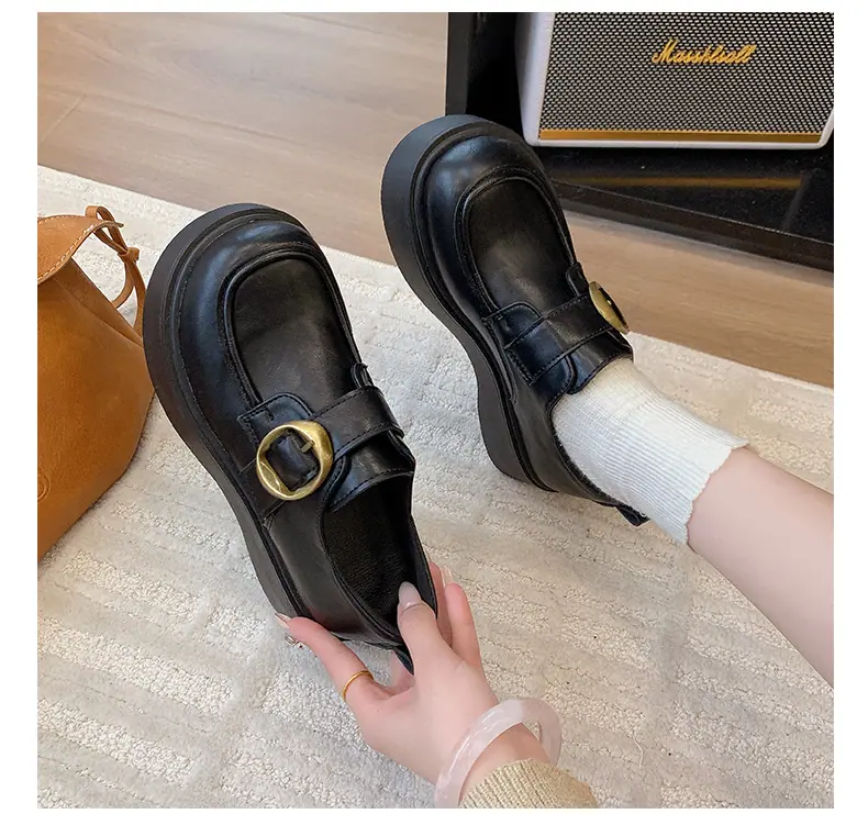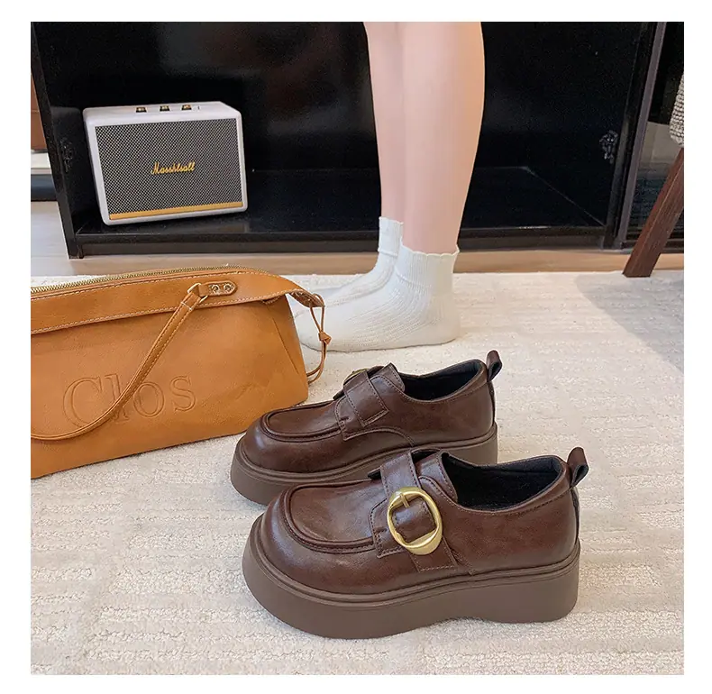 Zapatos pequeños de cuero estilo británico para mujer verano 2025 nuevos plataforma suela gruesa punta redonda versátiles Velcro mocasines negros