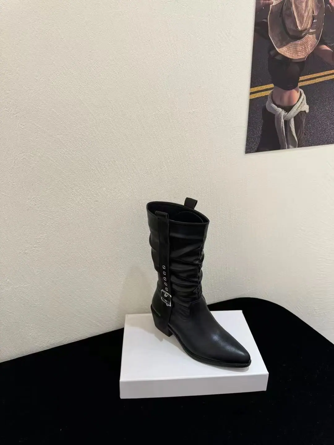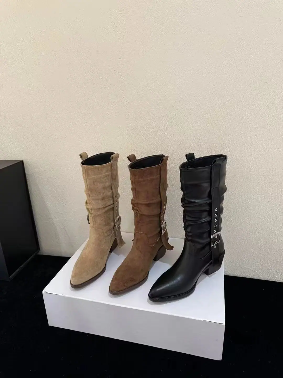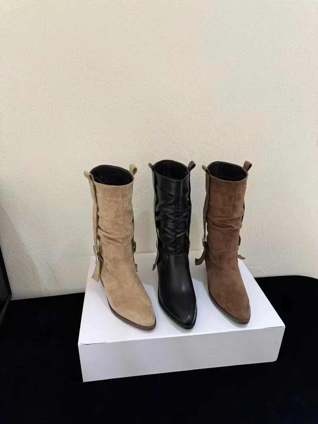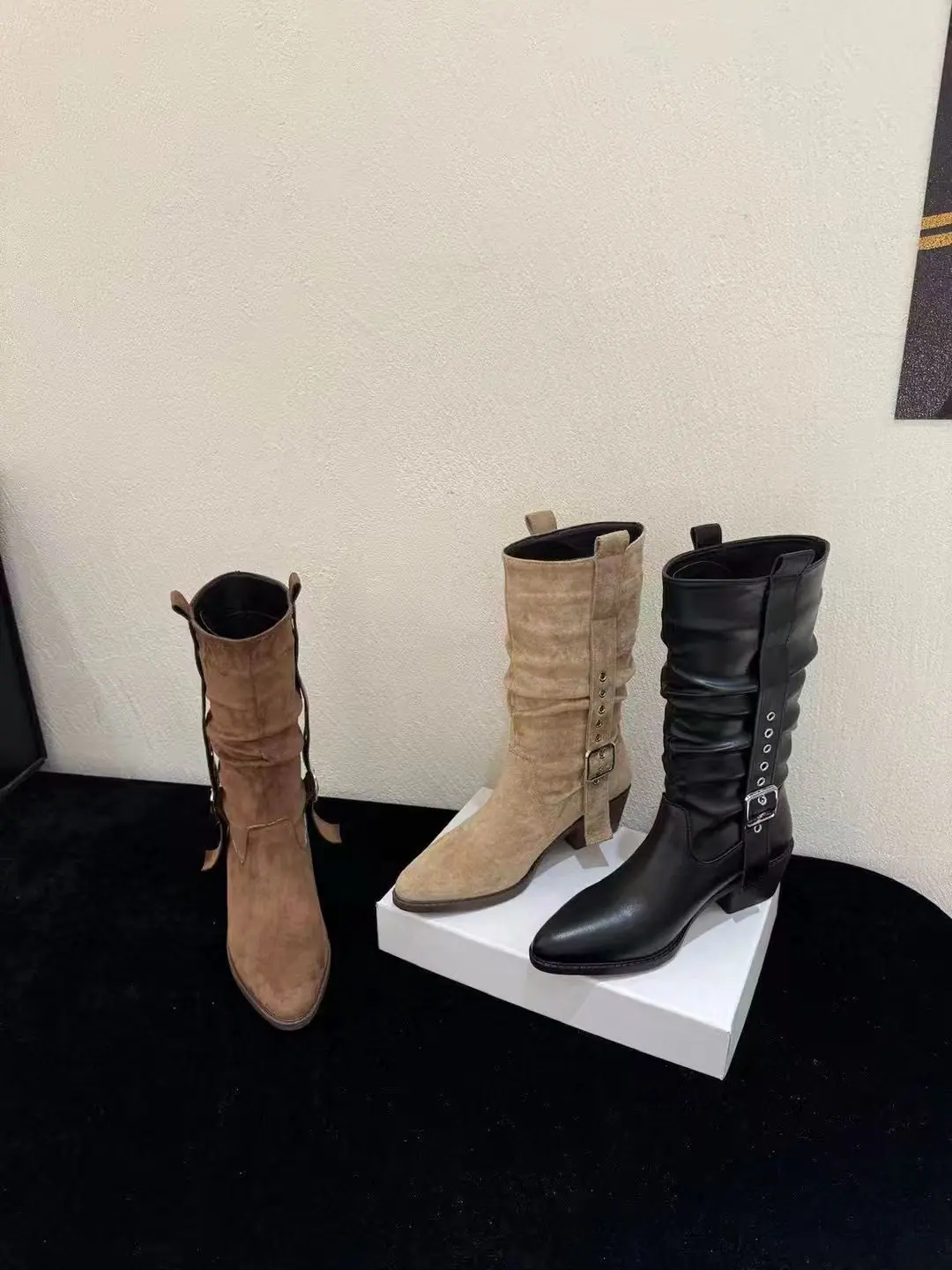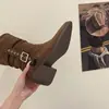 Botines de Punta para Mujer Tacón Grueso Botas Martin 2025 Otoño/Invierno Nuevas Botas de Tacón Alto Retro Francés Botas Vaqueras Occidentales