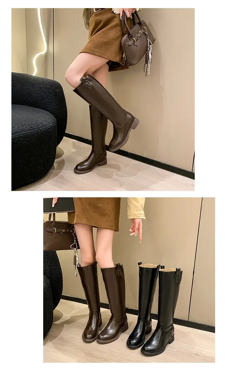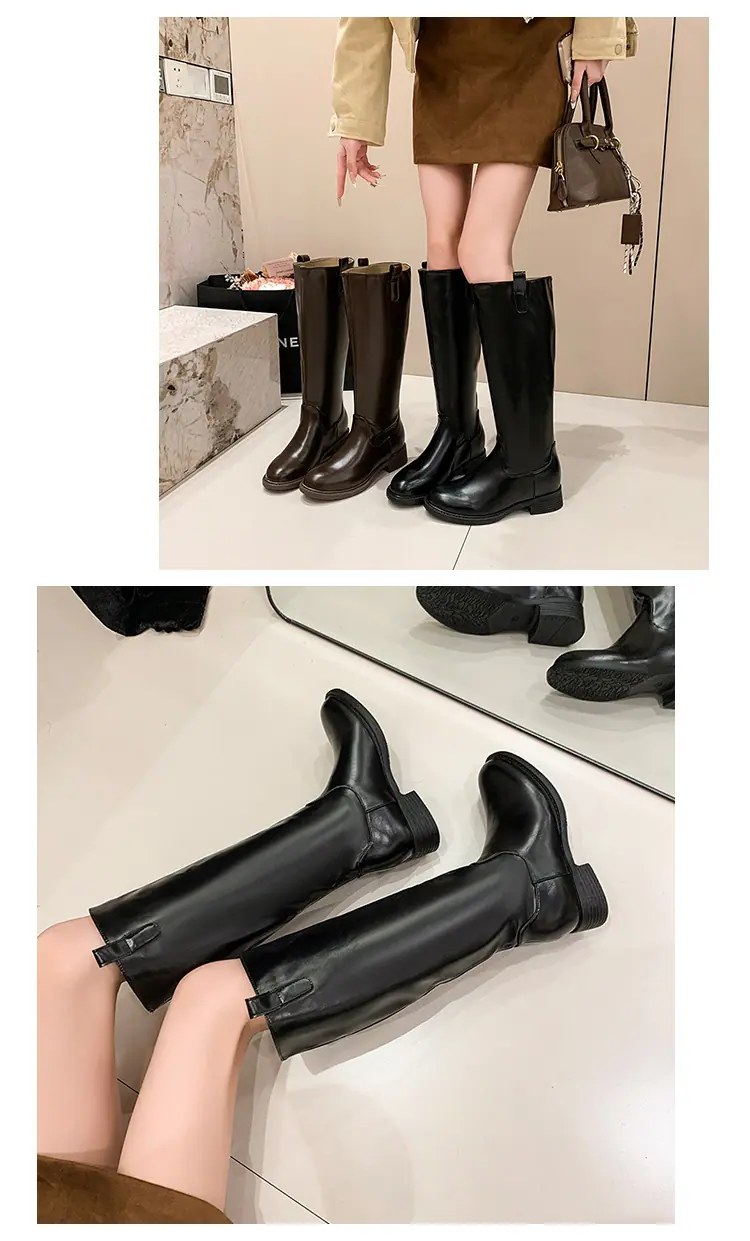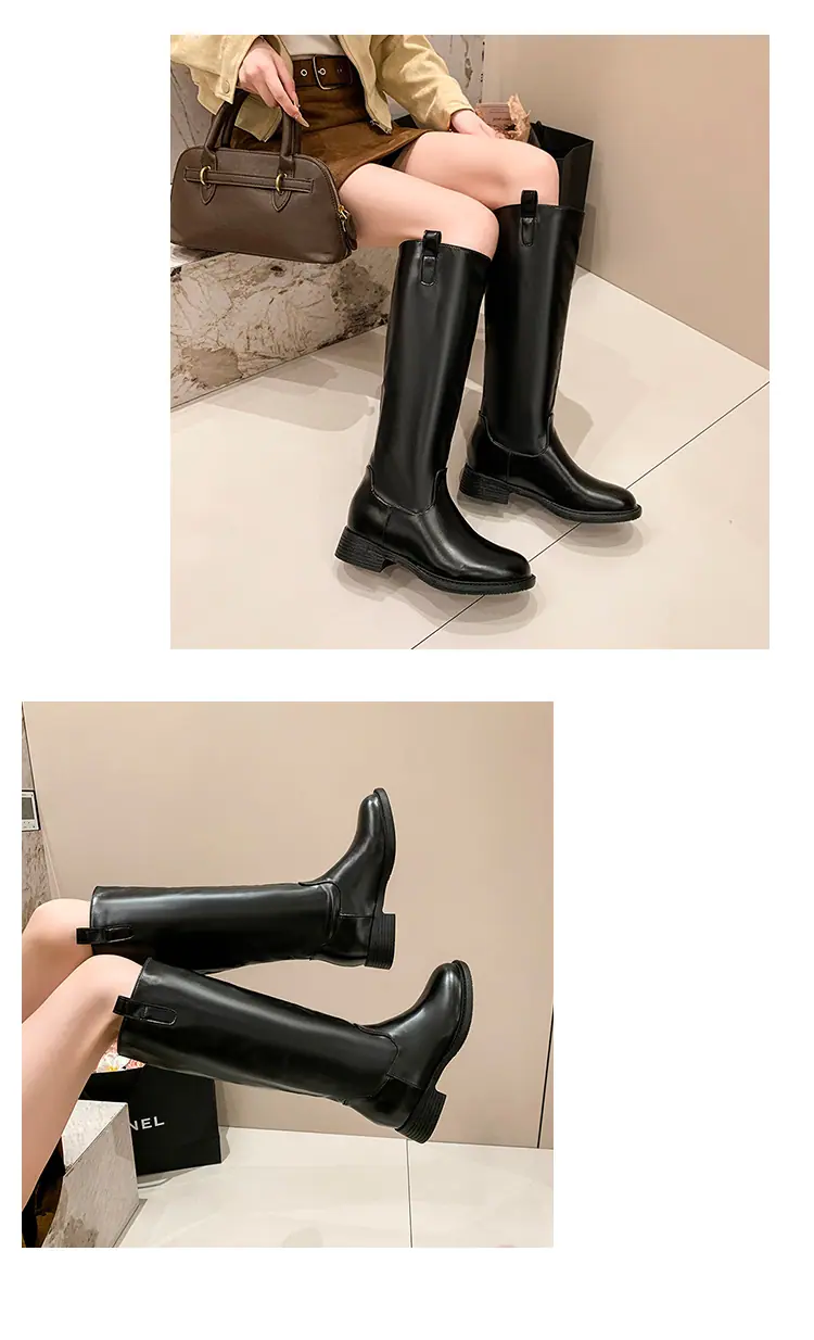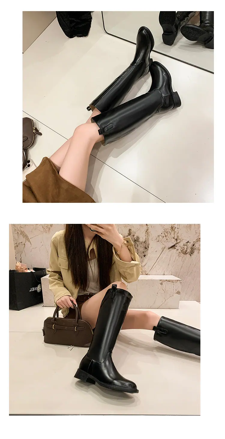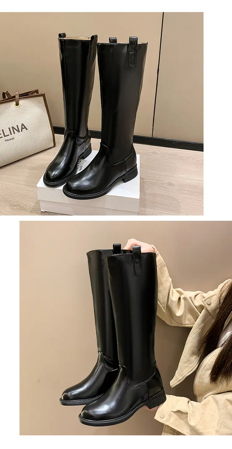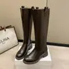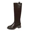 Botas planas hasta la rodilla de tacón grueso para mujer 2025 nuevo otoño e invierno punta redonda negras caña alta por encima de la rodilla adelgazantes tipo caballero botas largas