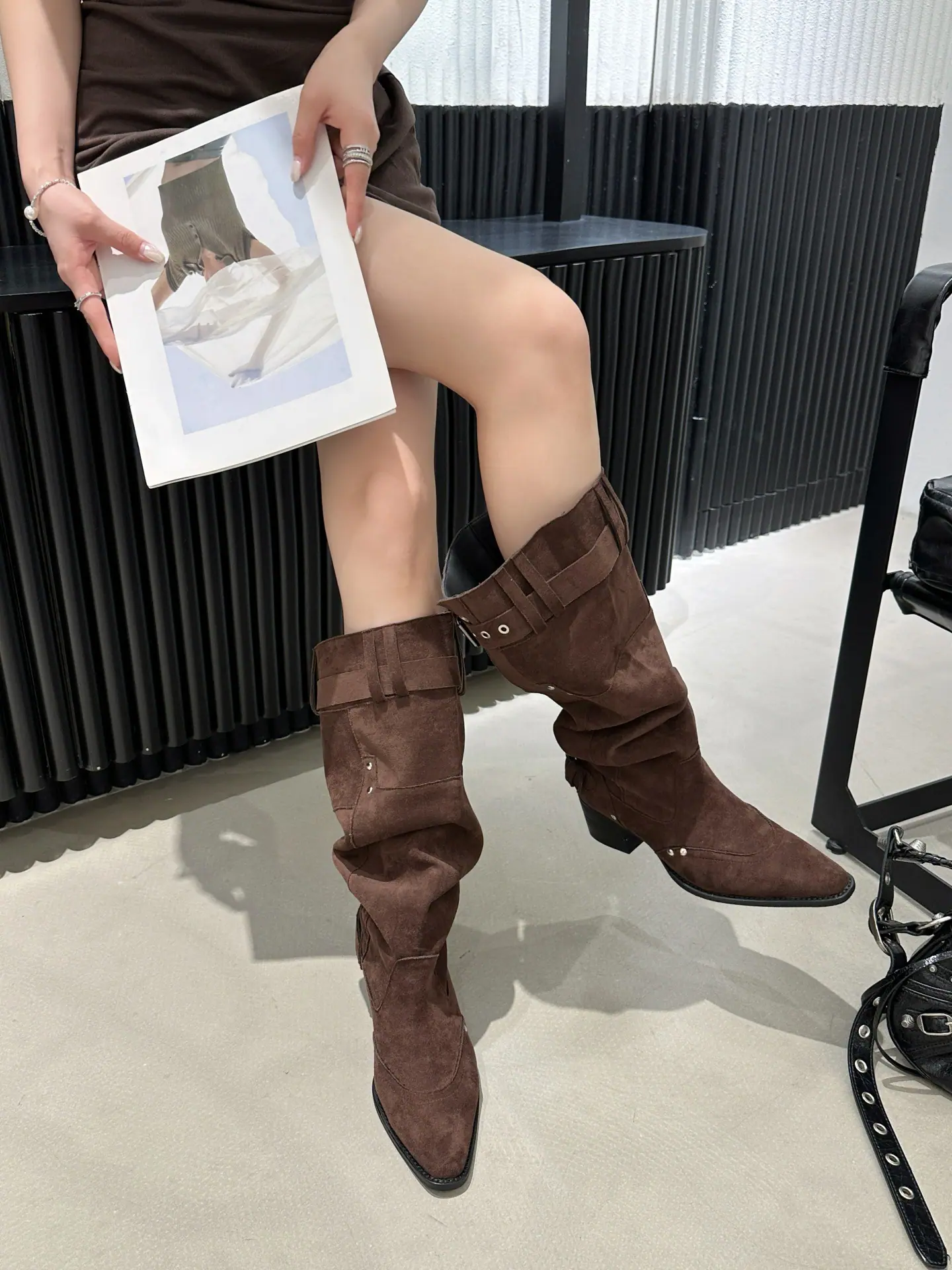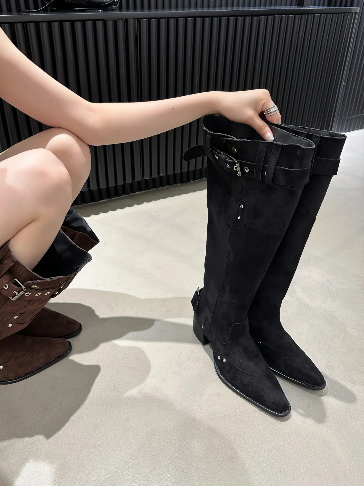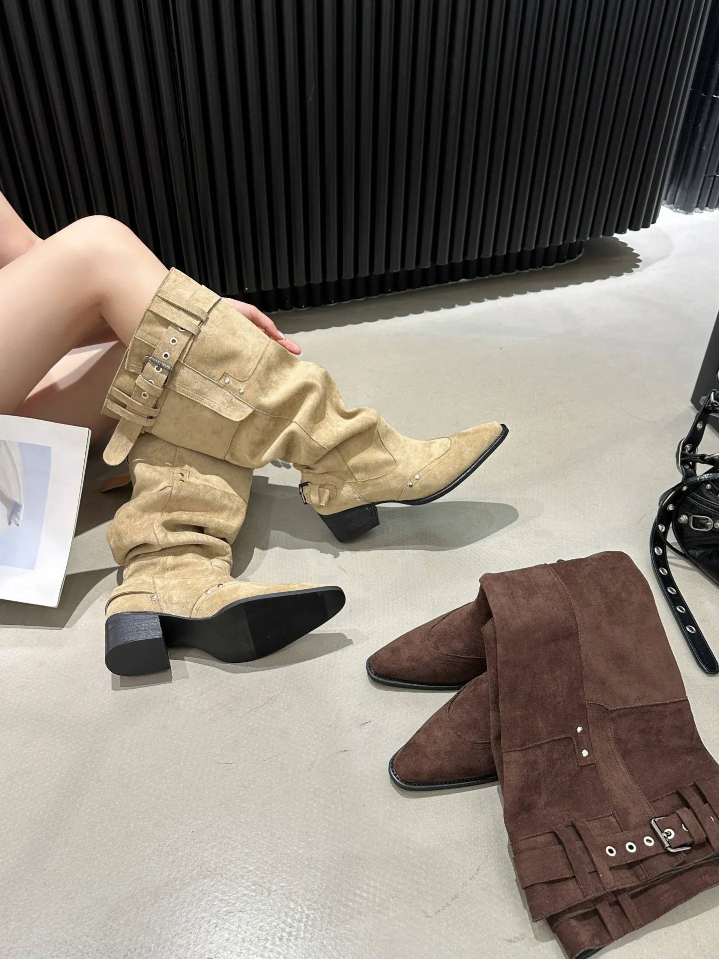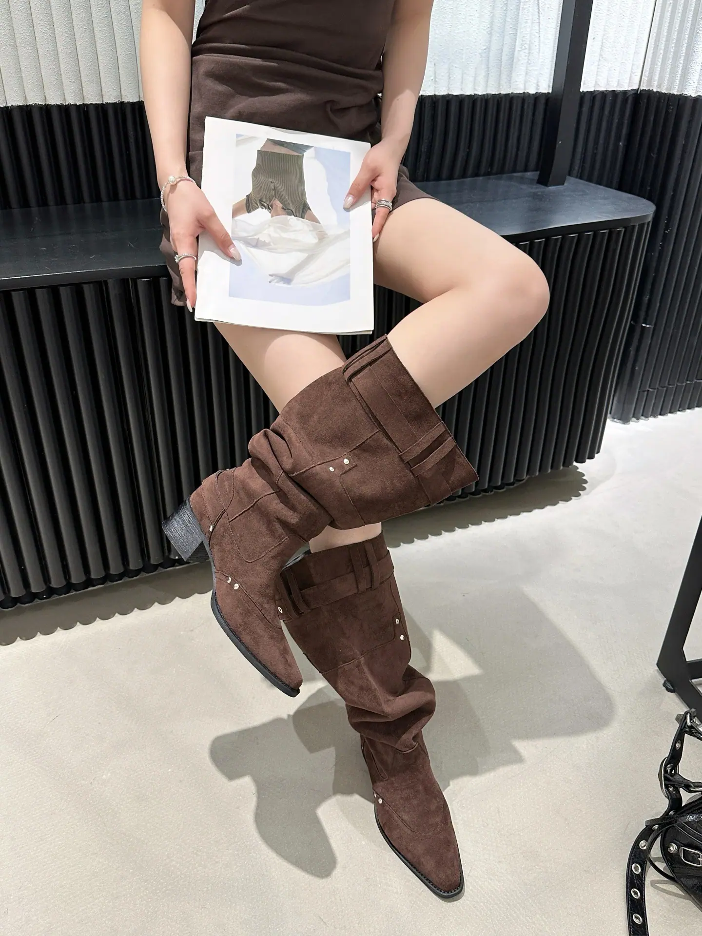 Botas Largas de Gamuza Holgadas de Tacón Alto con Punta para Mujer Botas 2025 Otoño/Invierno Vaqueras Occidentales Sobre la Rodilla Adelgazantes Tipo Jinete