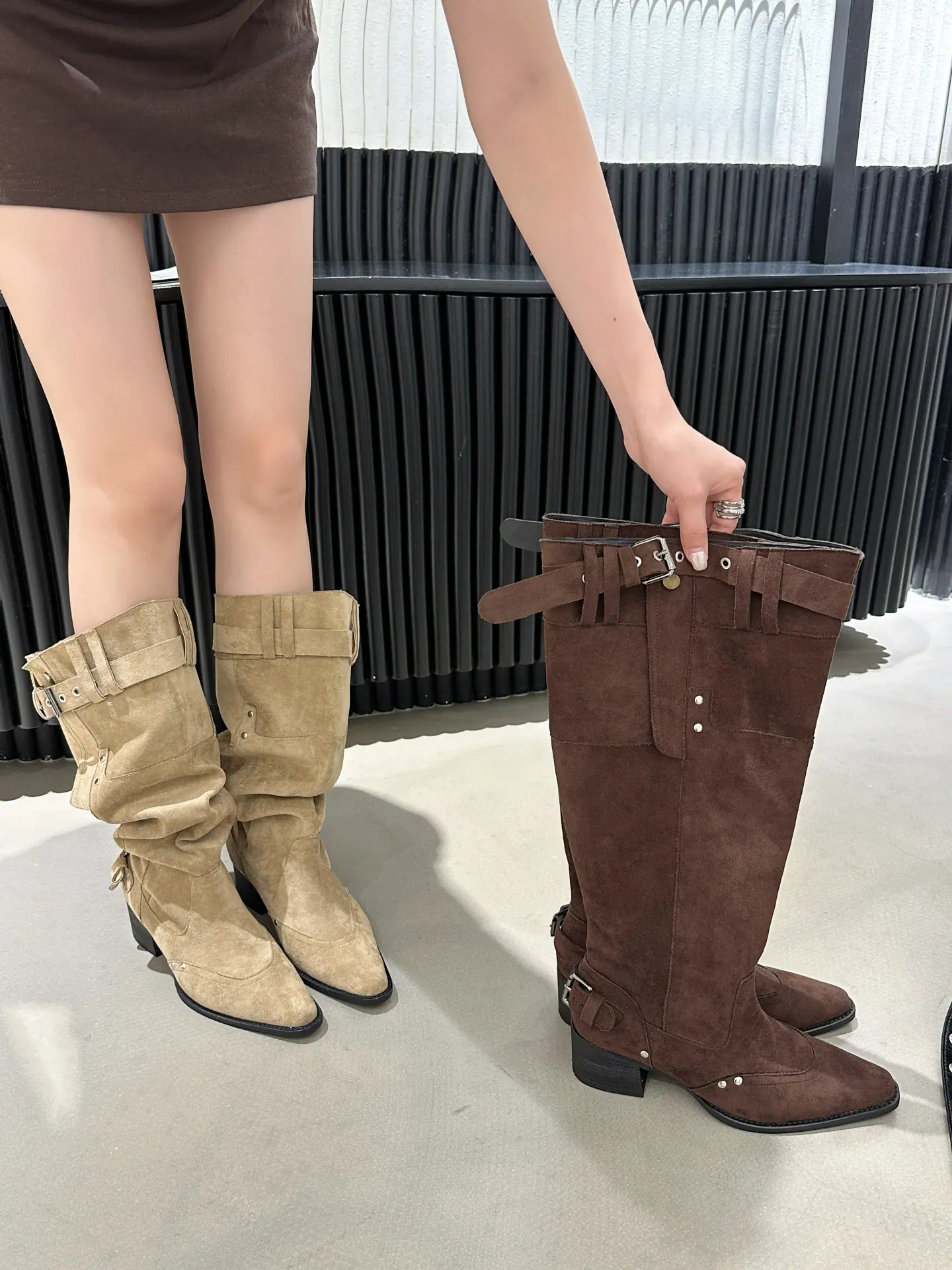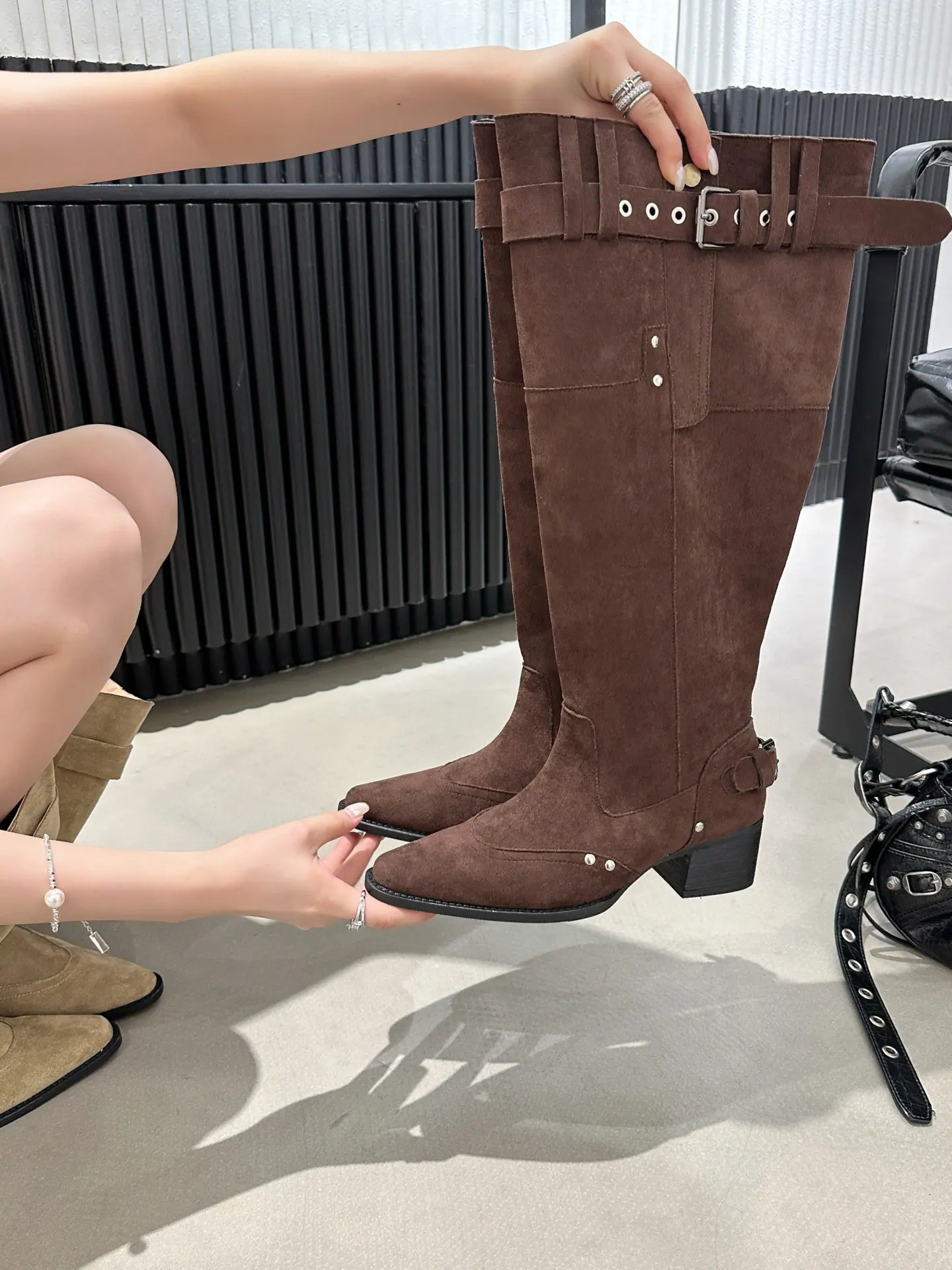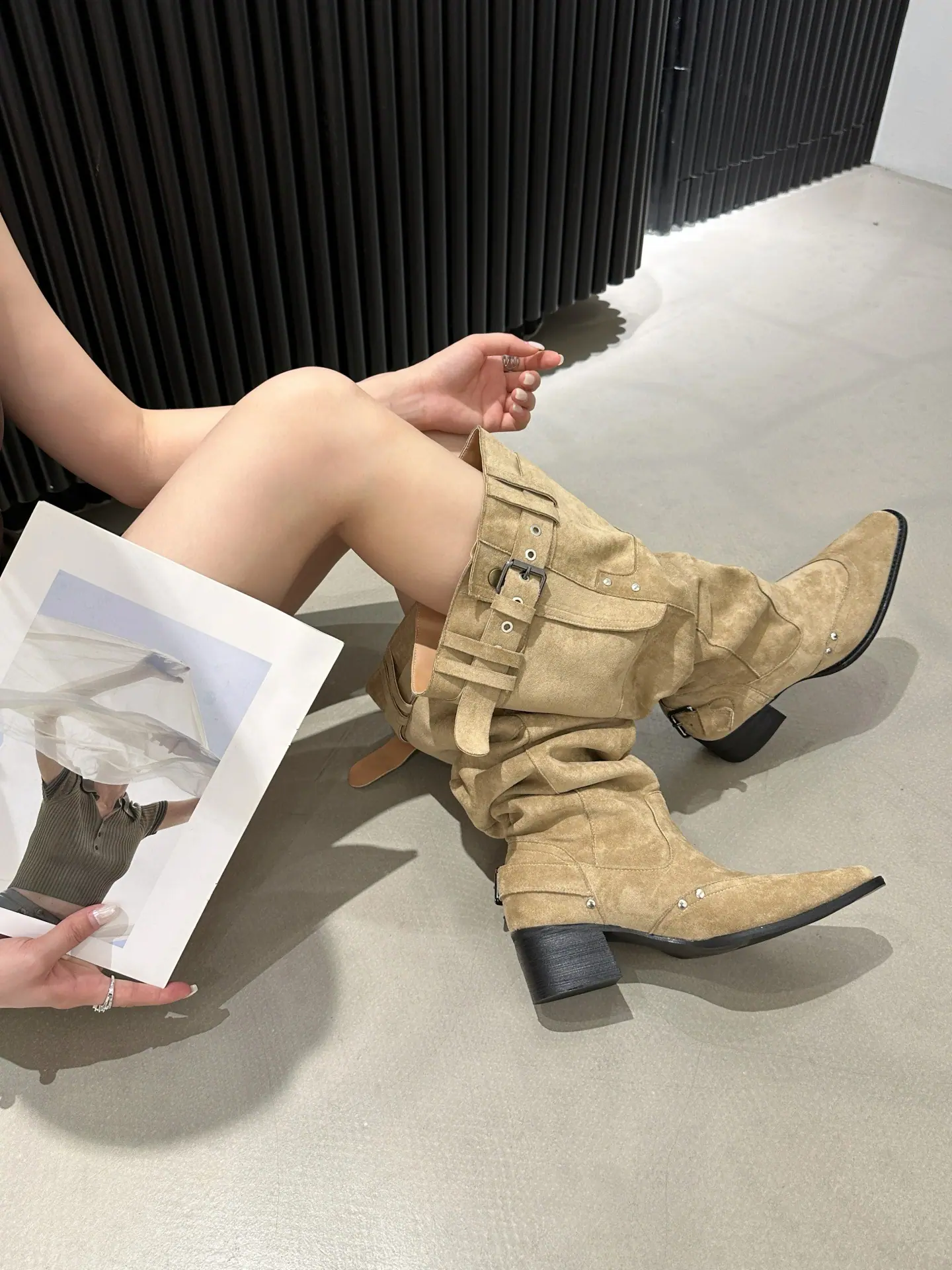 Botas Largas de Gamuza Holgadas de Tacón Alto con Punta para Mujer Botas 2025 Otoño/Invierno Vaqueras Occidentales Sobre la Rodilla Adelgazantes Tipo Jinete