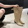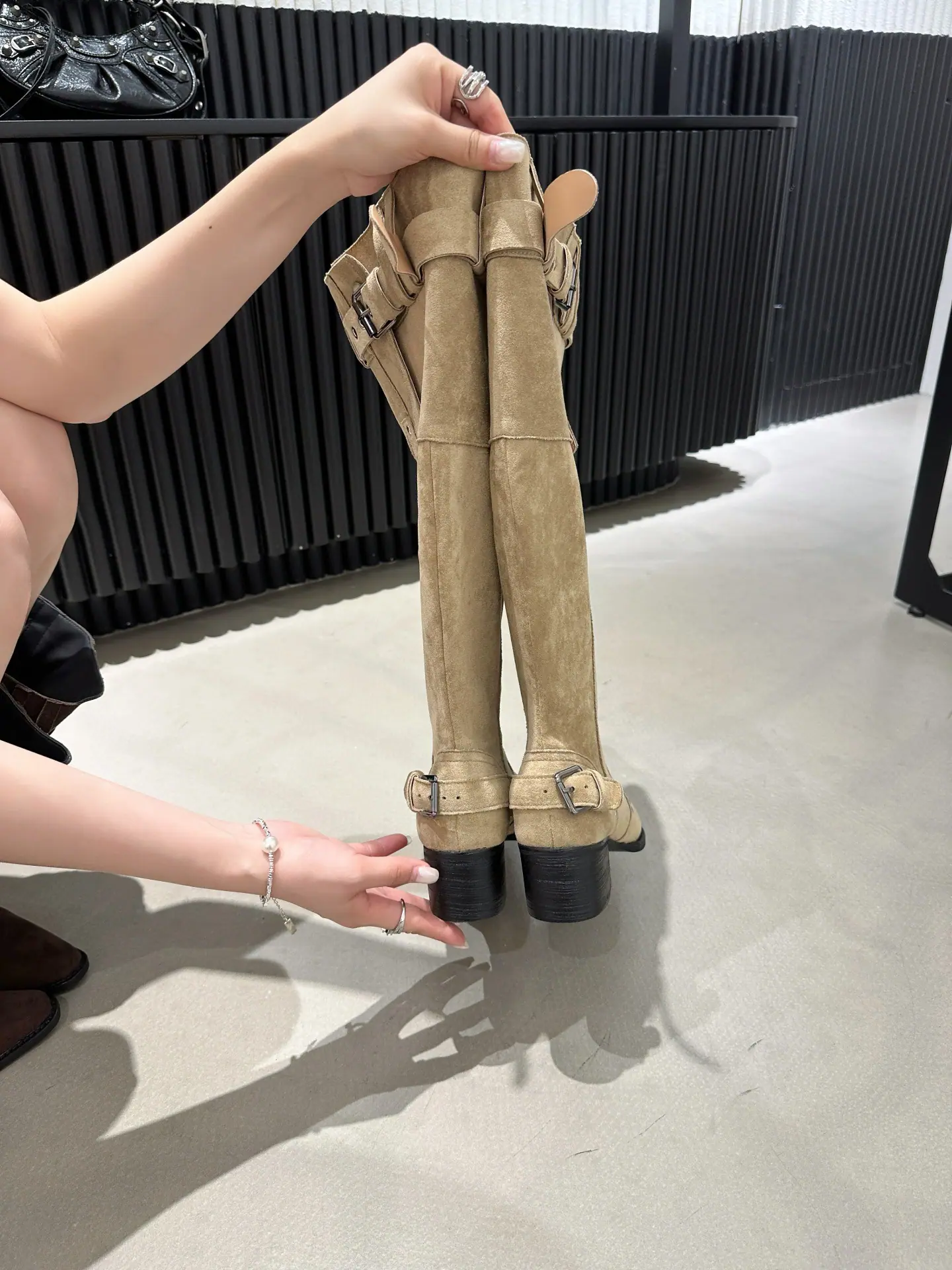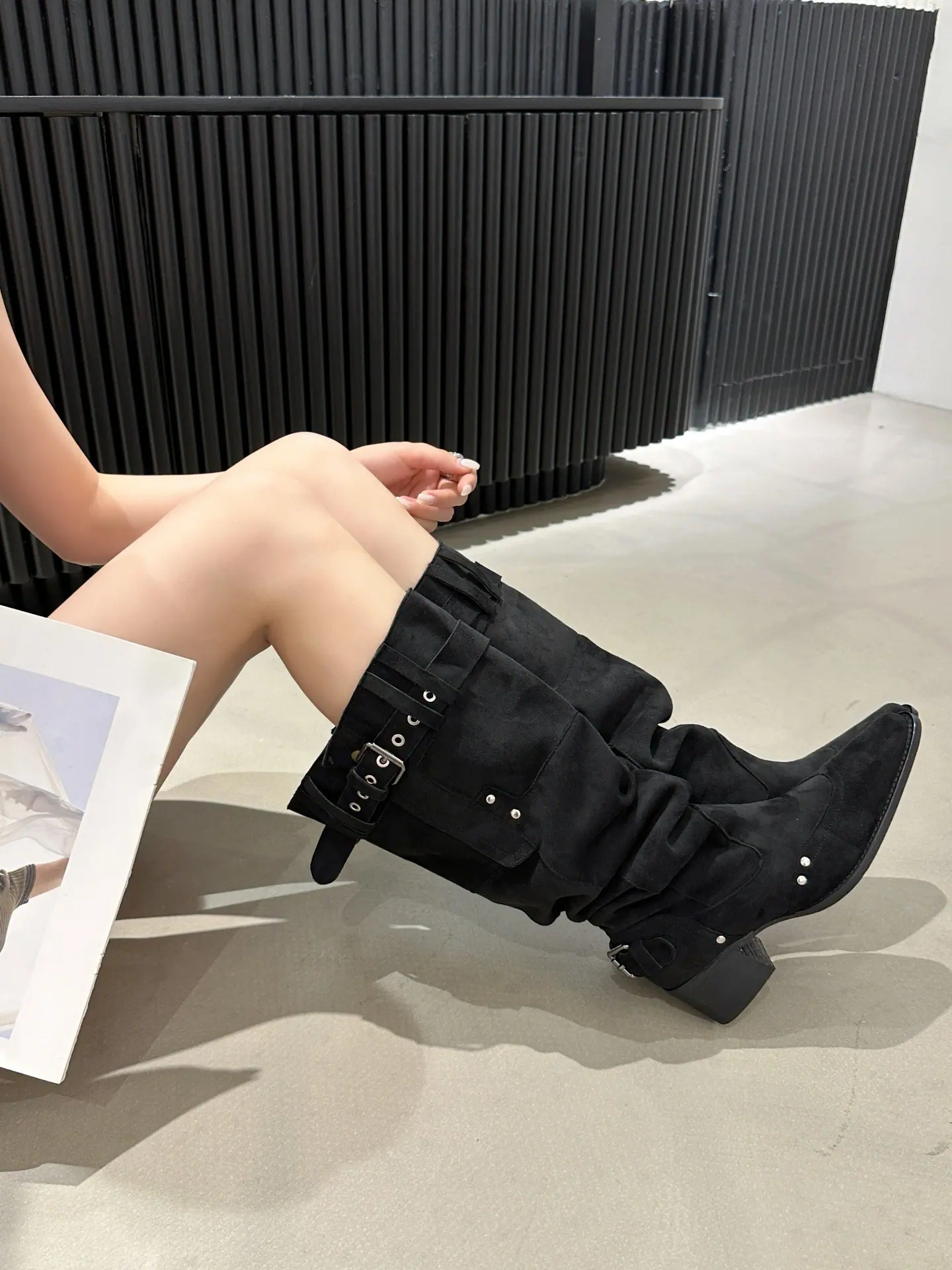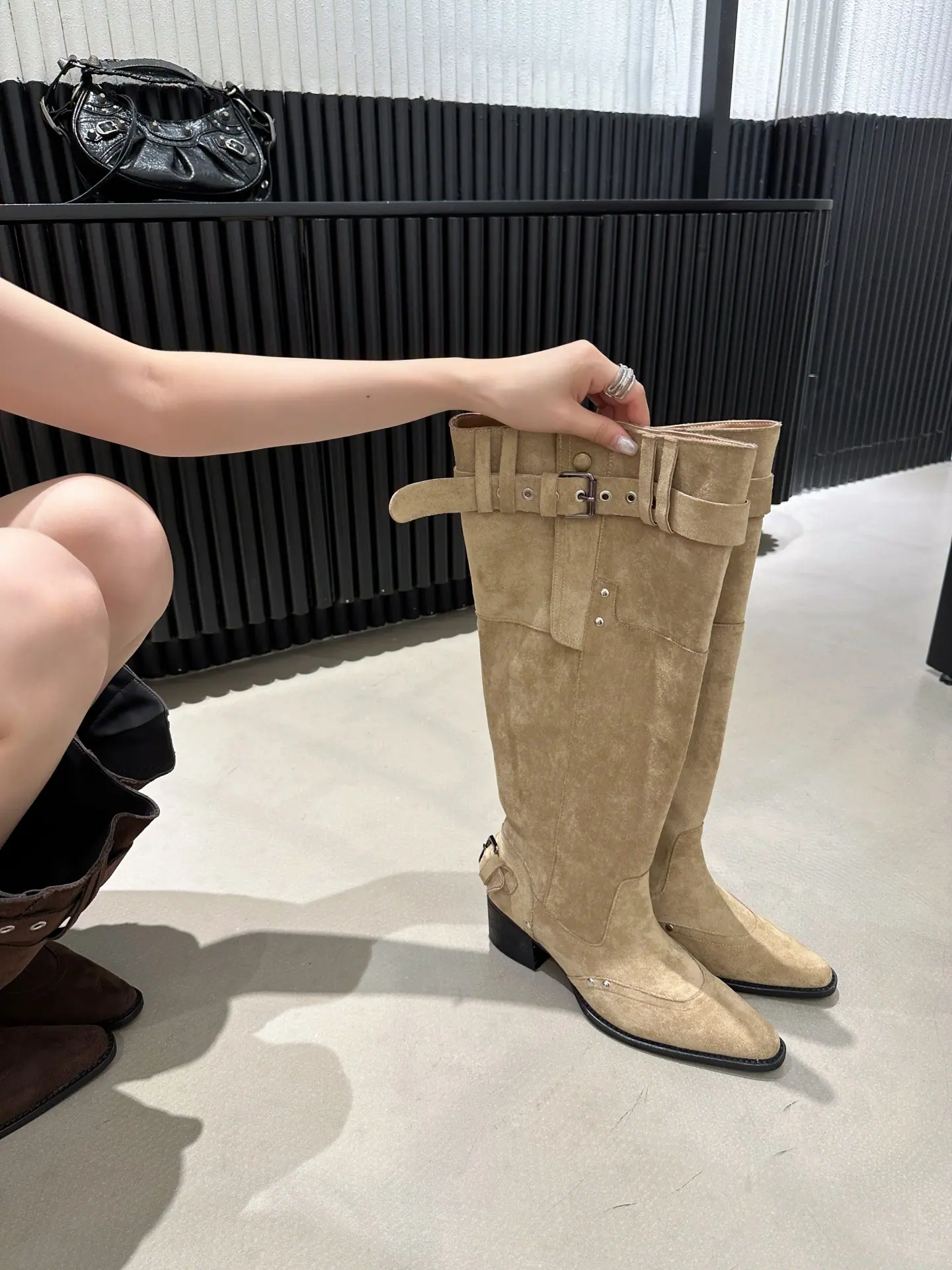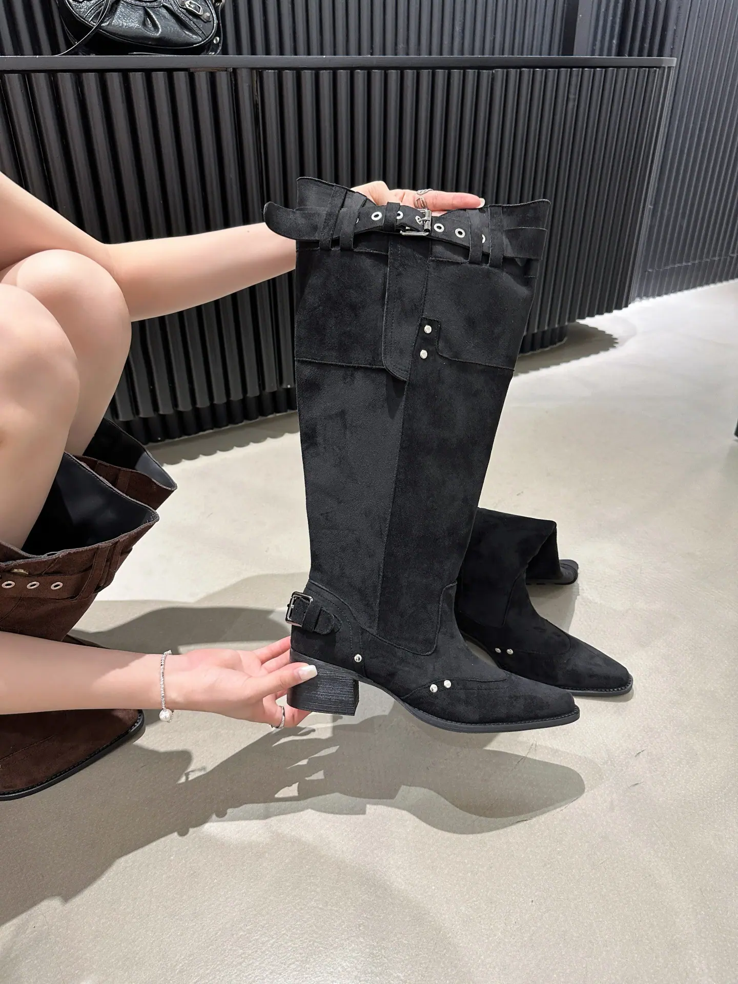 Botas Largas de Gamuza Holgadas de Tacón Alto con Punta para Mujer Botas 2025 Otoño/Invierno Vaqueras Occidentales Sobre la Rodilla Adelgazantes Tipo Jinete