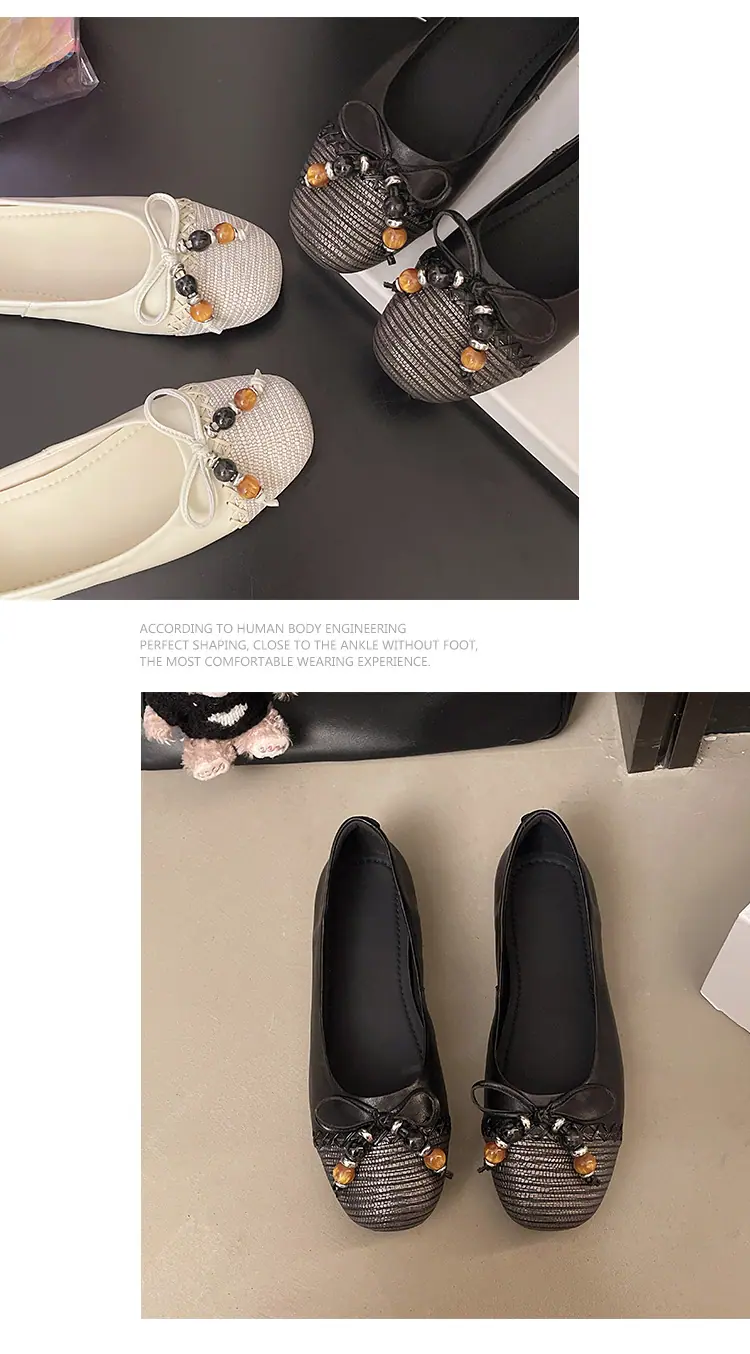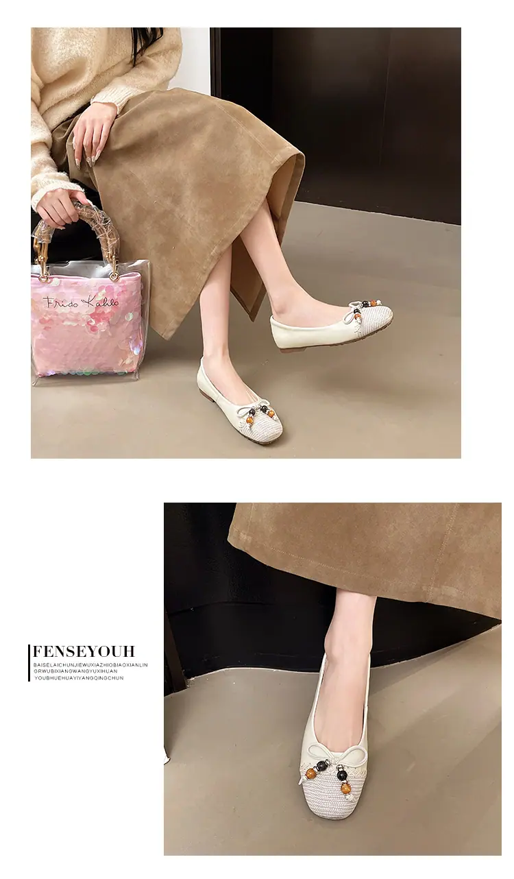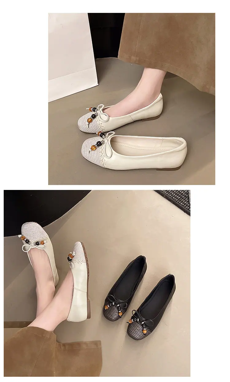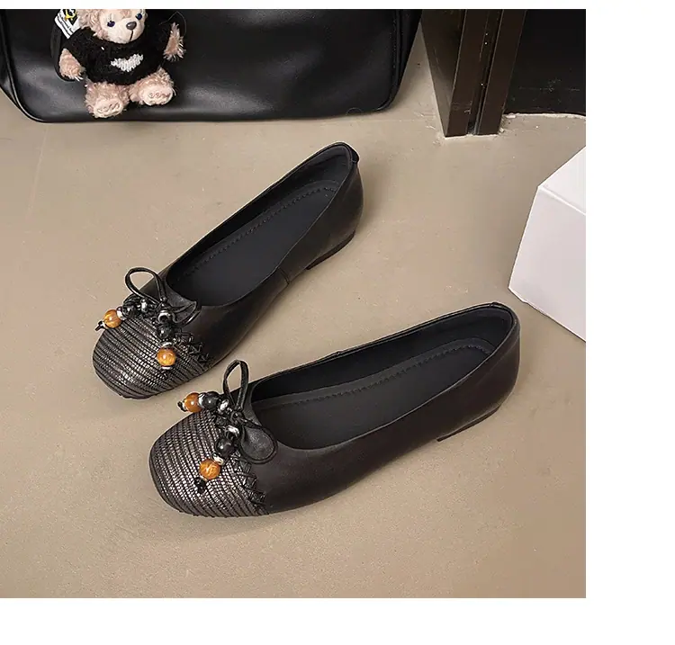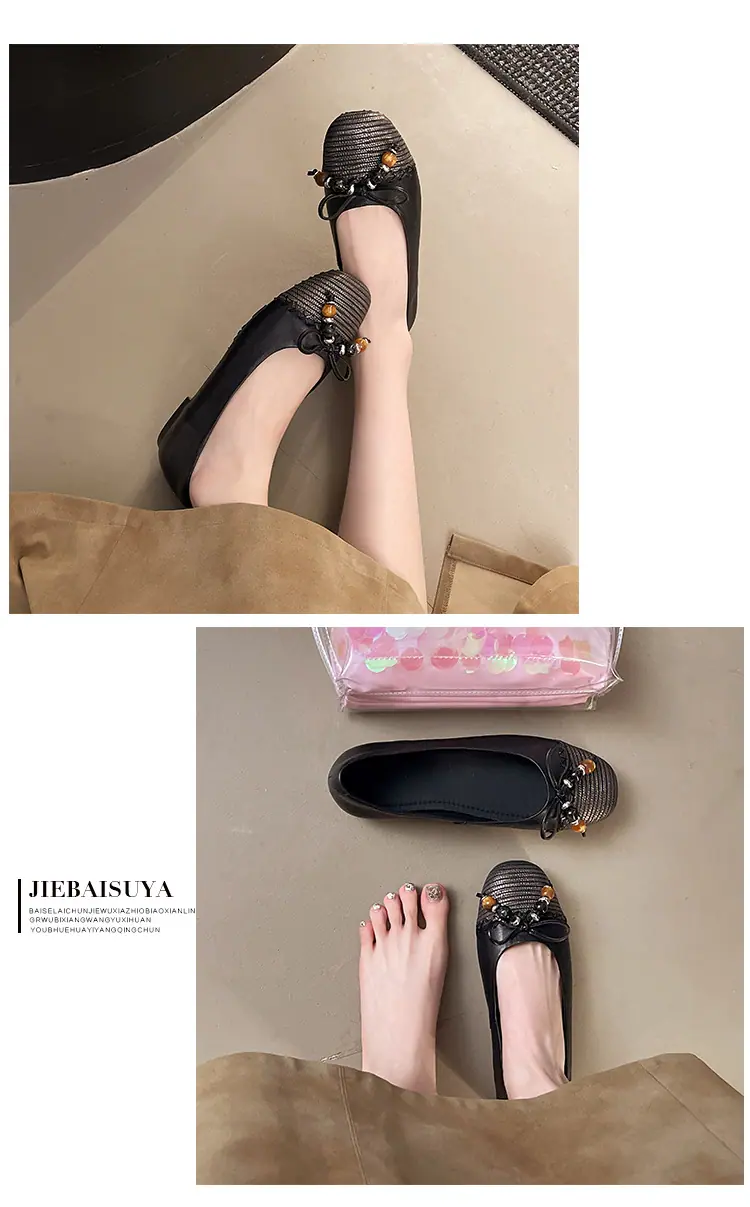 Zapatos Individuales de Corte Bajo de Piel de Vacuno de Capa Superior para Mujer 2025 Otoño Nuevos Cuero Genuino Lazo Cuentas Punta Redonda Cuero Plano Zapatos de Abuelita