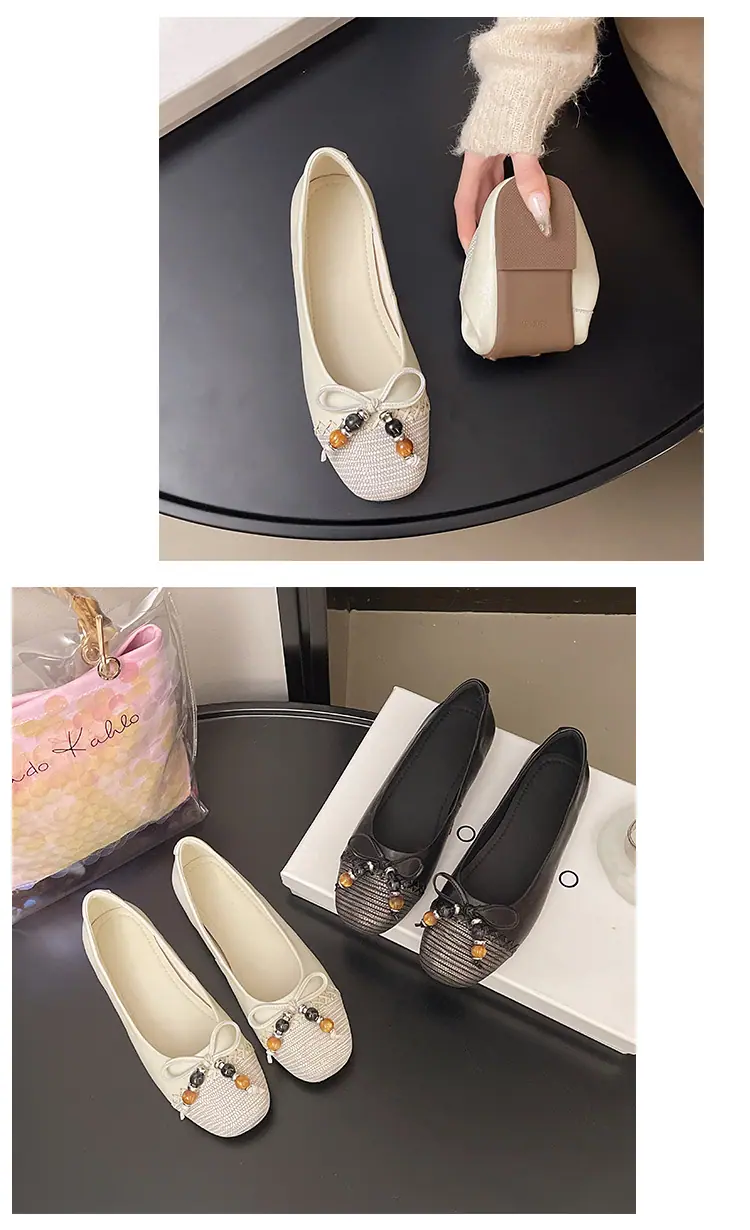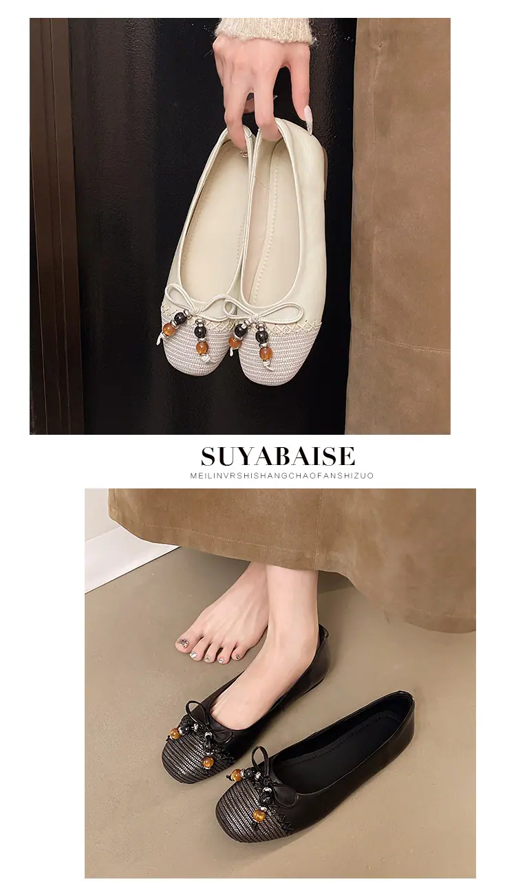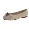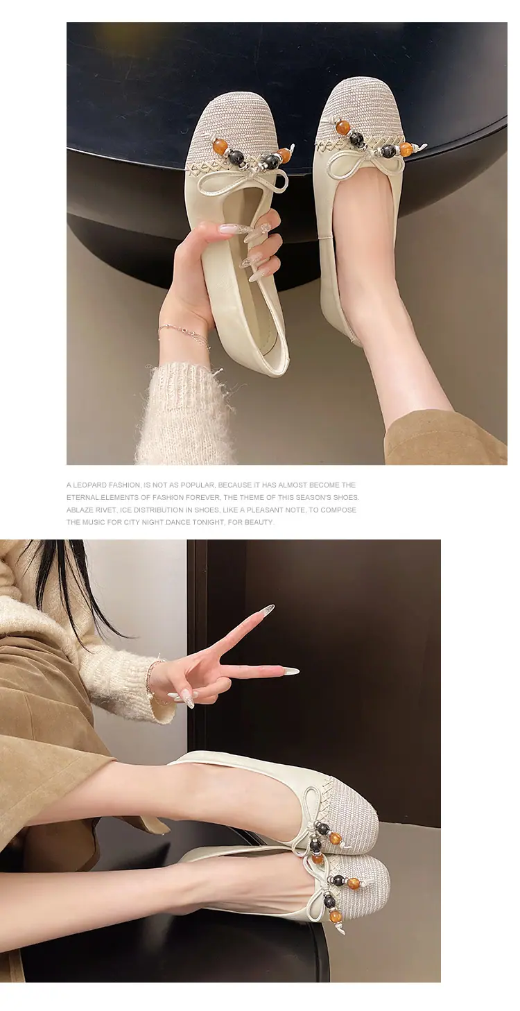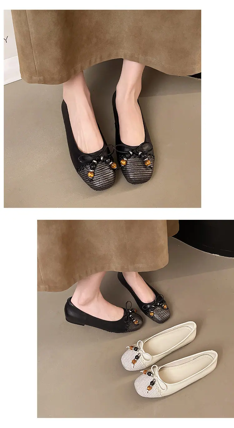 Zapatos Individuales de Corte Bajo de Piel de Vacuno de Capa Superior para Mujer 2025 Otoño Nuevos Cuero Genuino Lazo Cuentas Punta Redonda Cuero Plano Zapatos de Abuelita