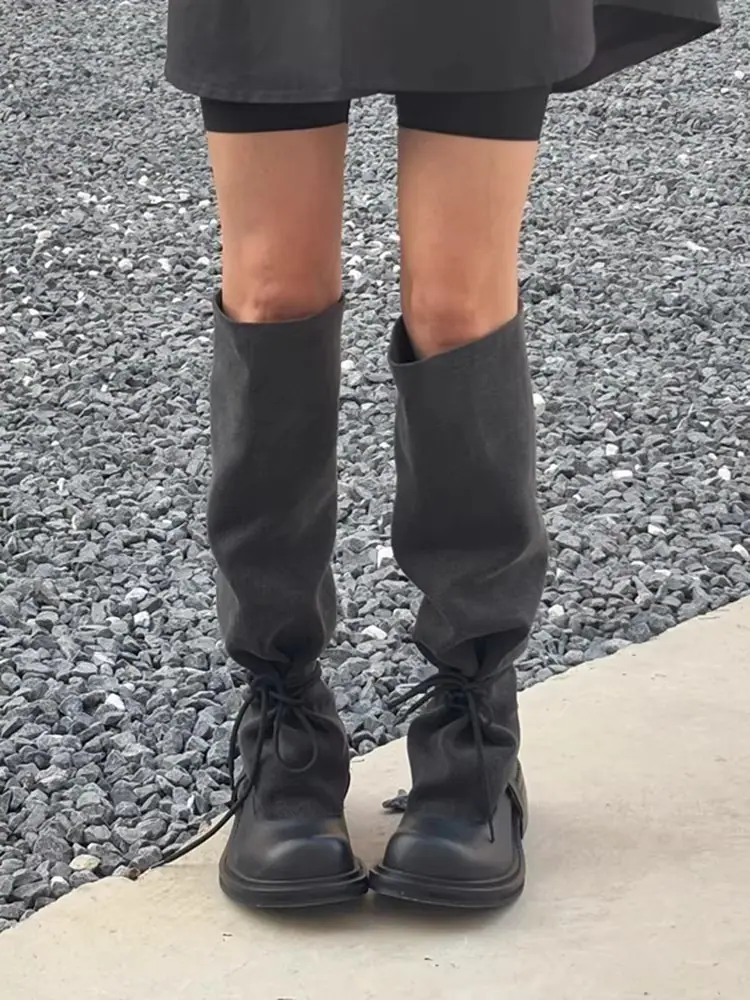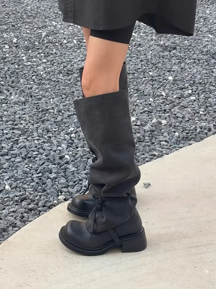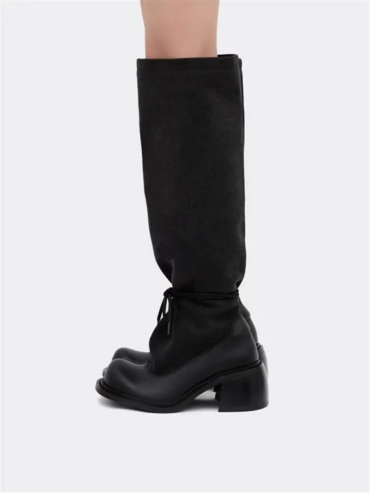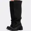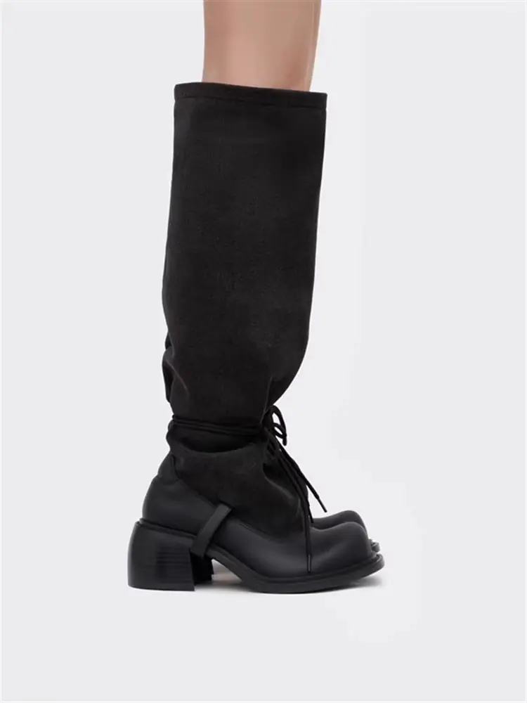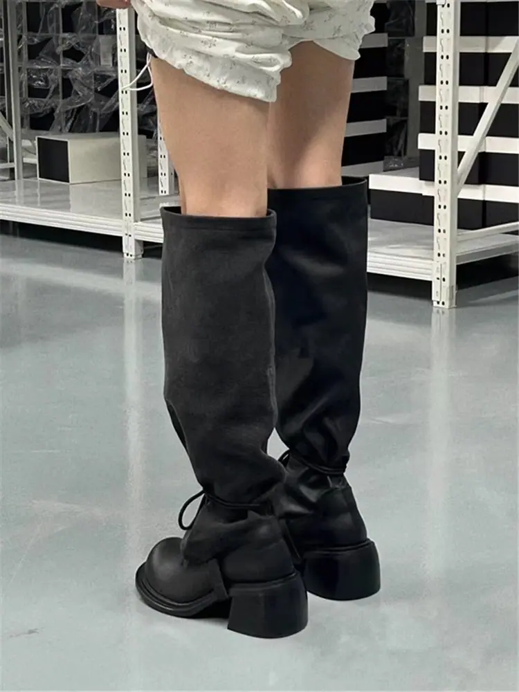 Botas de tacón alto grueso de nicho estilo páramo para mujer 2025 nuevas botas negras adelgazantes con cordones botas mosqueteras hasta la rodilla botas de moda de caballero