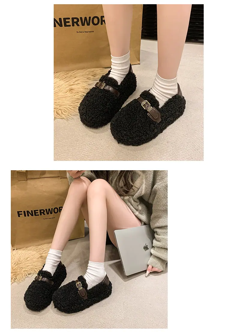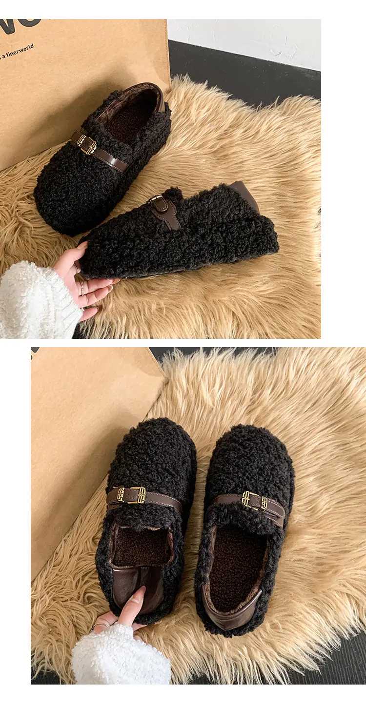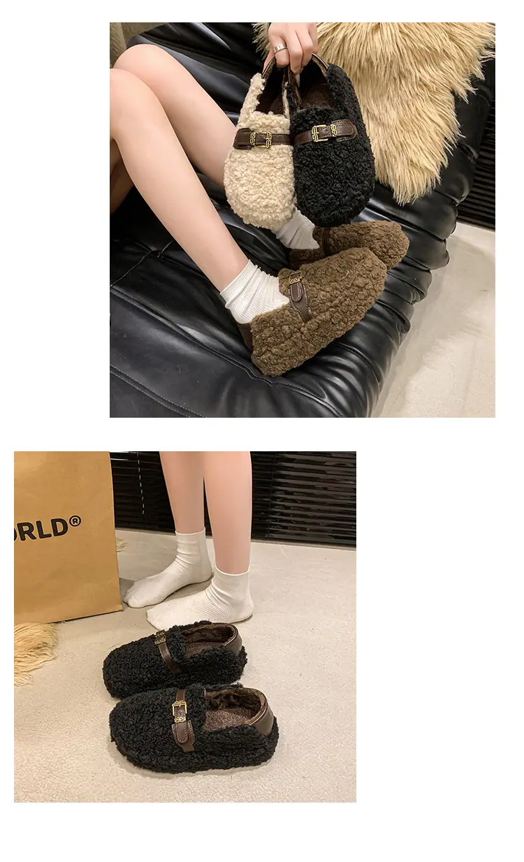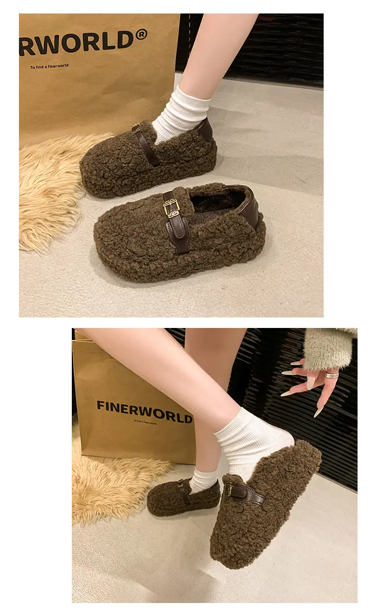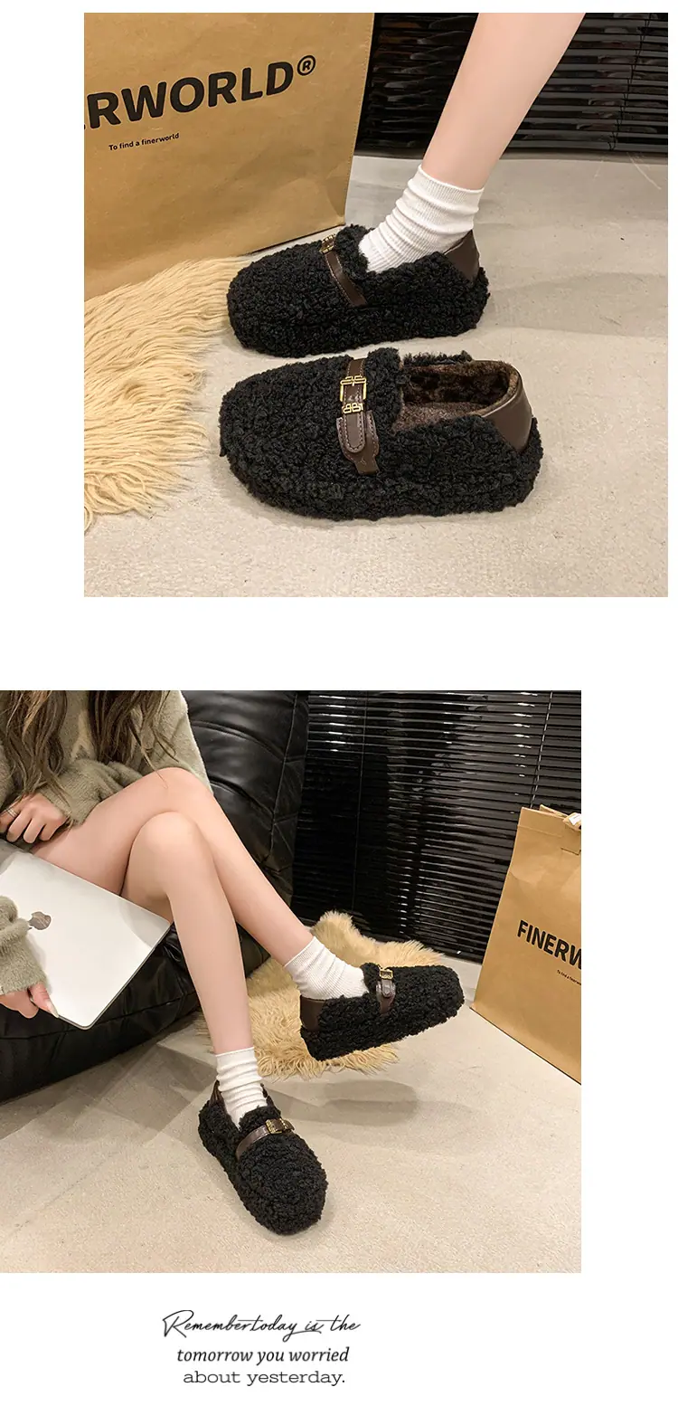 Pantuflas Peludas Retro de Suela Gruesa para Mujer Ropa de Exterior 2025 Otoño/Invierno Estilo Coreano Cómodas Pantuflas de Pelo Rizado de Una Tira Pantuflas de Algodón Zapatos de Mujer