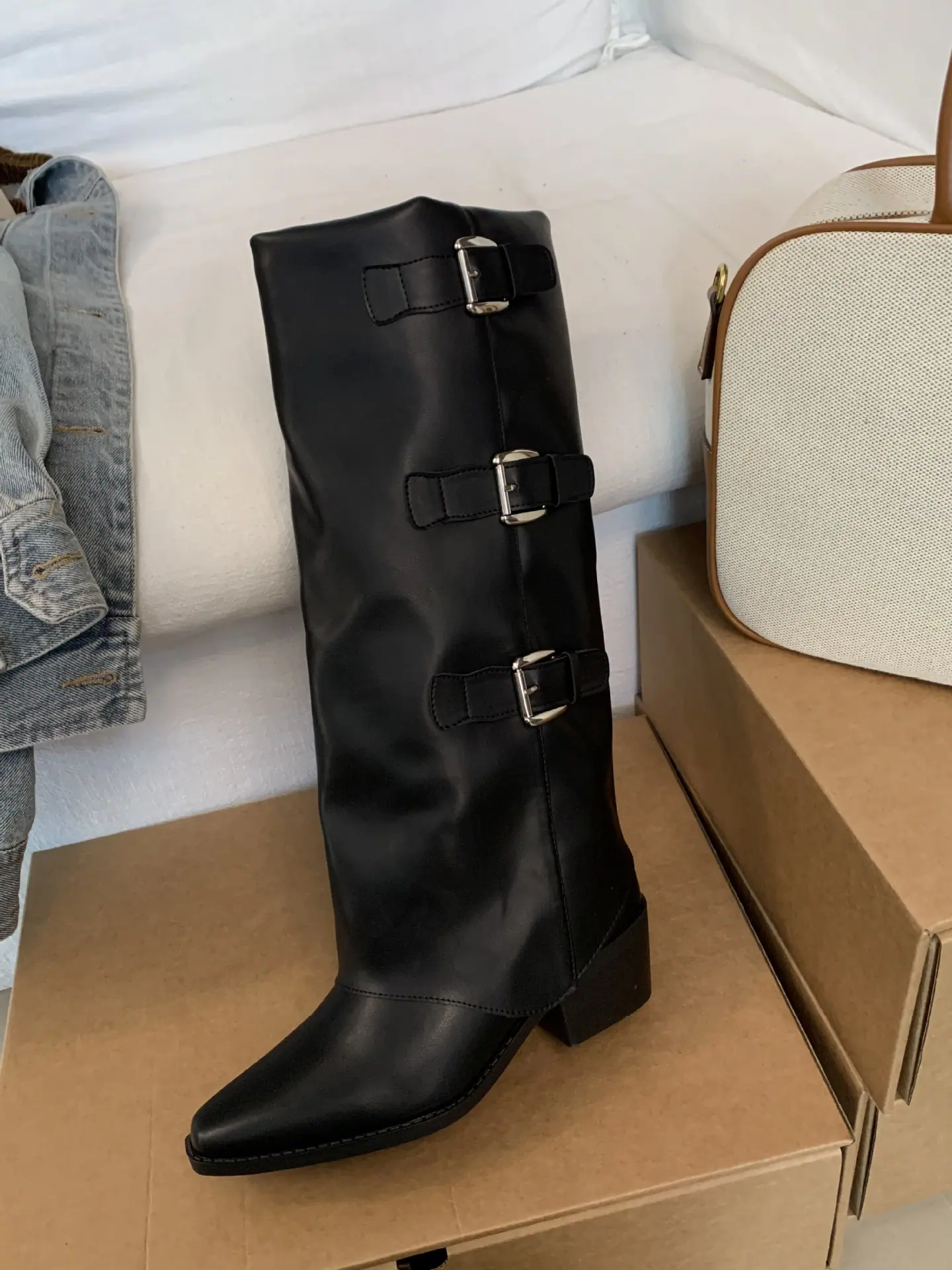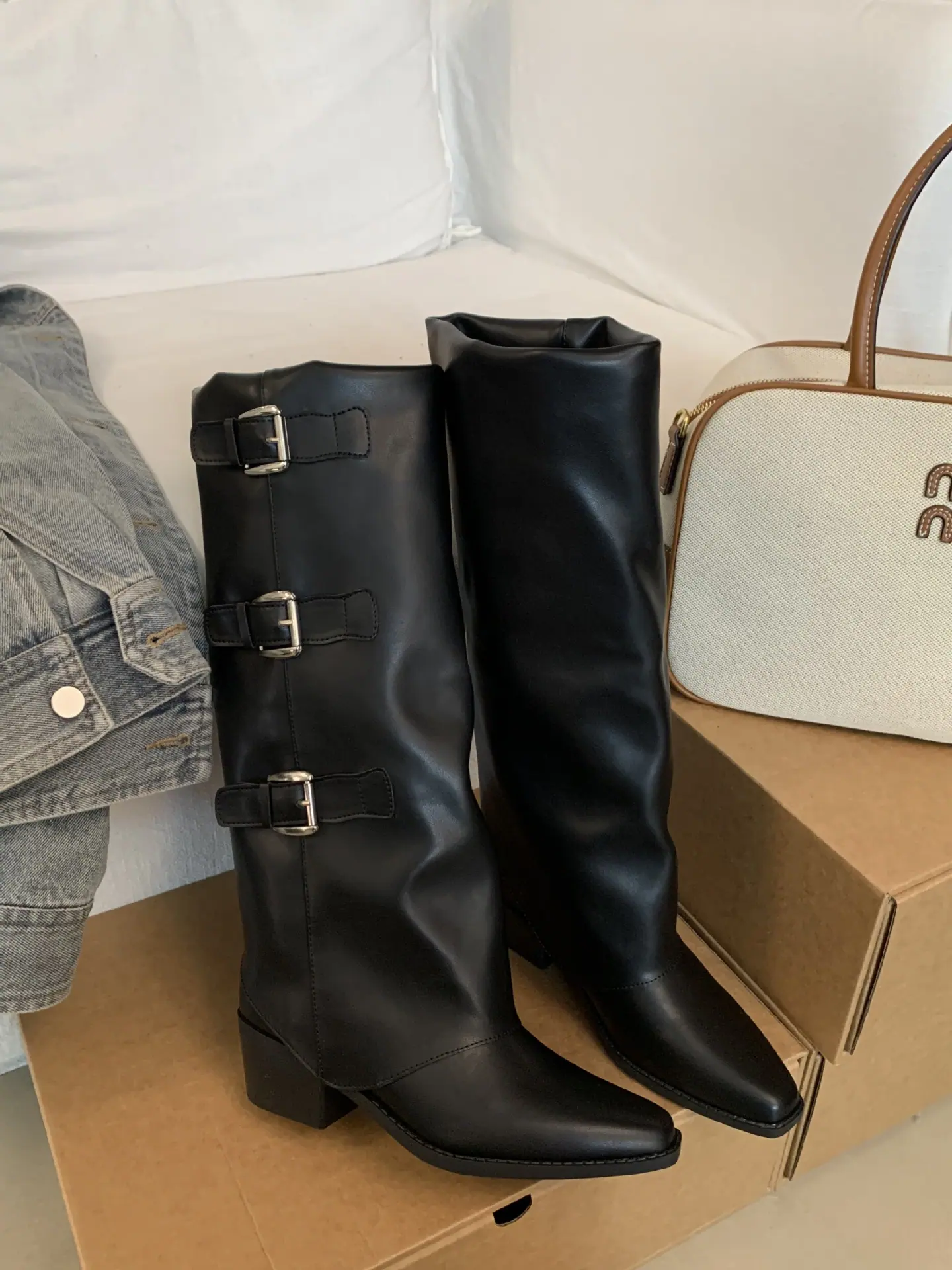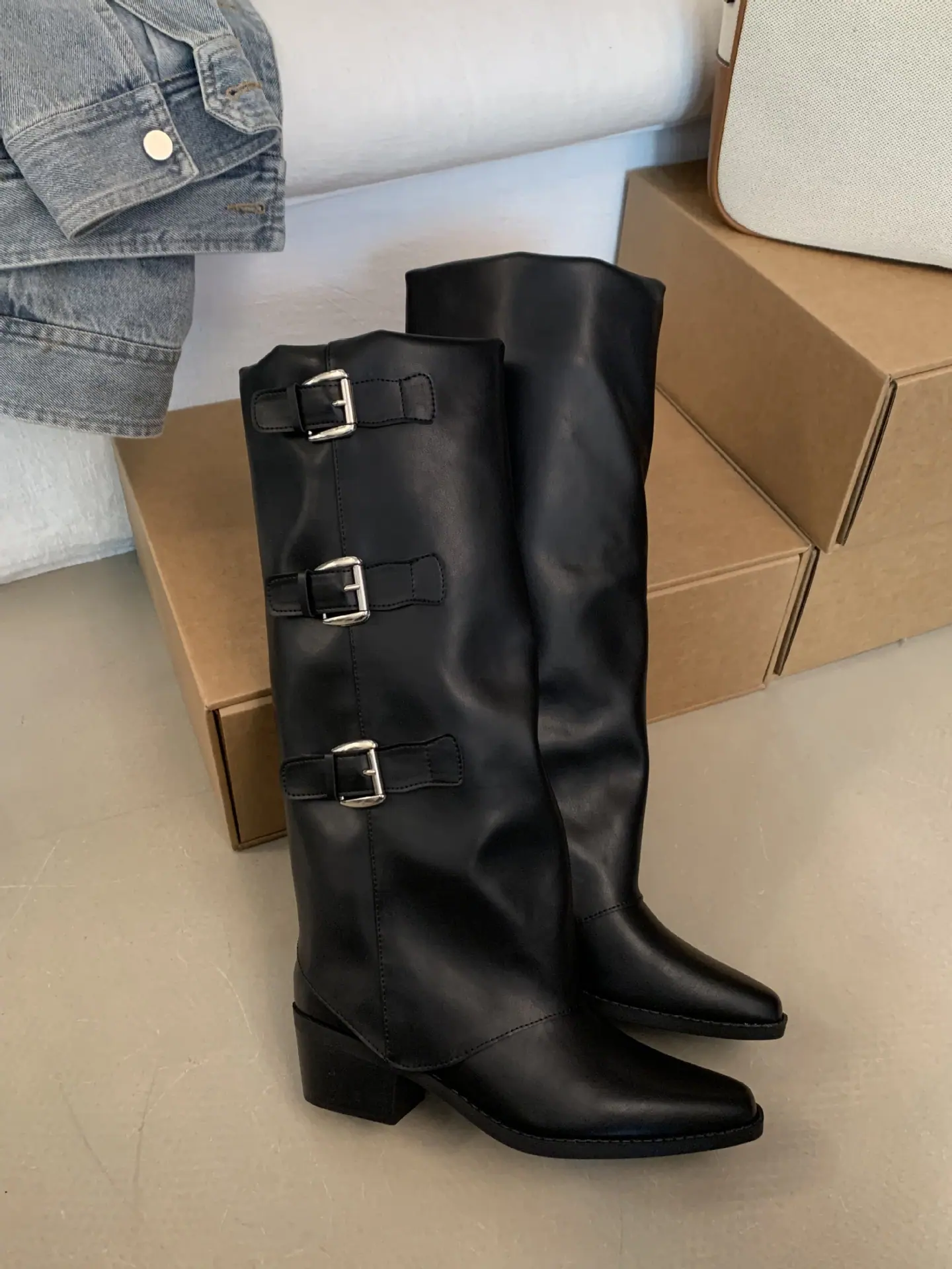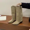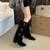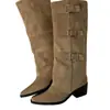 Botas retro de punta afilada con patchwork y tacón grueso hasta la rodilla para mujer 2025 nuevo otoño e invierno versátiles botas de moda sin cordones