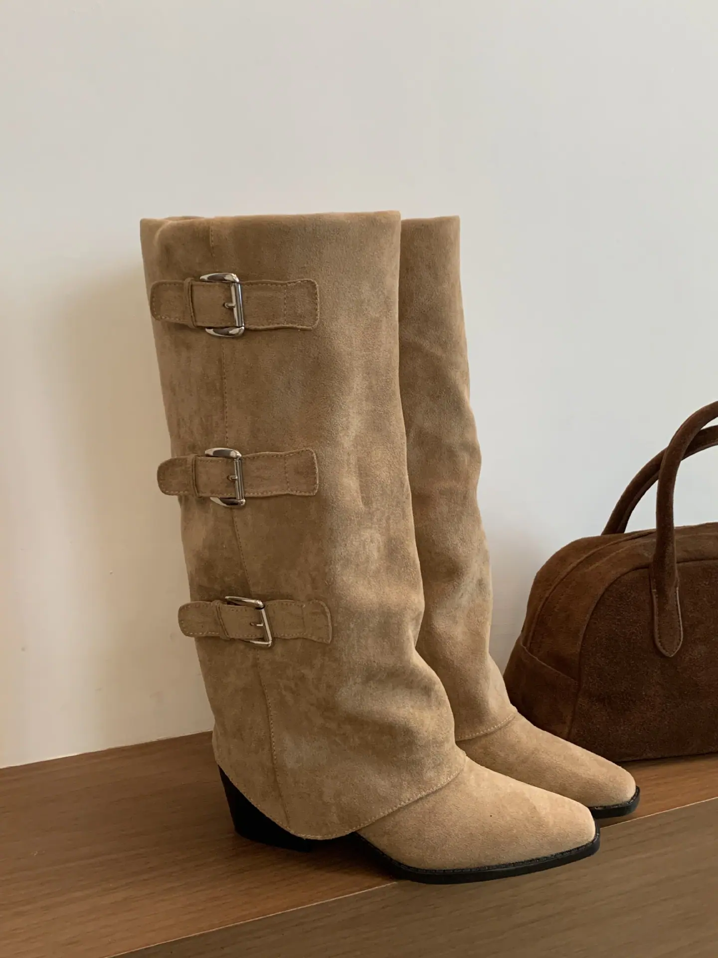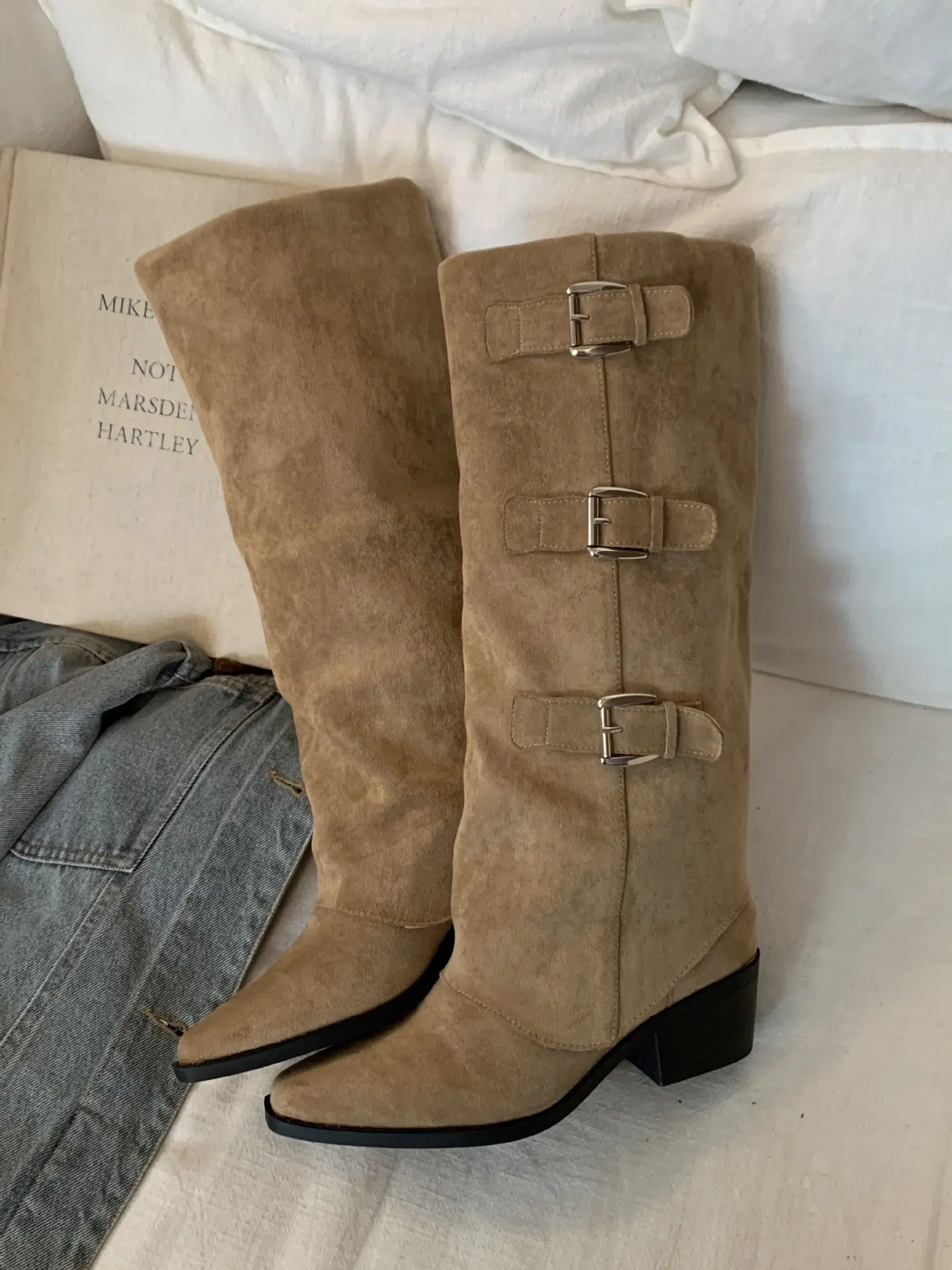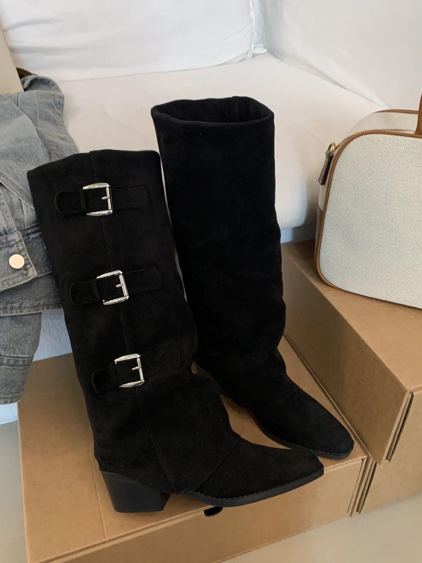Botas retro de punta afilada con patchwork y tacón grueso hasta la rodilla para mujer 2025 nuevo otoño e invierno versátiles botas de moda sin cordones