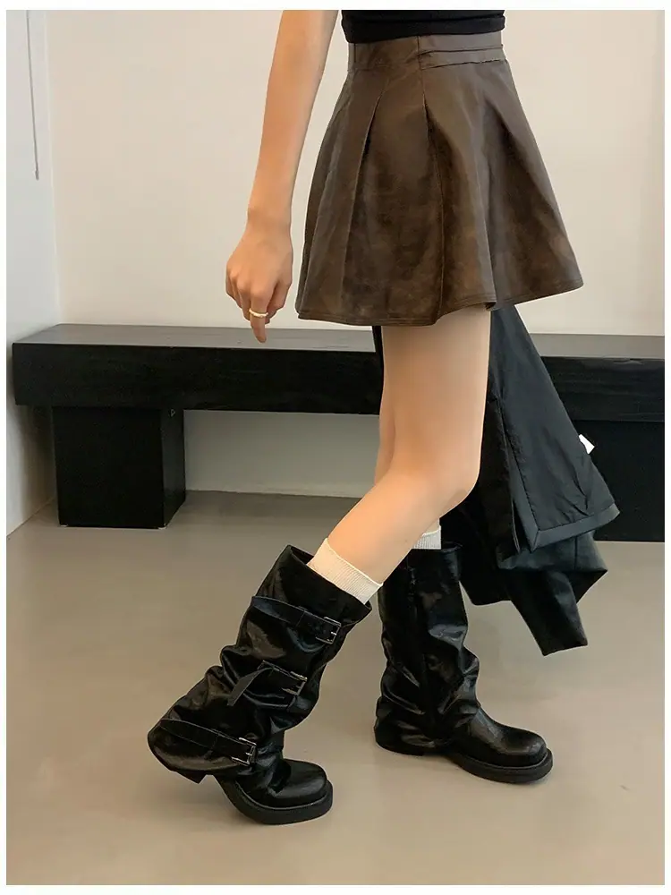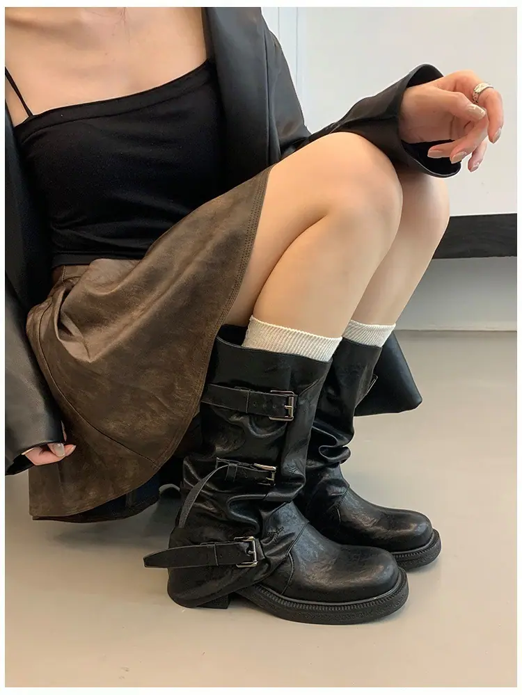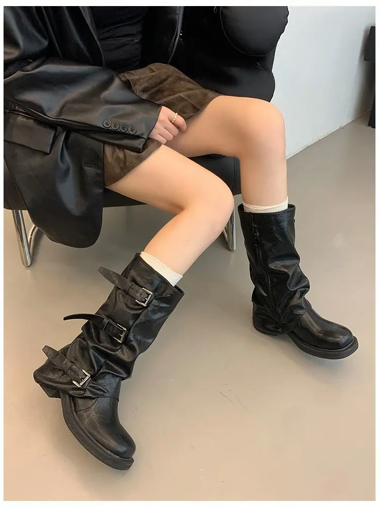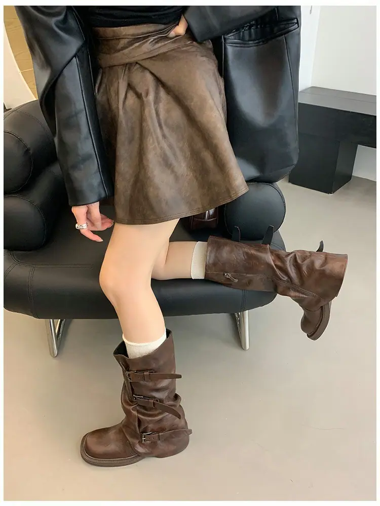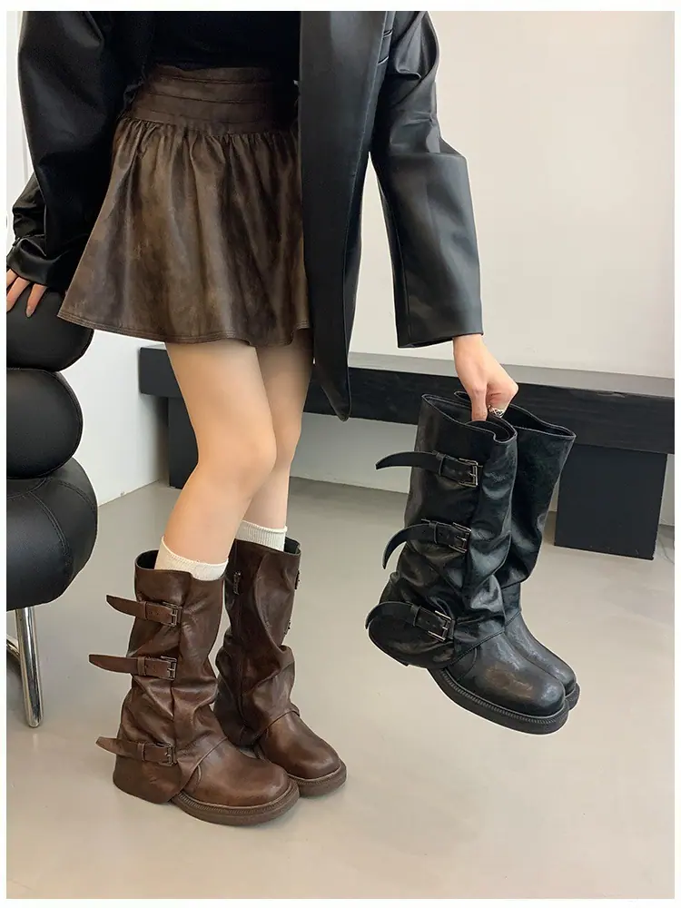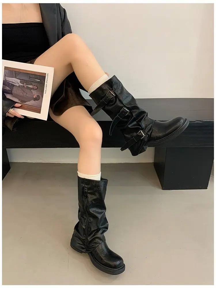Botas Retro de Caña Alta con Suela Gruesa para Mujer 2025 Otoño/Invierno Nuevo Diseño Nicho Botas Largas Fruncidas Apiladas Botas Largas