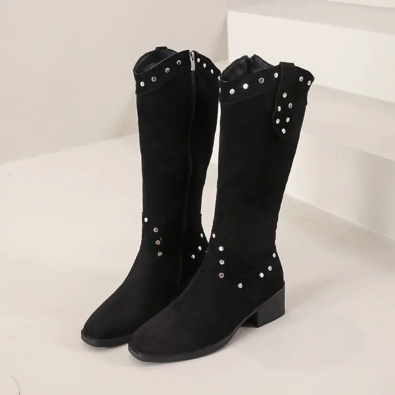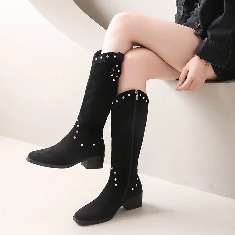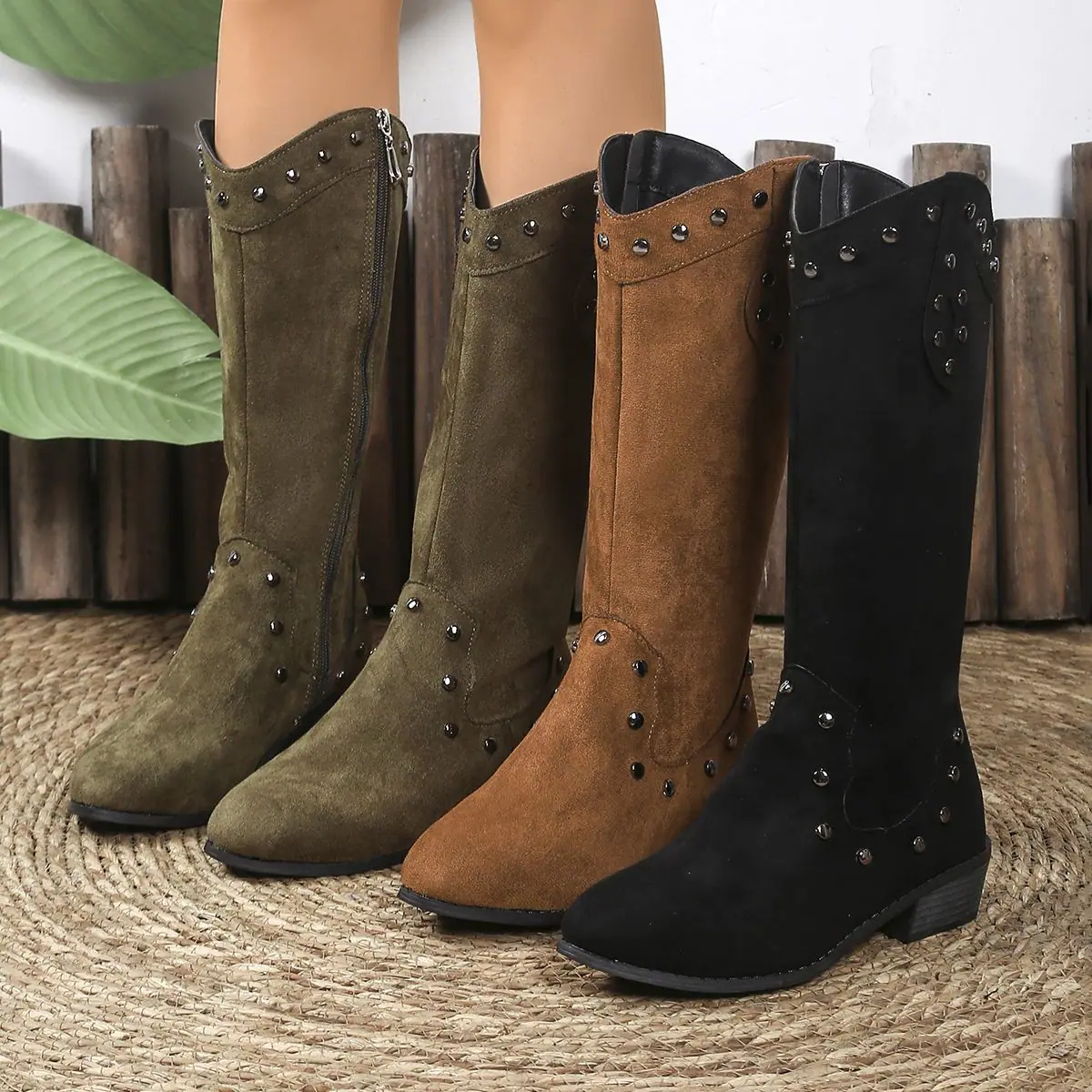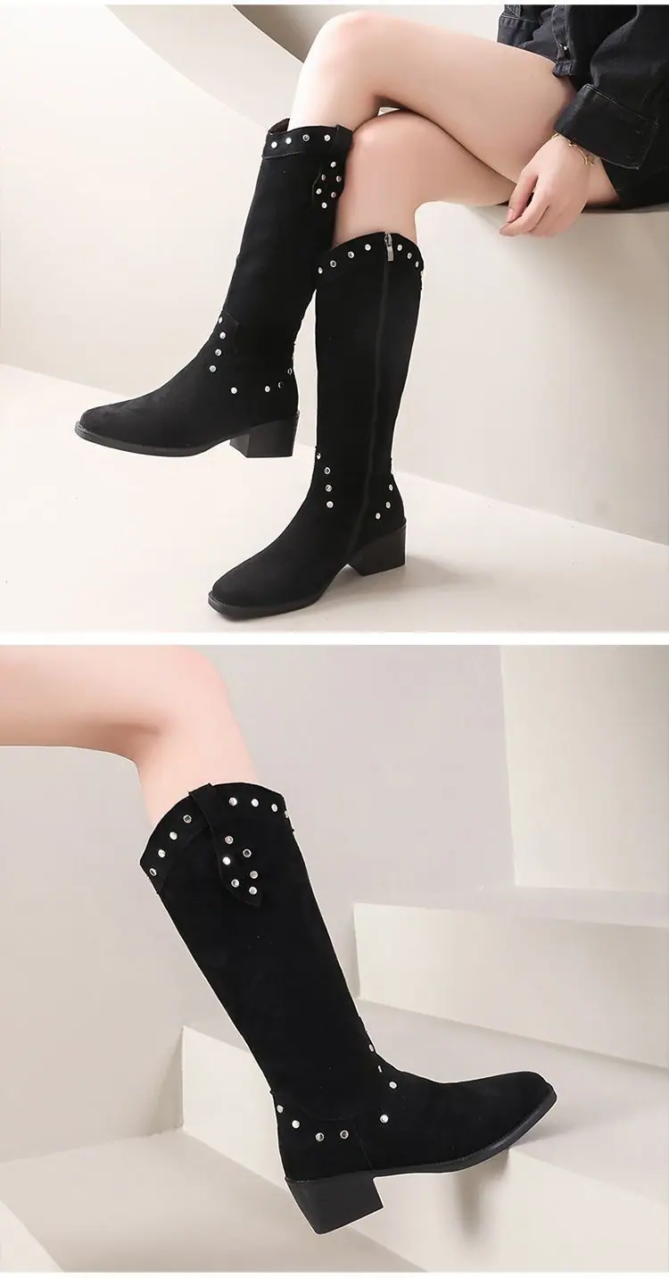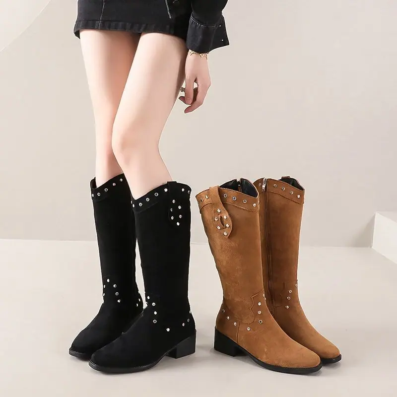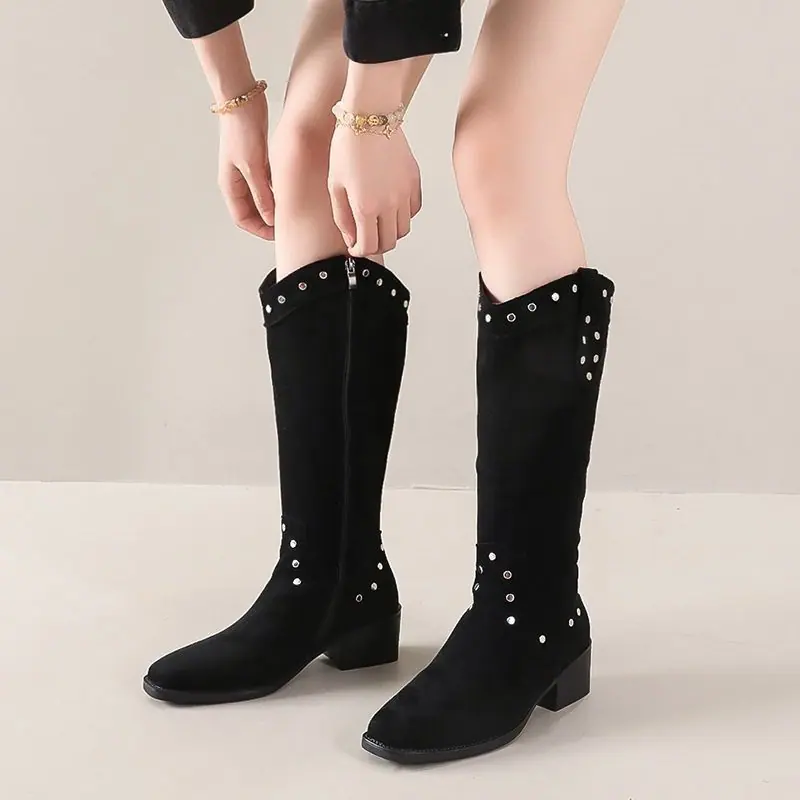Botas de caña alta de punta redonda con tacón grueso y cremallera lateral para mujer, modernas y versátiles, nuevas para otoño e invierno 2025, retro, cómodas, para mujer