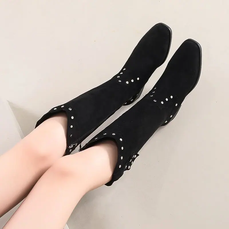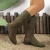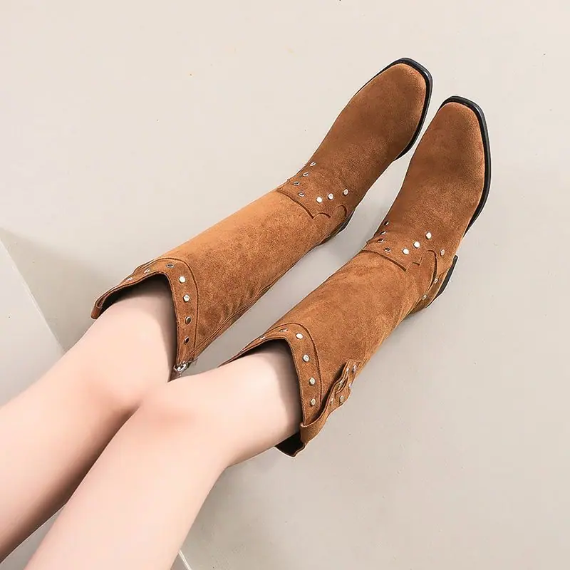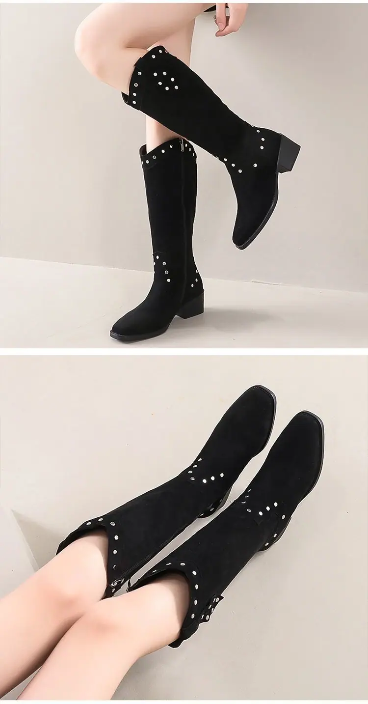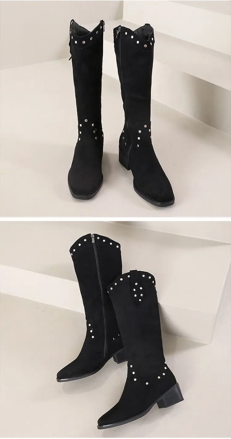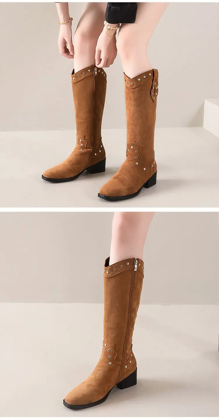 Botas de caña alta de punta redonda con tacón grueso y cremallera lateral para mujer, modernas y versátiles, nuevas para otoño e invierno 2025, retro, cómodas, para mujer