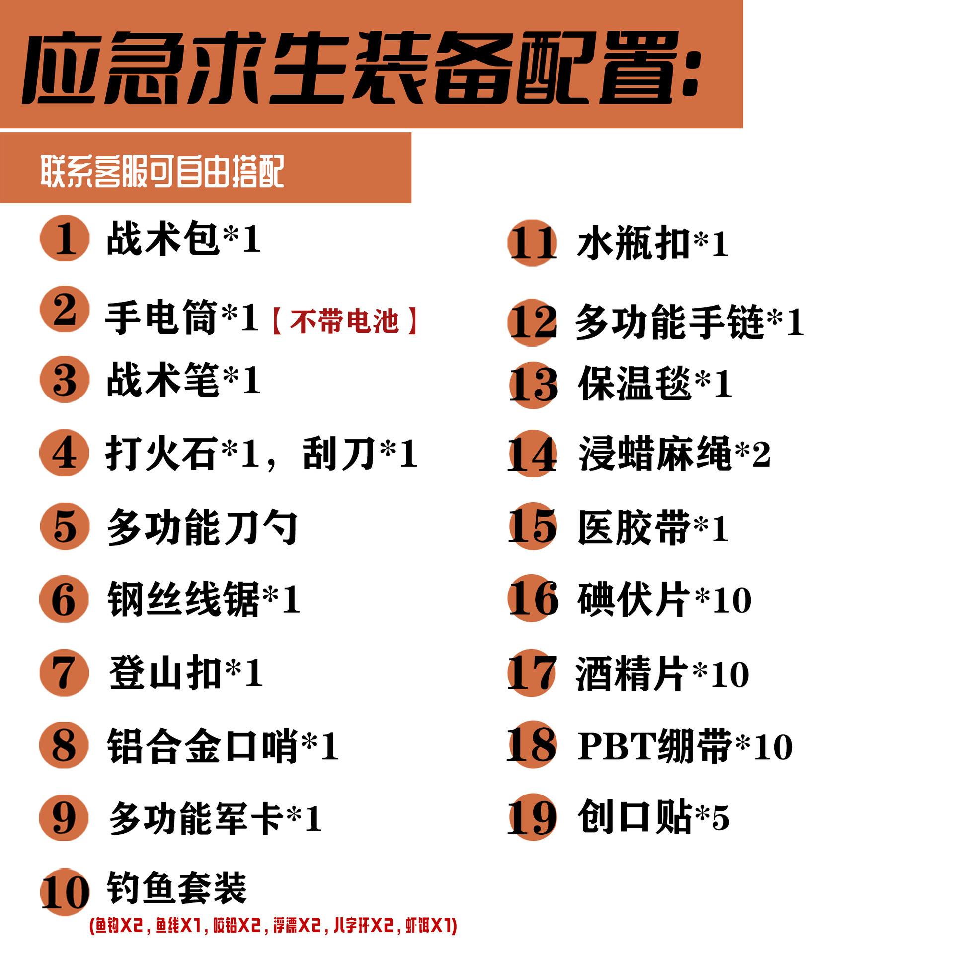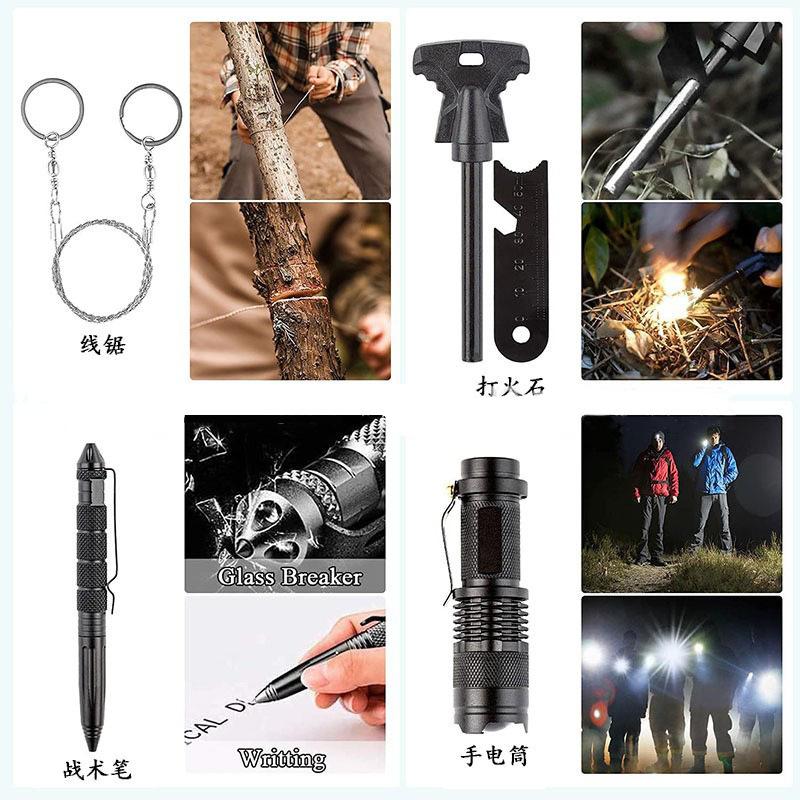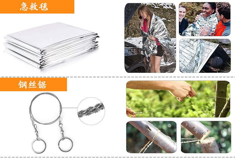 Uso del producto: La frecuencia de desastres naturales como terremotos, tifones, tsunamis, tornados e inundaciones está aumentando. En caso de desastres naturales, como cortes de agua y electricidad, escasez de alimentos, interrupciones en las comunicaciones y cortes de tráfico, los rescatistas no pueden llegar a tiempo a la zona del desastre. Antes de que lleguen los rescatistas y los suministros de socorro, solo podemos confiar en nosotros mismos para salvarnos a nosotros mismos y a los demás. Esto requiere ciertas herramientas. Hemos lanzado una serie de kits de supervivencia de emergencia de autoayuda. Cada producto tiene múltiples funciones y es fácil de transportar. Se puede usar en casa o al aire libre para acampar y disfrutar de la aventura, y puede satisfacer diversas necesidades en el proceso de supervivencia.