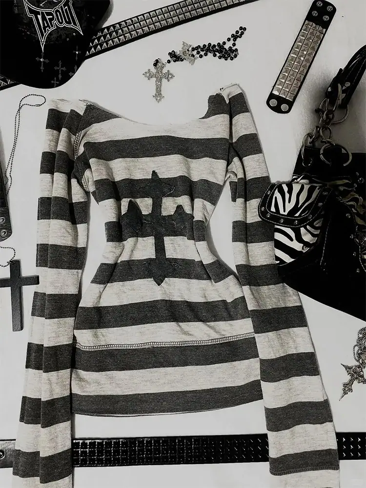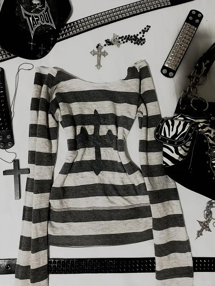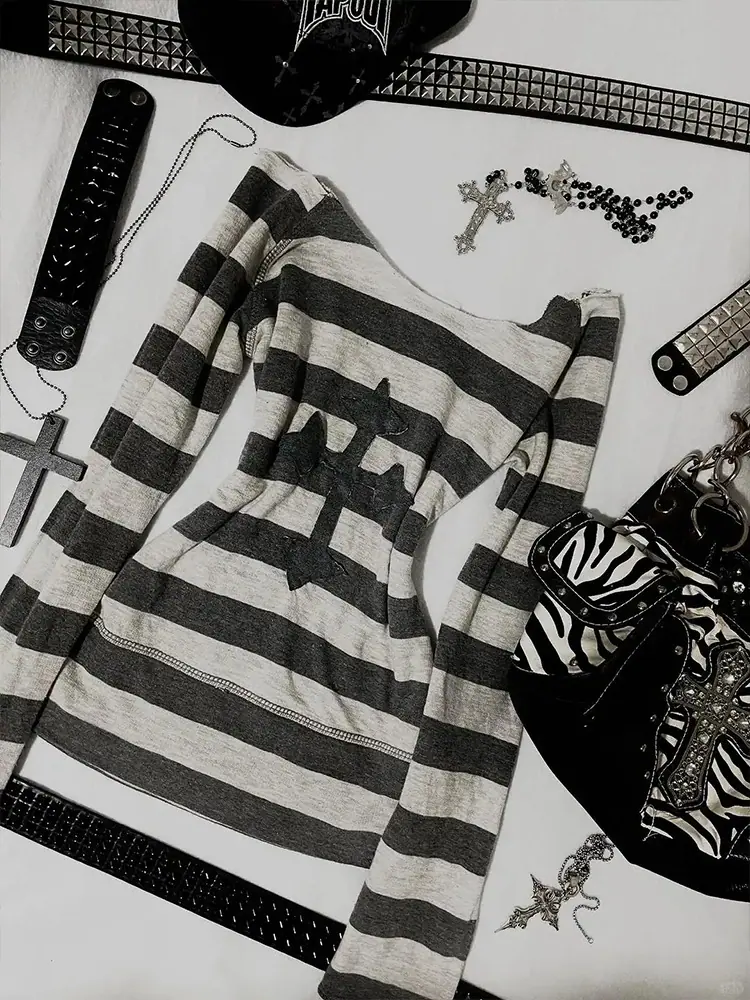 Ins estilo gótico comercio exterior otoño e invierno nuevo cuello redondo manga larga rayas punk personalidad nicho cruz moda Y2K