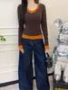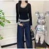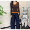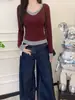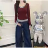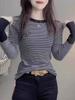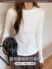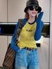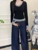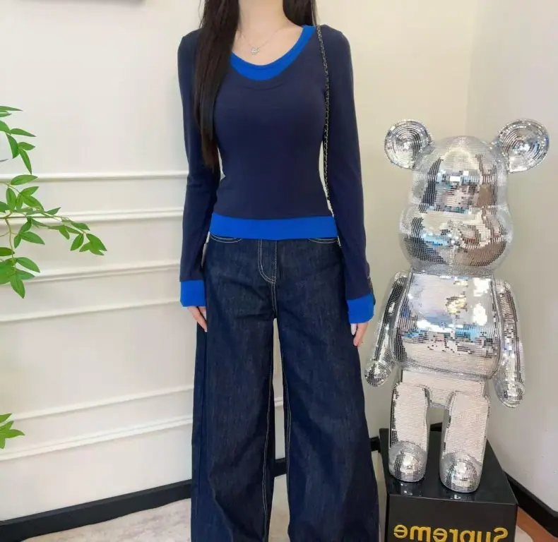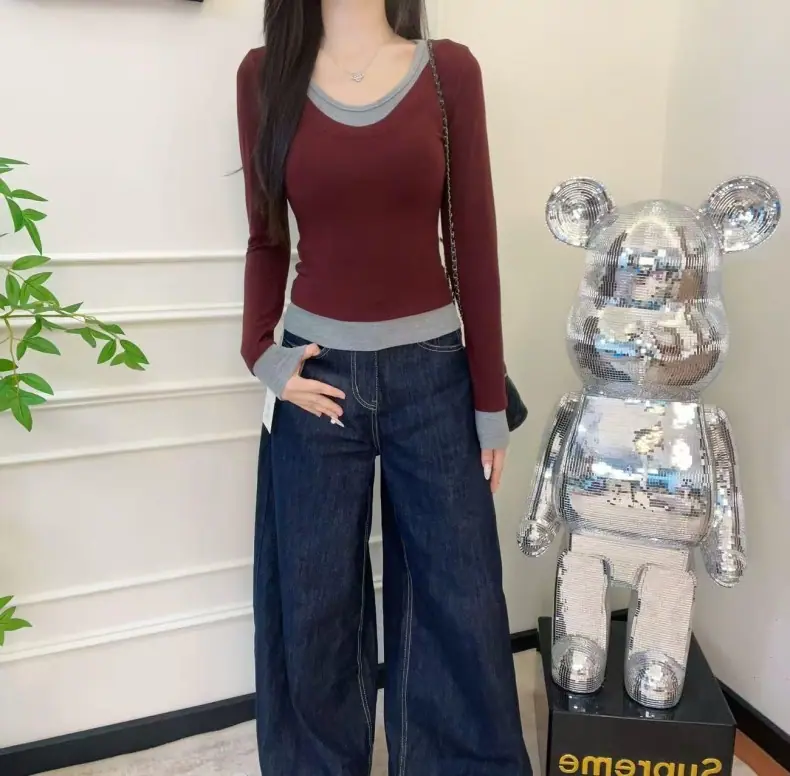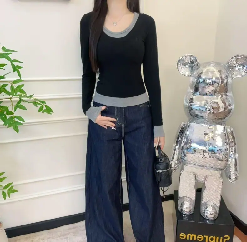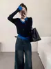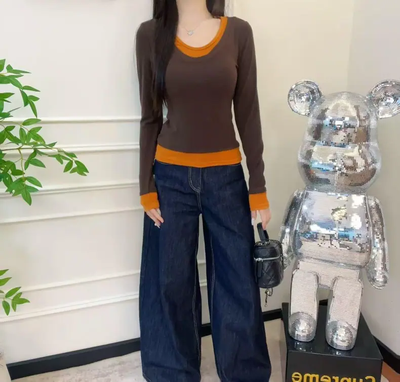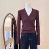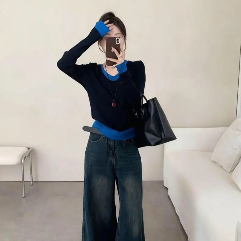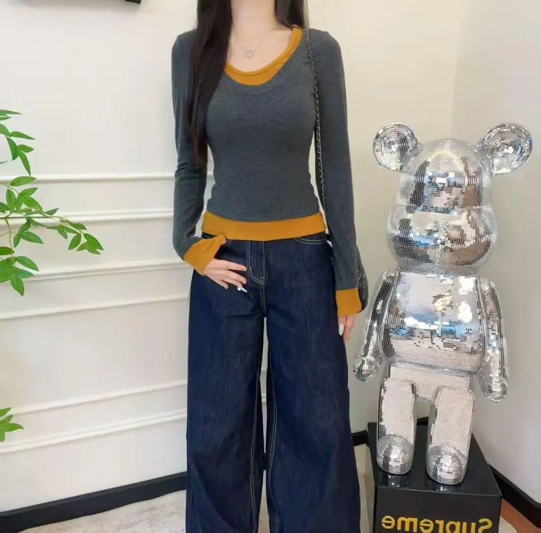 2025 Otoño/Invierno Nuevo Estilo Coreano de Moda Camiseta de Franela con Bloques de Color Cuello en V para Mujer Capa Interior de Alta Gama Adelgazante Manga Larga