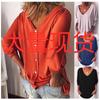 Ropa Europea y Americana Nueva V-Neck Manga de Murciélago Botón Trasero Camiseta Top Holgado