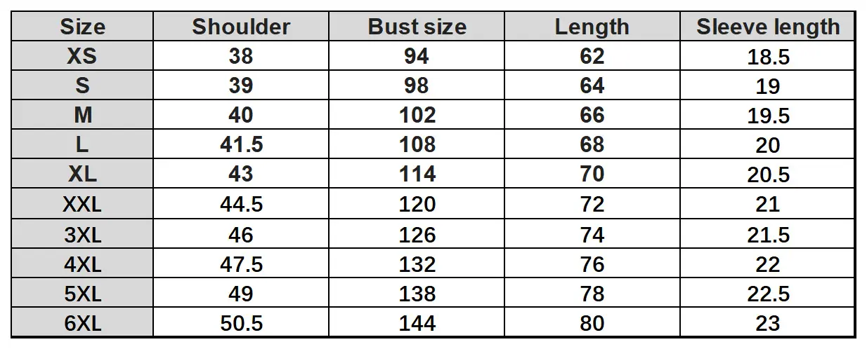 XS, S, M, L, XL, XXL, 3XL, 4XL, 5XL, 6XL