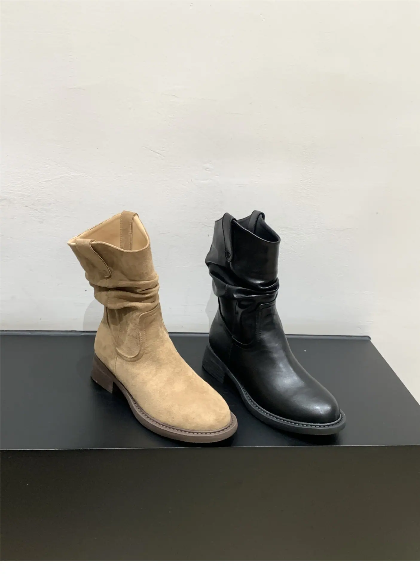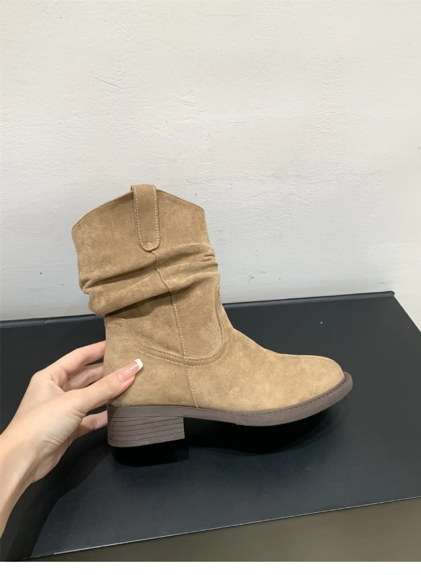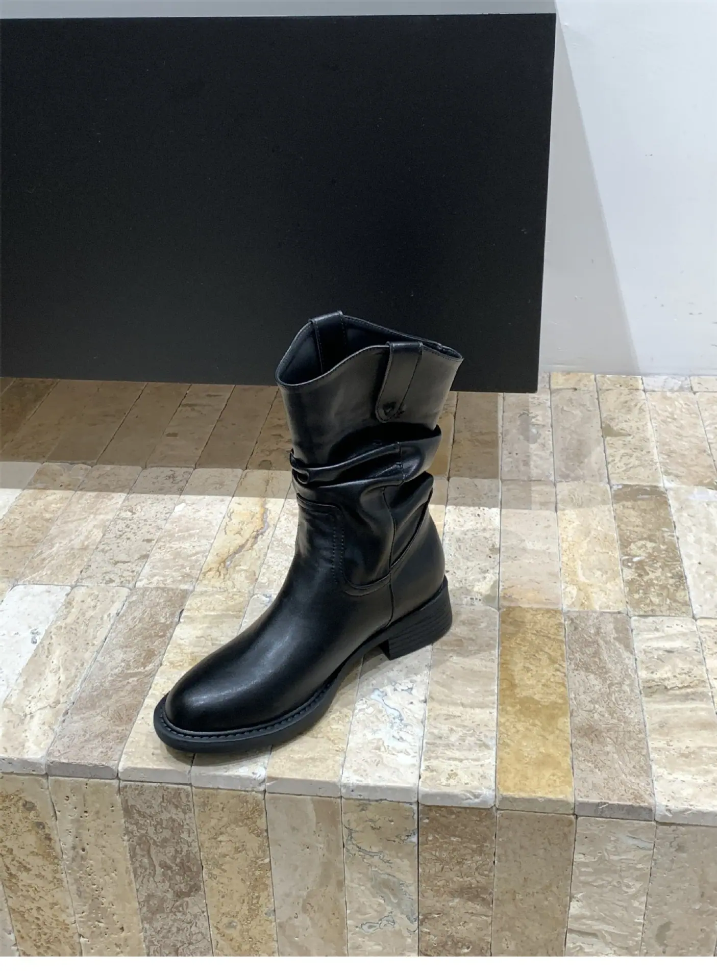 Botas adelgazantes de media pantorrilla con boca en V y suela gruesa para mujer, zapatos 2025 primavera y otoño, botas individuales, botas cortas holgadas de vaquero occidental, botas Martin