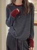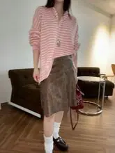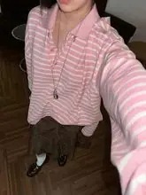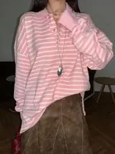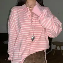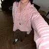 Camiseta de Manga Larga con Cuello Polo de Rayas Rosadas de Estilo Dulce que Reduce la Edad para Mujer, Camisa Base de Alta Gama