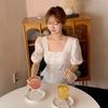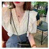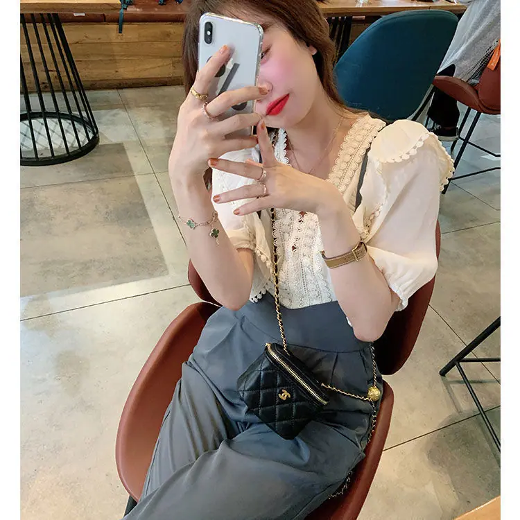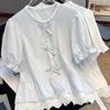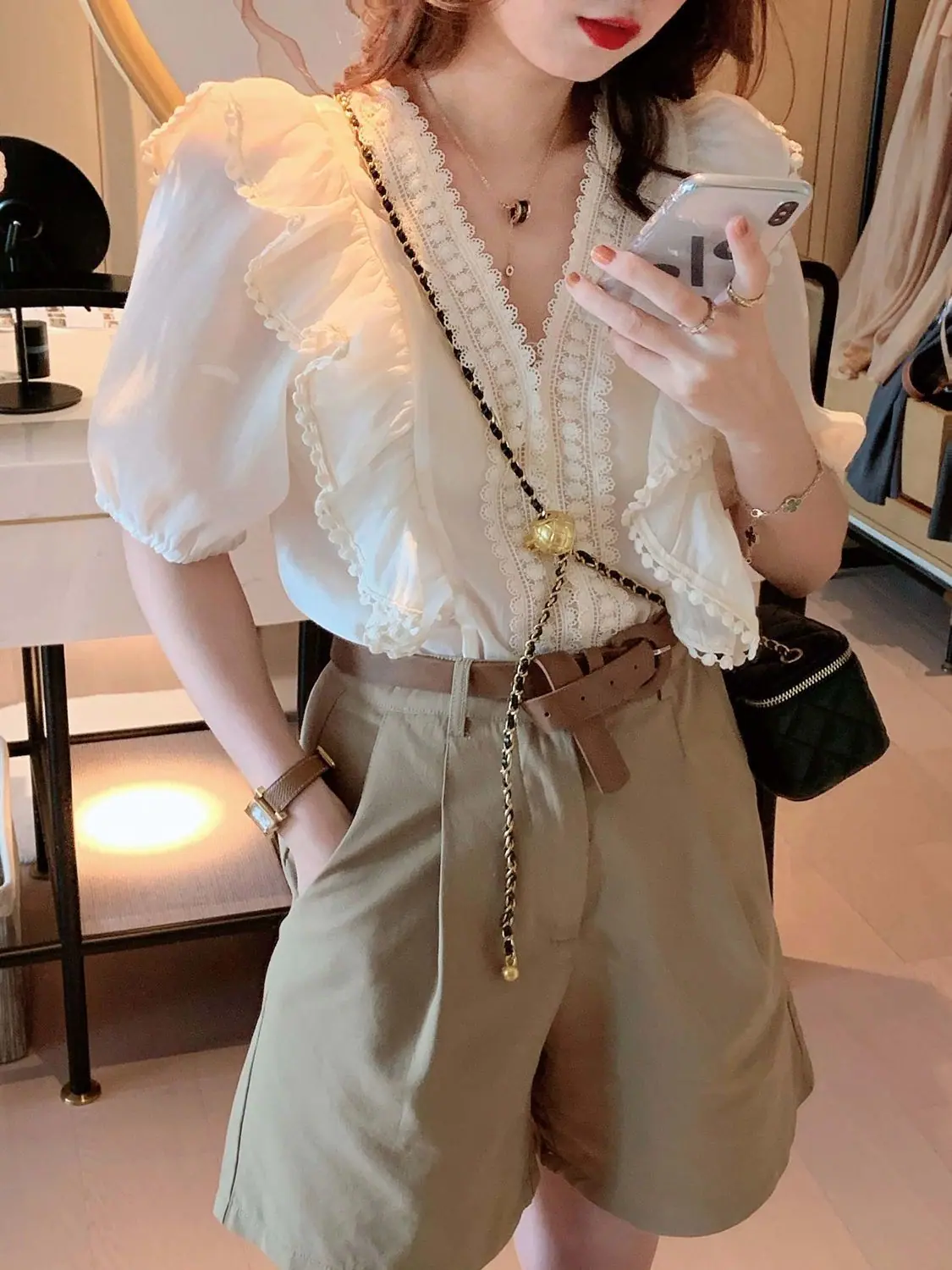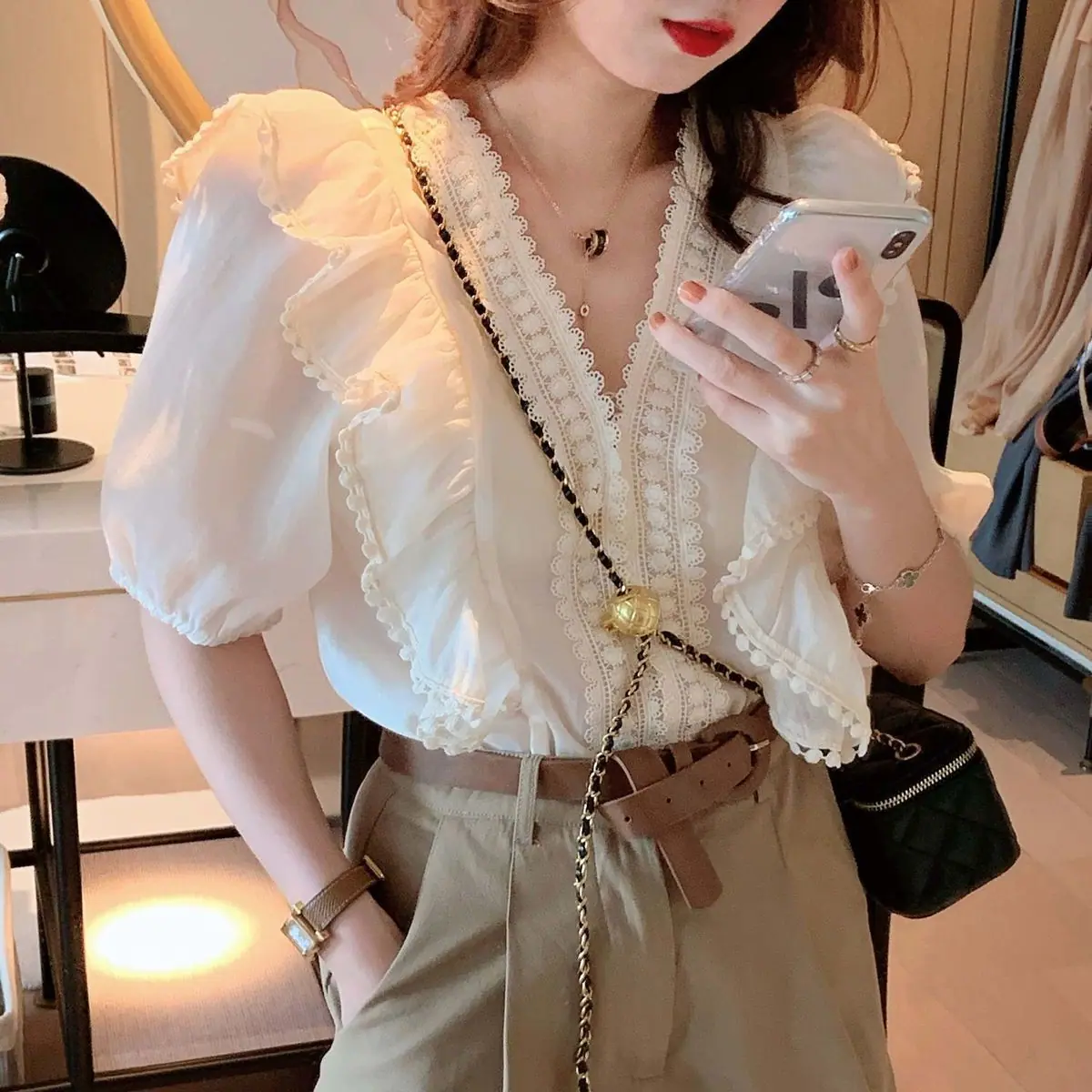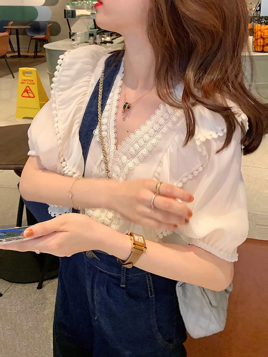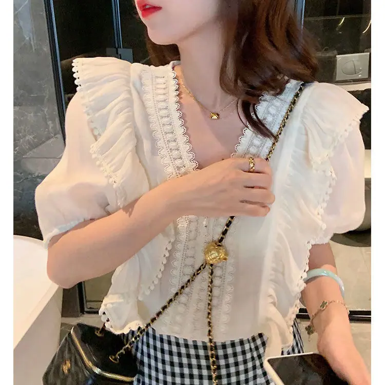 2025 Nueva Camisa de Verano de Estilo Coreano de Manga Corta para Mujer con Tops de Empalme de Encaje Francés Nicho Súper Hada