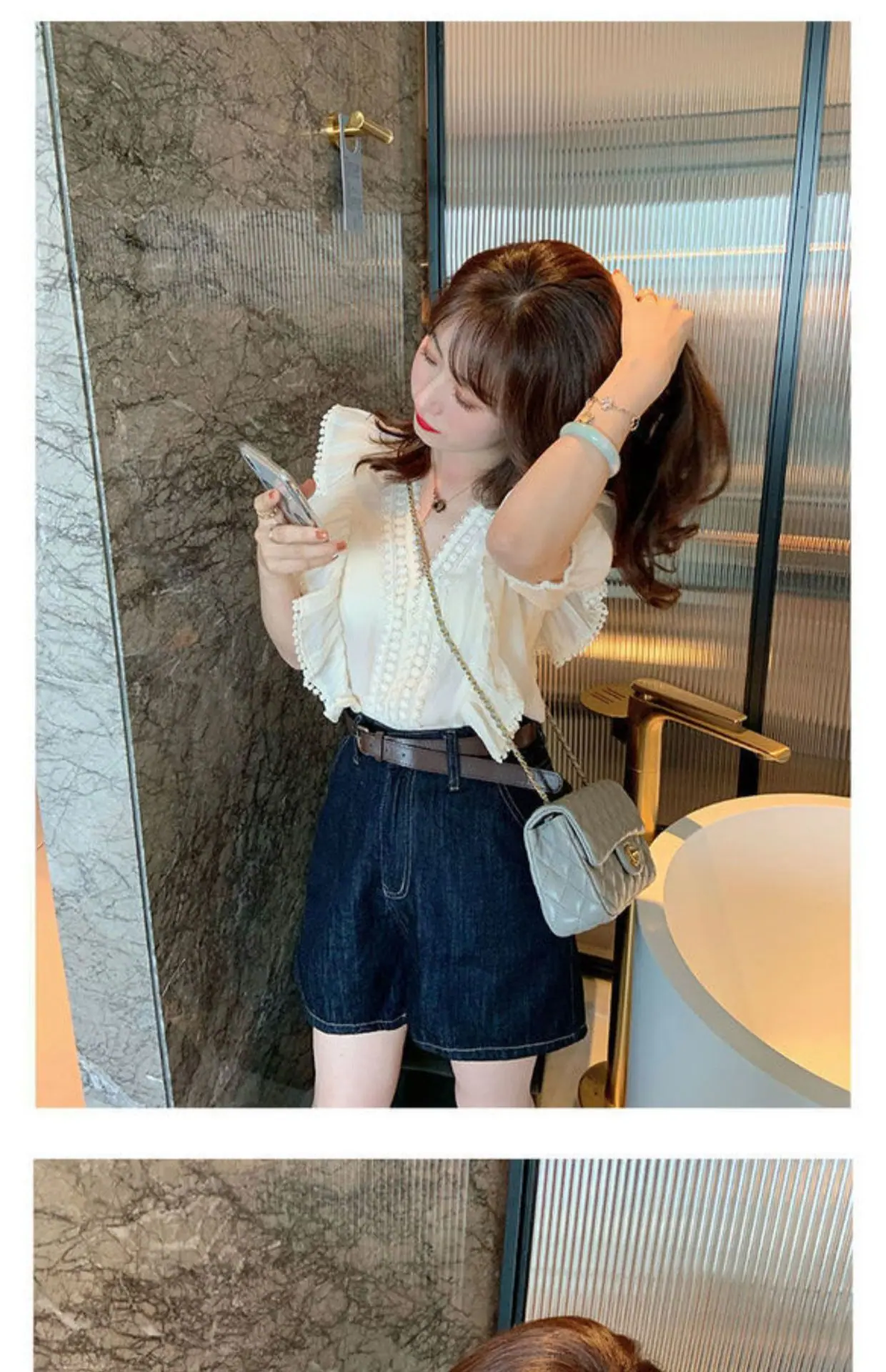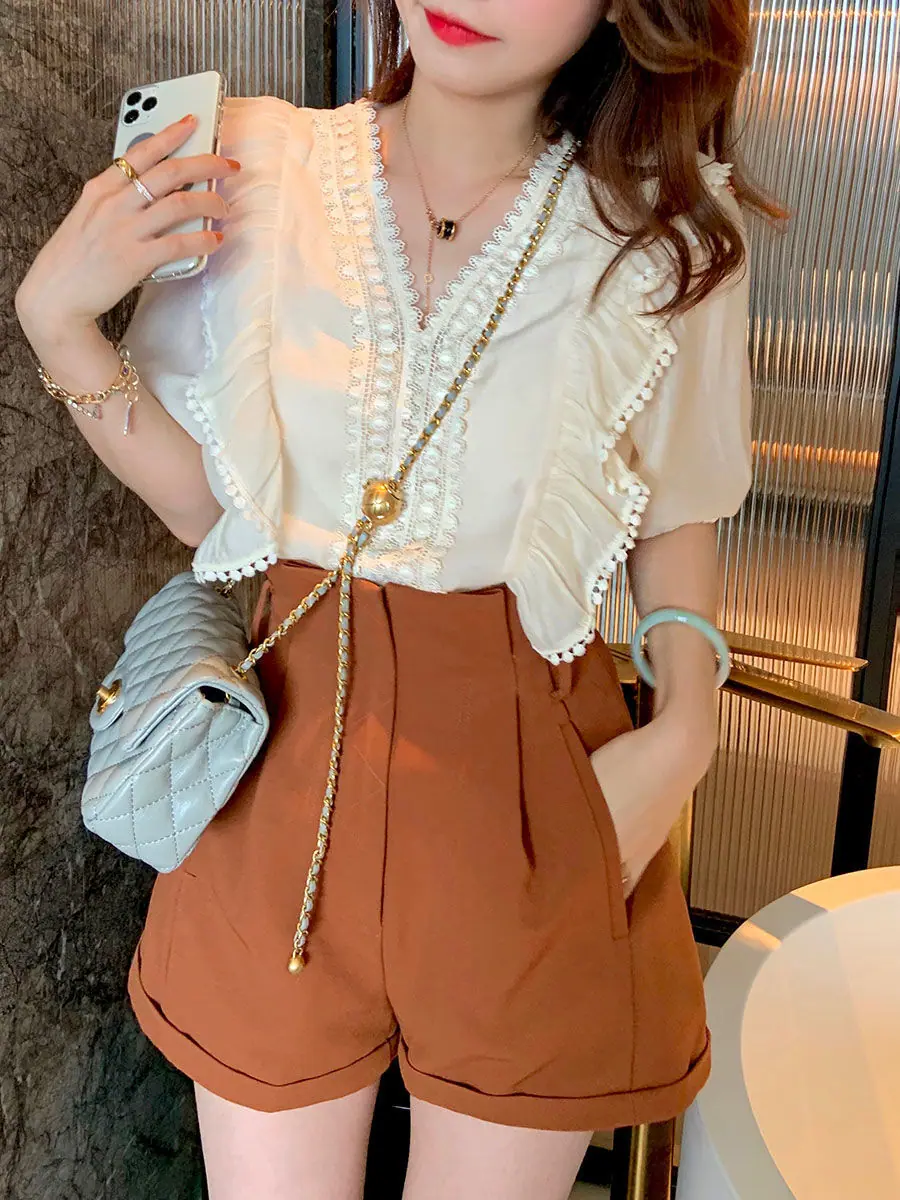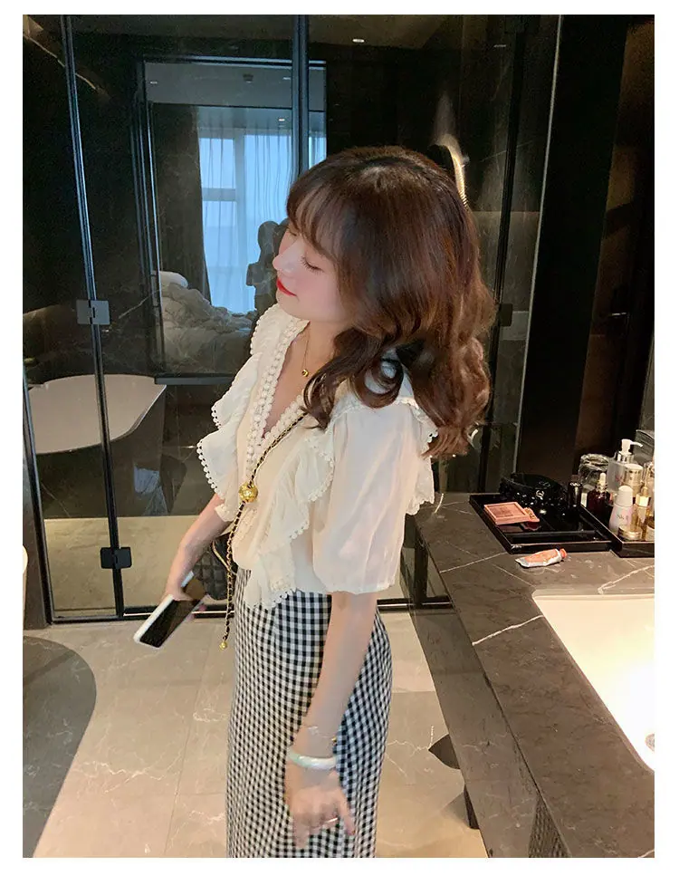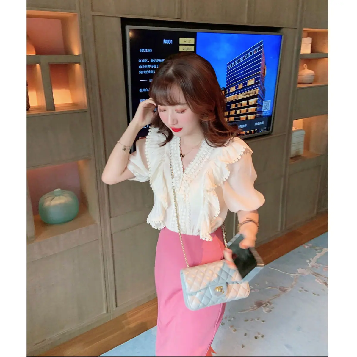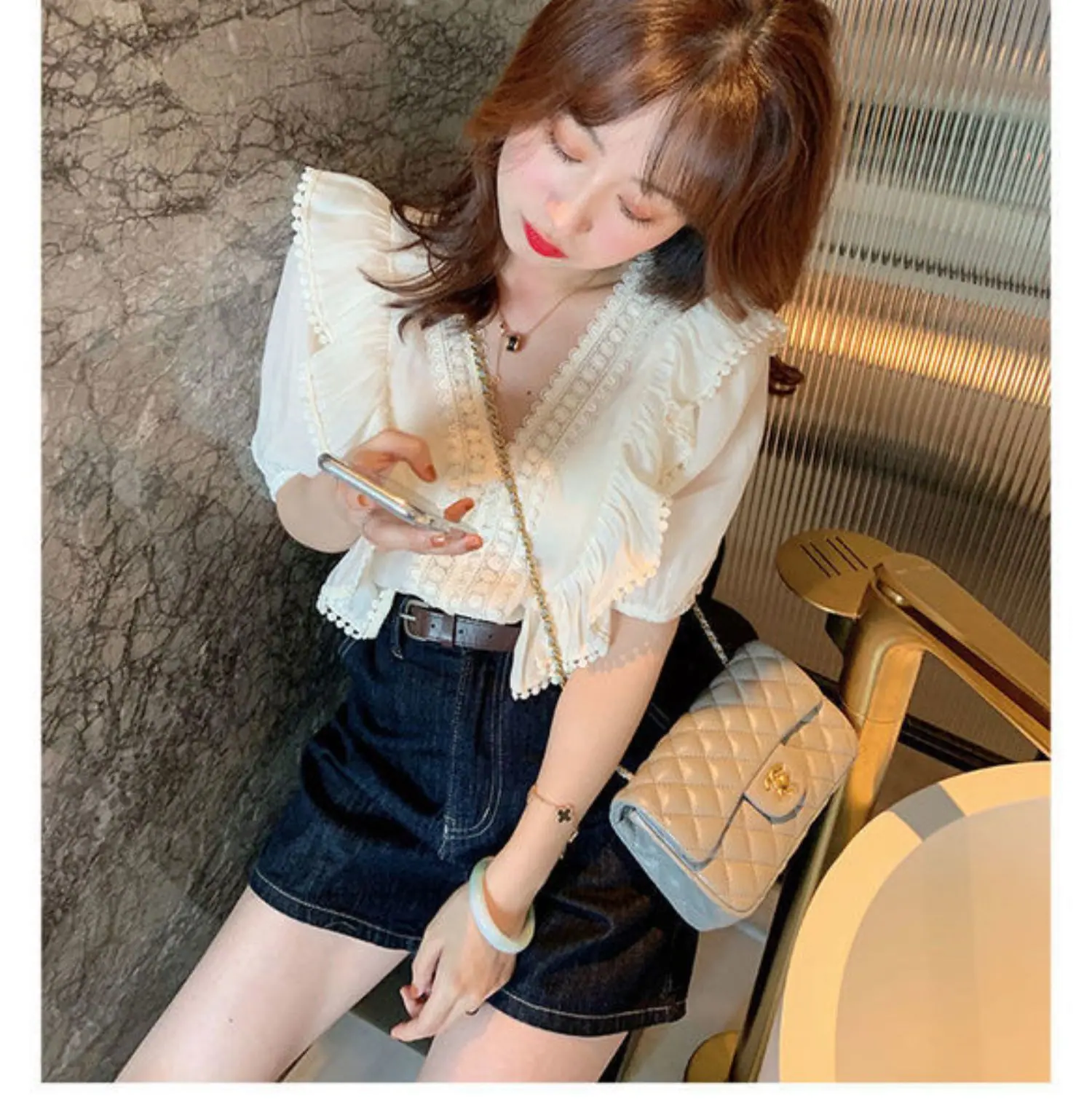 2025 Nueva Camisa de Verano de Estilo Coreano de Manga Corta para Mujer con Tops de Empalme de Encaje Francés Nicho Súper Hada