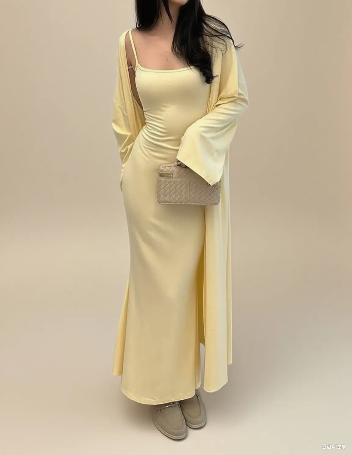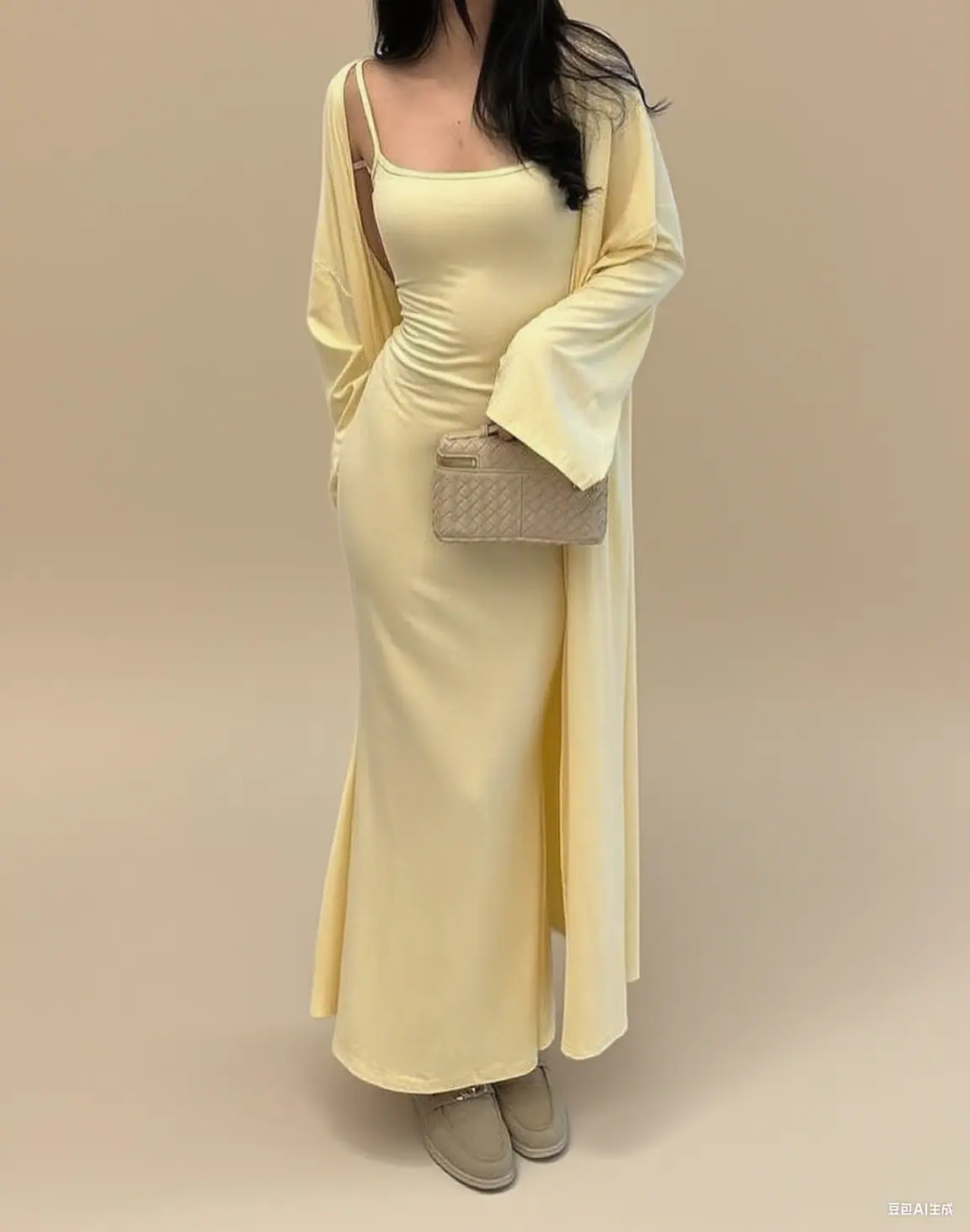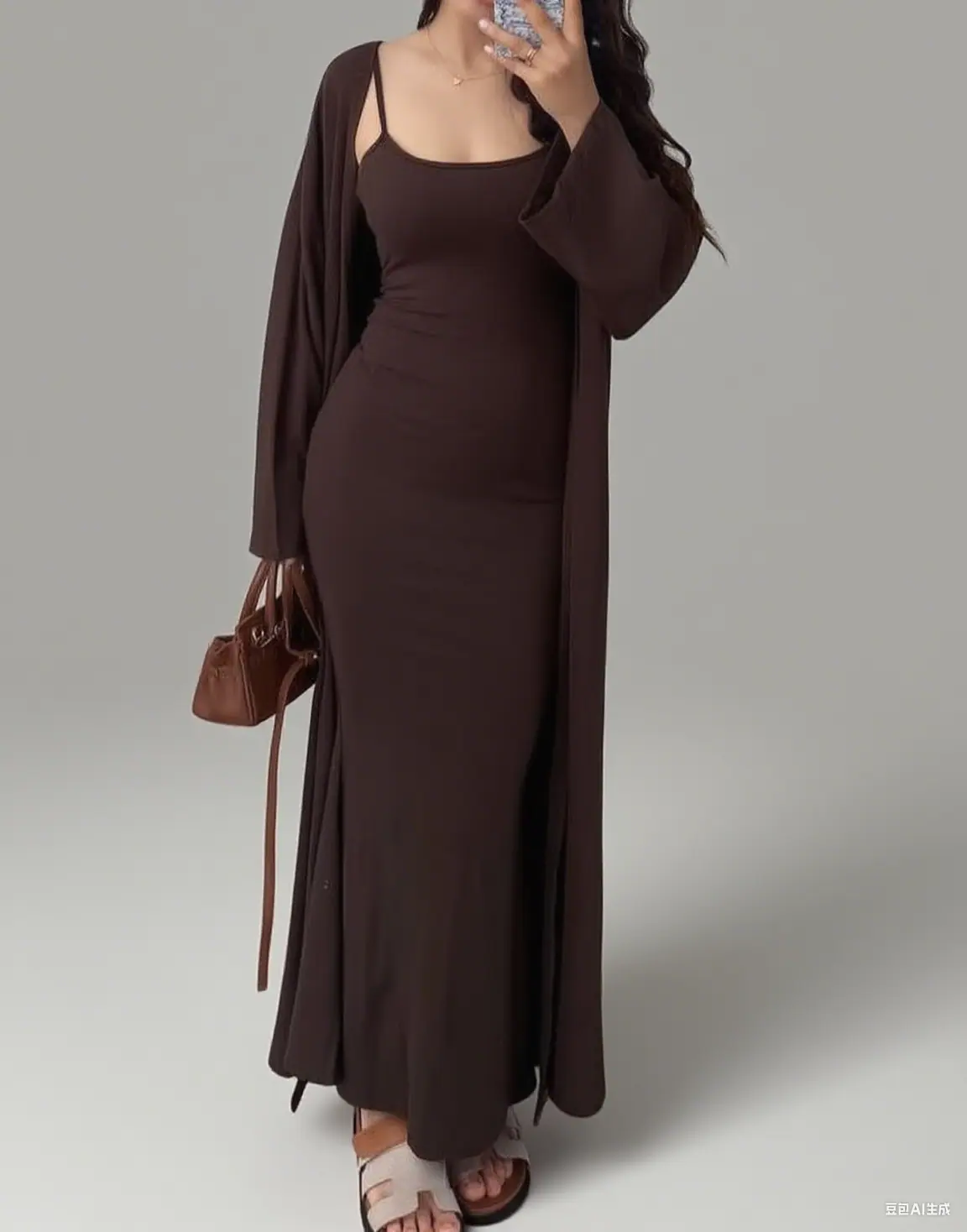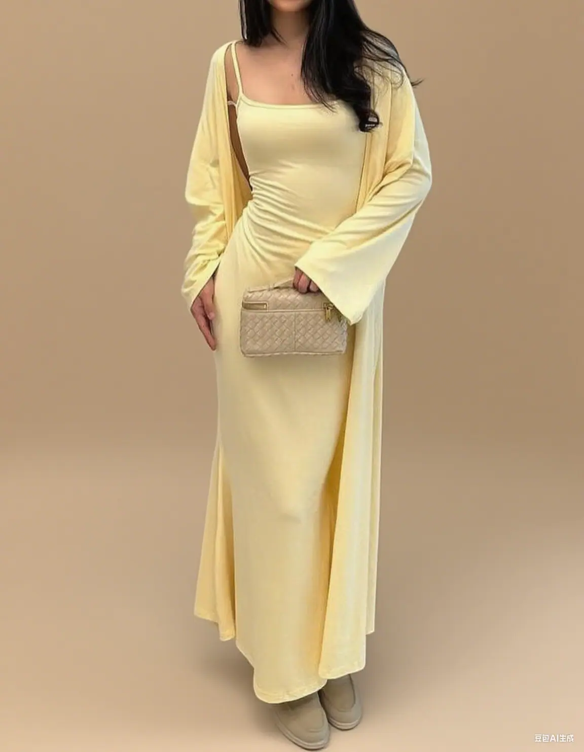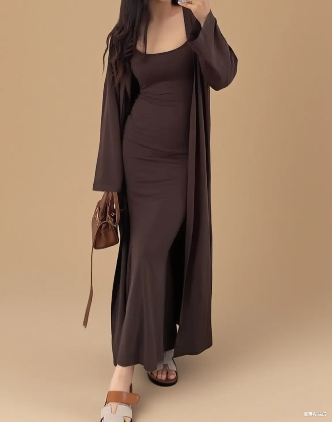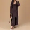 En stock Otoño 2025 Europeo y Americano Amazon Casual Ajustado Camisola Color Sólido Cárdigan Largo de Abrigo Exterior Conjunto de Dos Piezas Venta al por Mayor