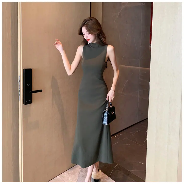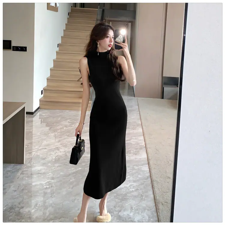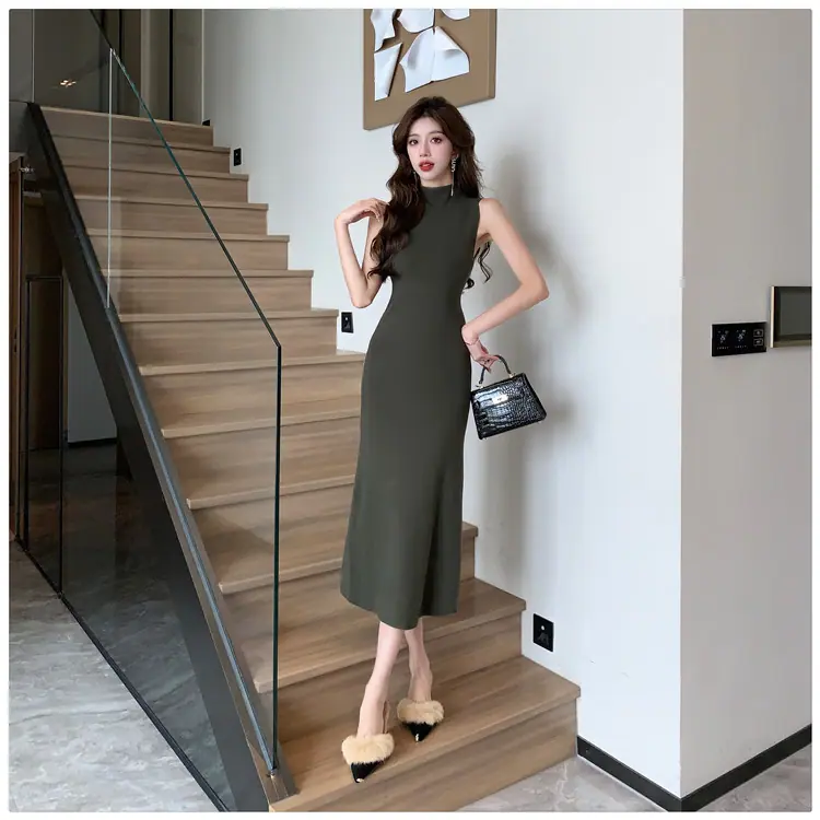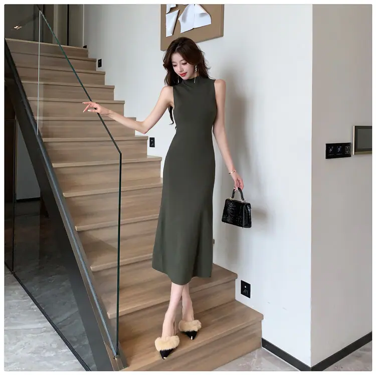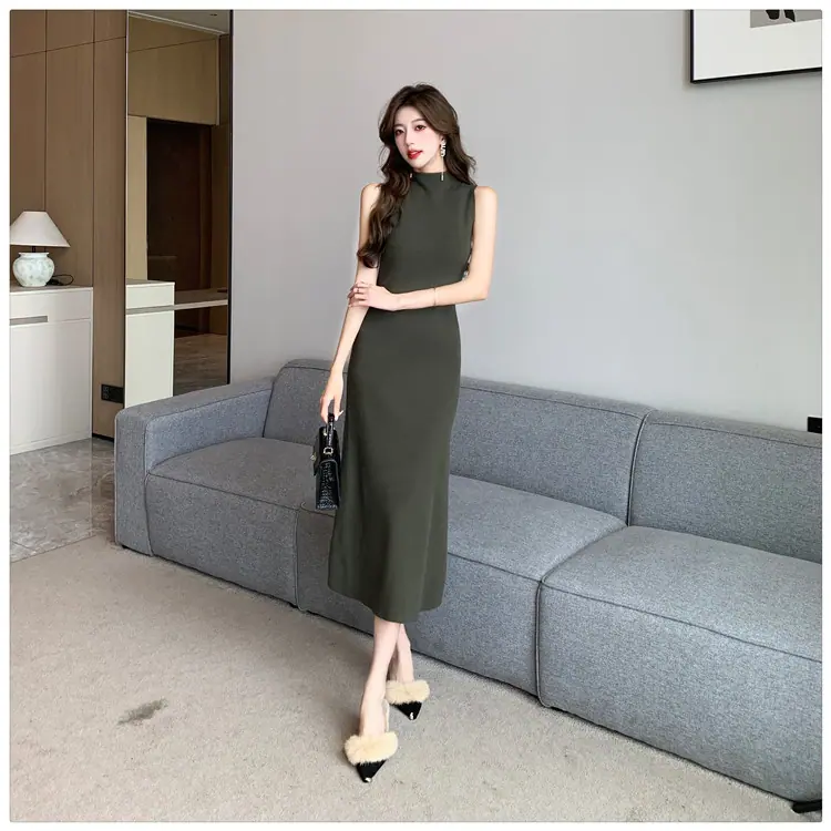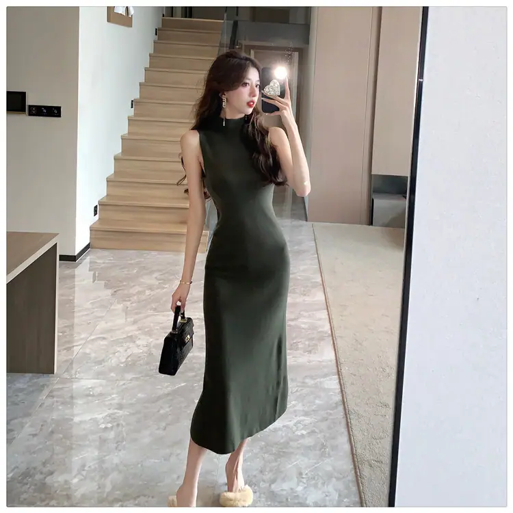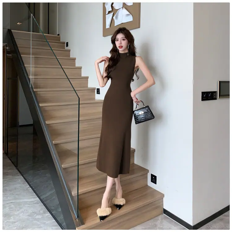 Transfronterizo 2025 Otoño/Invierno Nuevo Vestido Tejido de Chaleco sin Mangas de Cuello Medio Alto para Mujer, Temperamento Adelgazante de Alta Gama