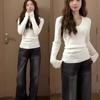 Camiseta interior blanca de fondo Camiseta de manga larga para mujer 2025 Nuevo Invierno Terciopelo Slim Hombro Top Otoño Cuello Redondo