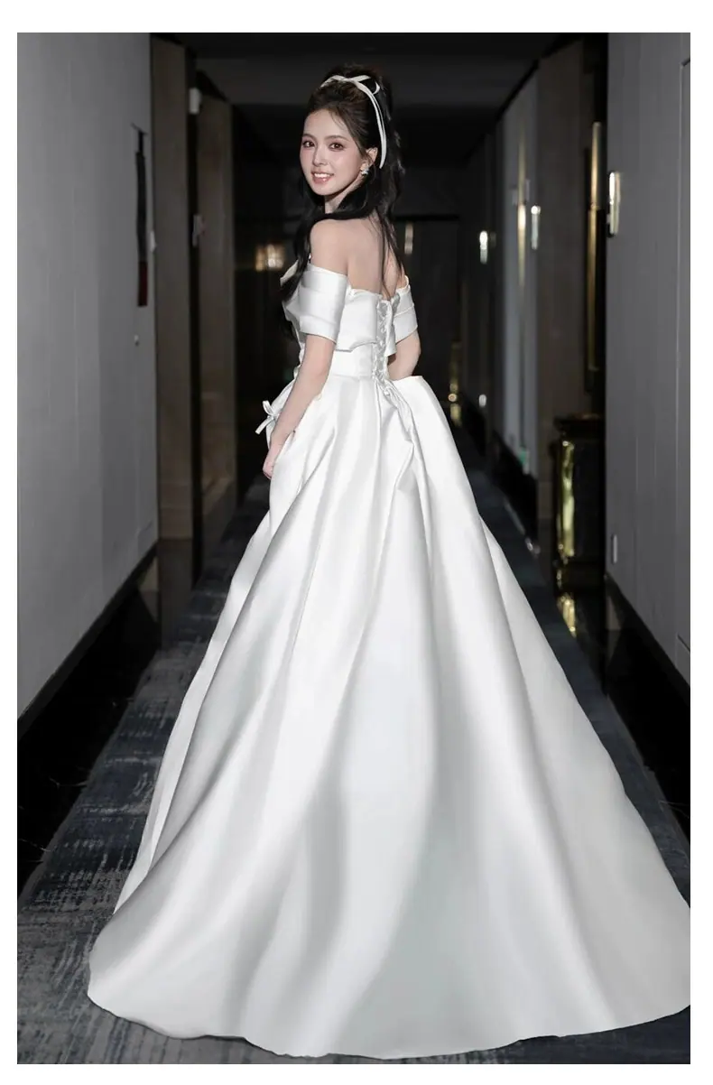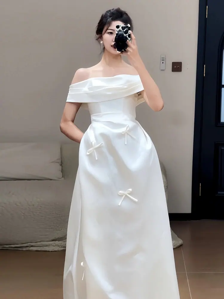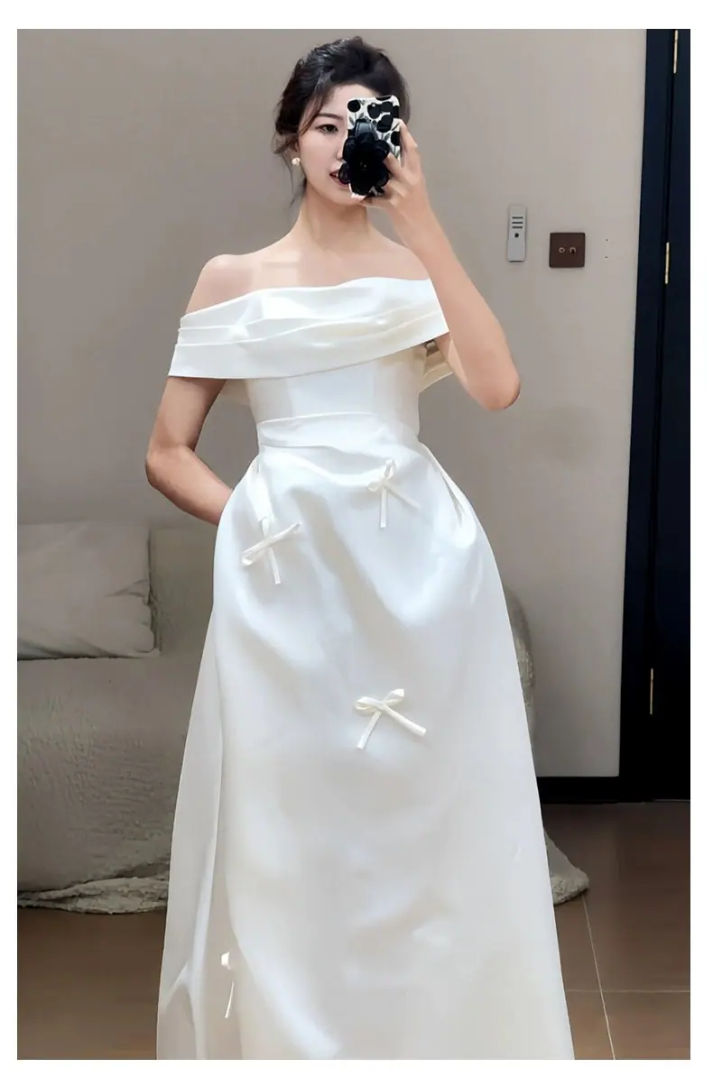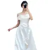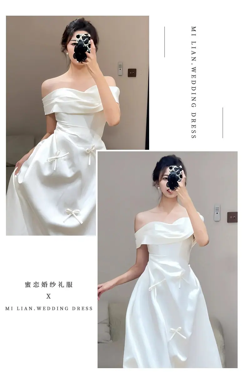 Vestido de Novia Ligero de Satén Francés Novia Compromiso Registro de Licencia Vestido de un Hombro Sencillo Diario Lazo Vestido Blanco Pequeño
