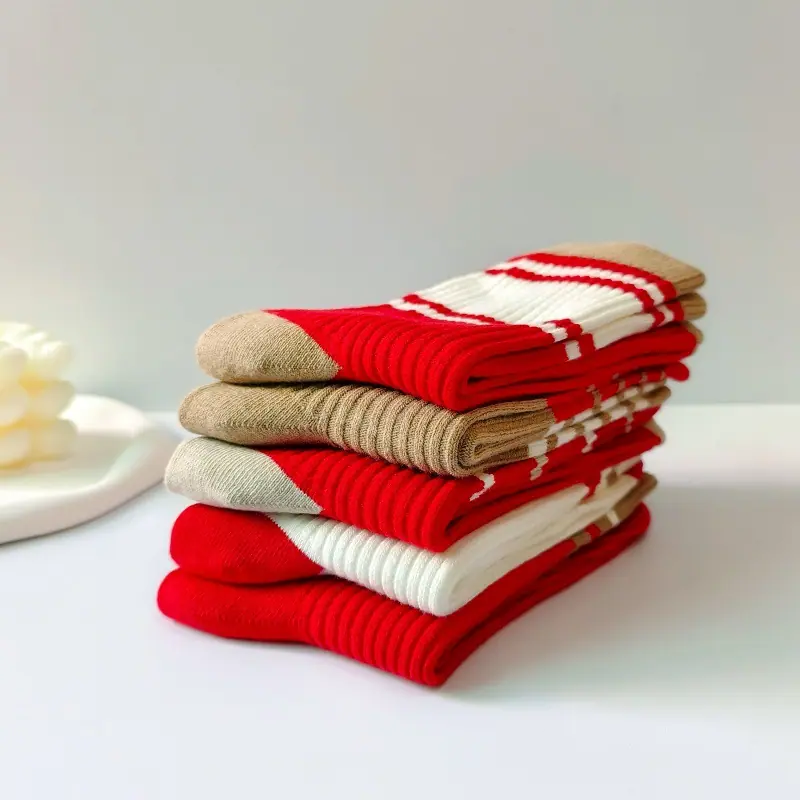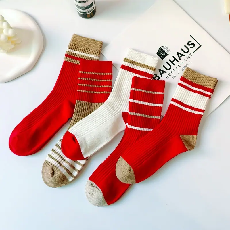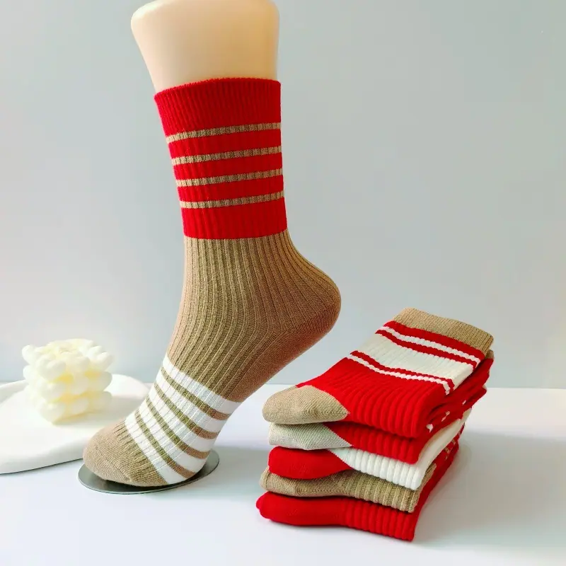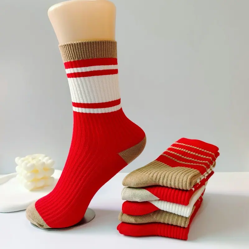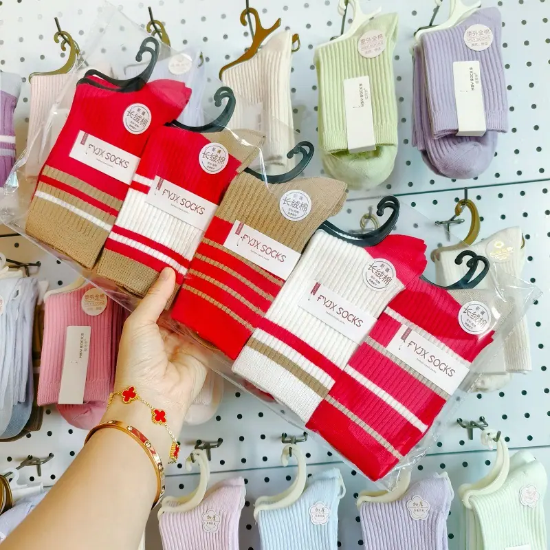 Calcetines de Media Caña para Mujer con Bloque de Color y Doble Aguja El empaque de los calcetines es el mismo que en la imagen, cada par viene con cartulina y un gancho. Enfoque en el suministro de supermercados, con código de barras