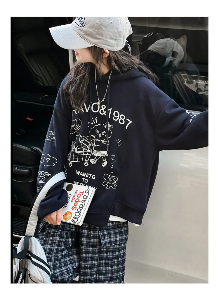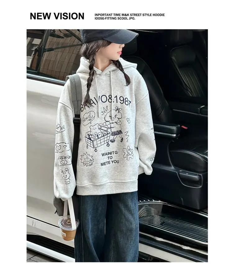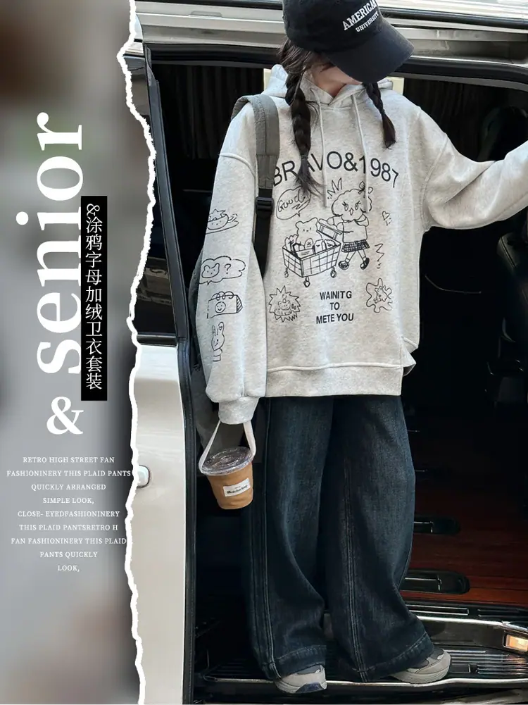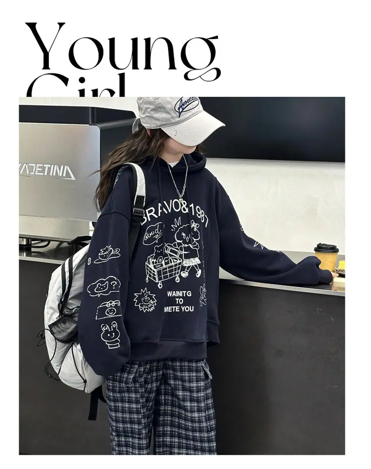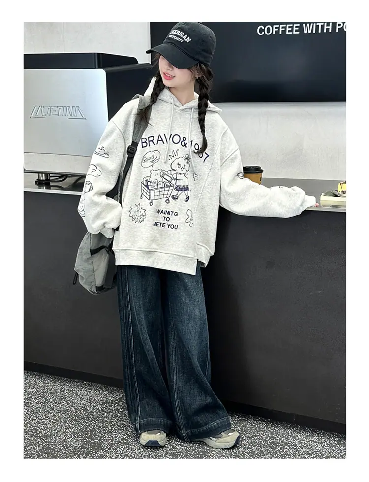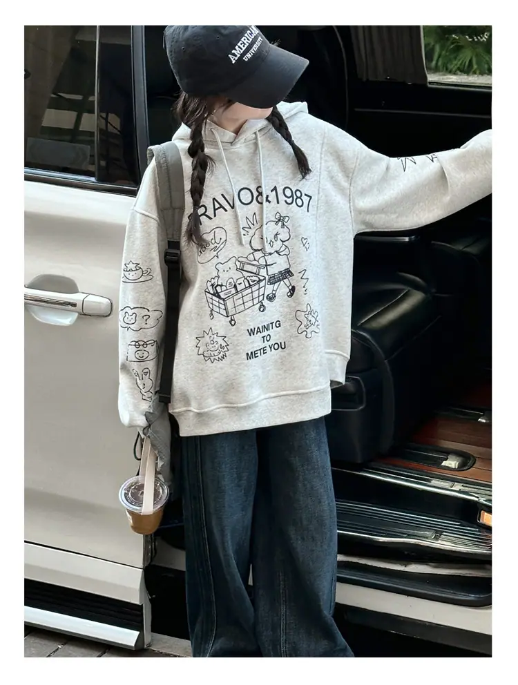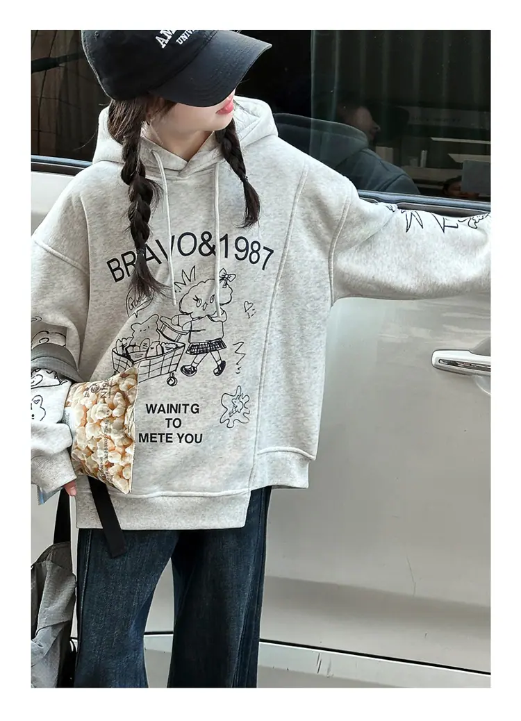 Sudadera de Felpa Otoño/Invierno para Niñas Grandes 2025 Nueva Infantil de Dibujos Animados Graffiti Gruesa de Una Pieza con Capucha Felpa Transfronteriza