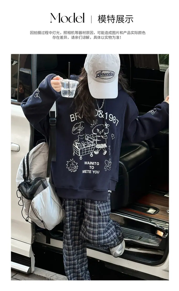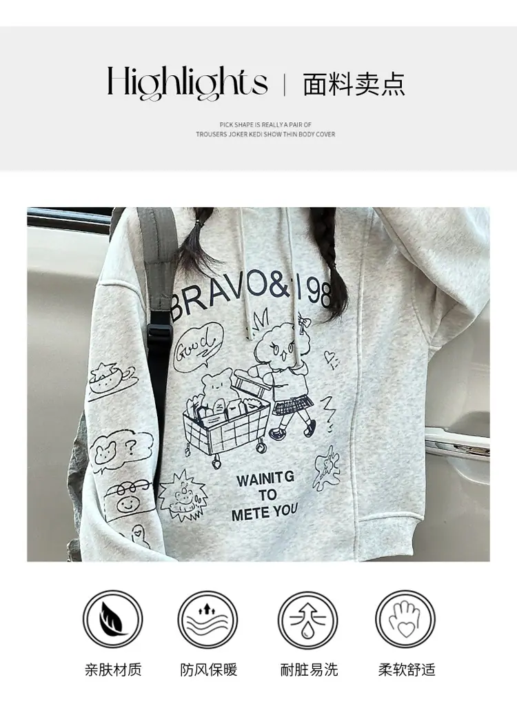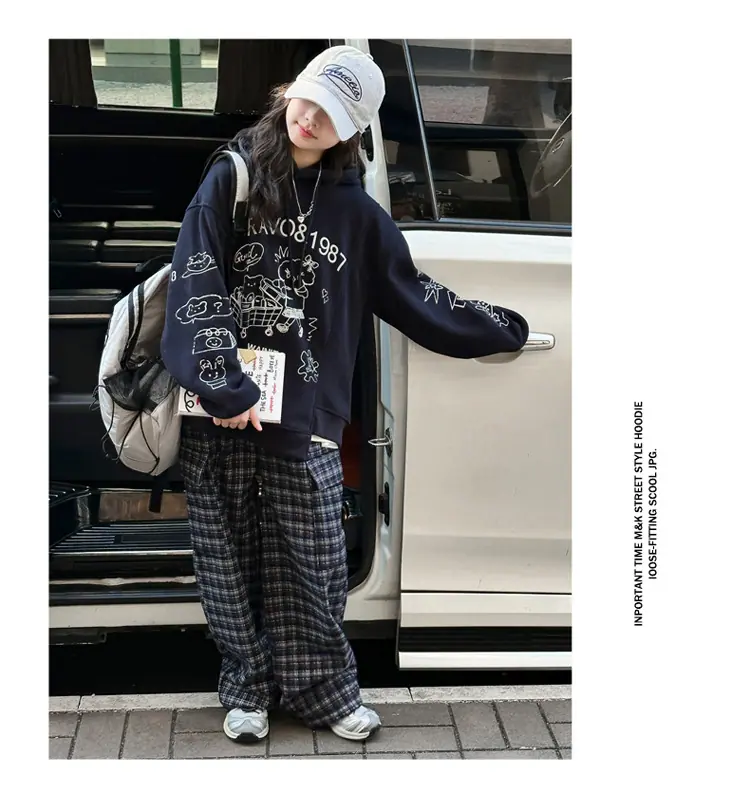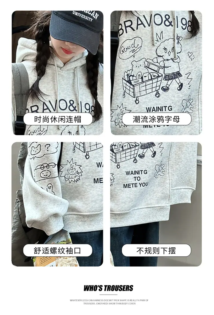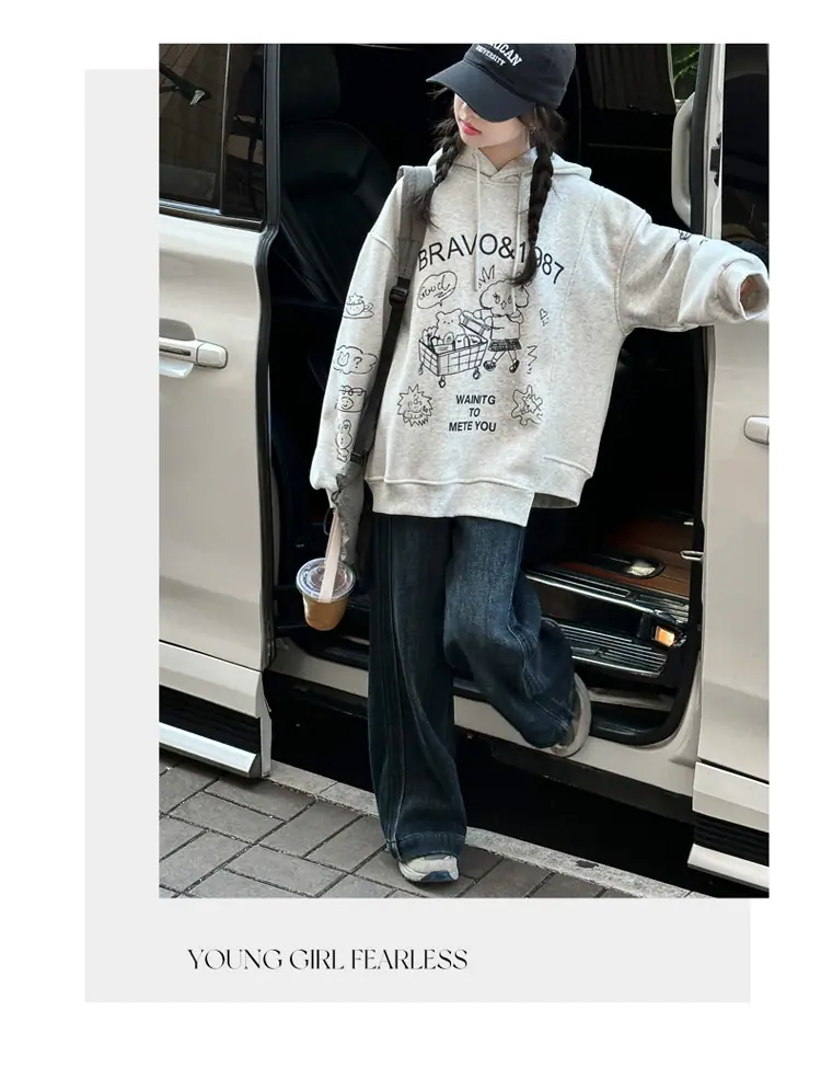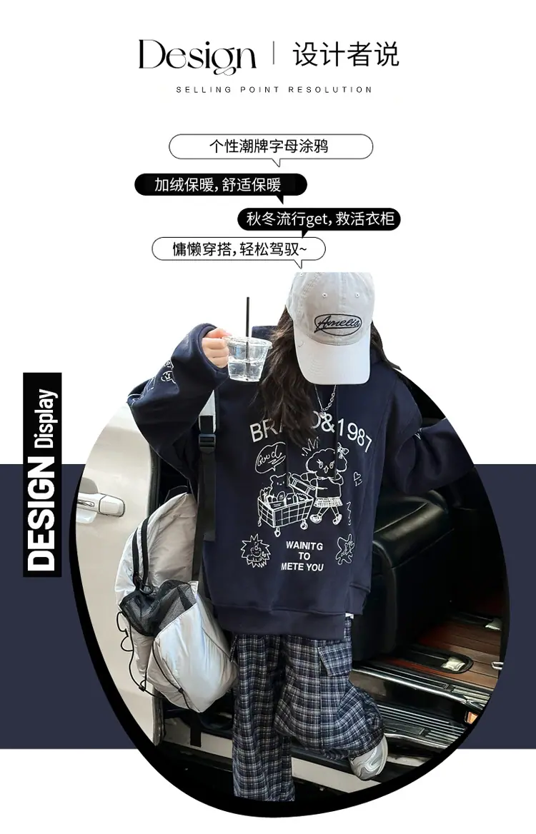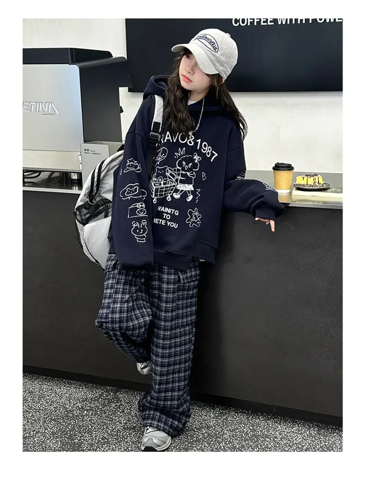 Sudadera de Felpa Otoño/Invierno para Niñas Grandes 2025 Nueva Infantil de Dibujos Animados Graffiti Gruesa de Una Pieza con Capucha Felpa Transfronteriza