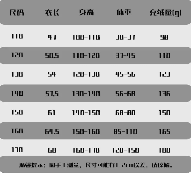110cm(90 white duck down 98.2g), 120cm(90% white duck down 110.3g), 130cm(90% white duck down 123.2g), 140cm(9...