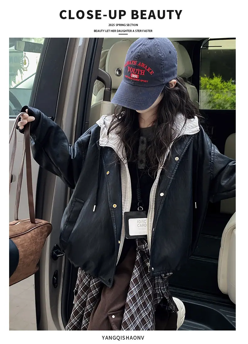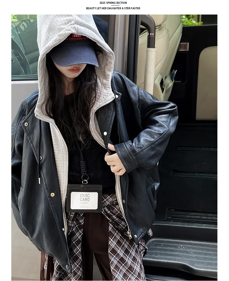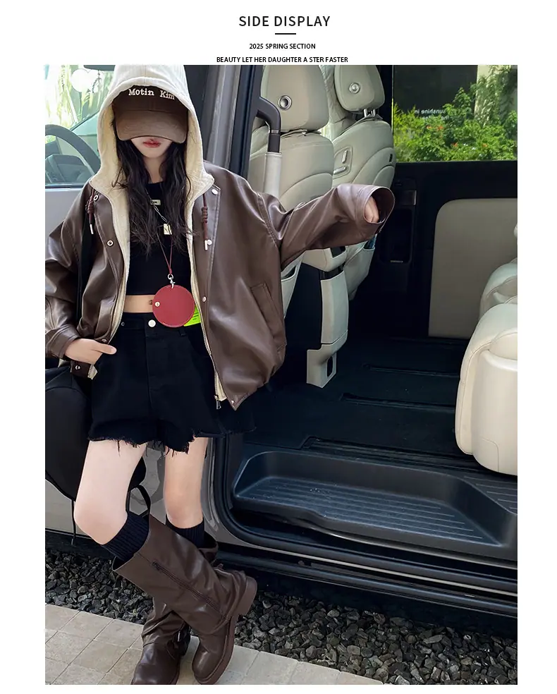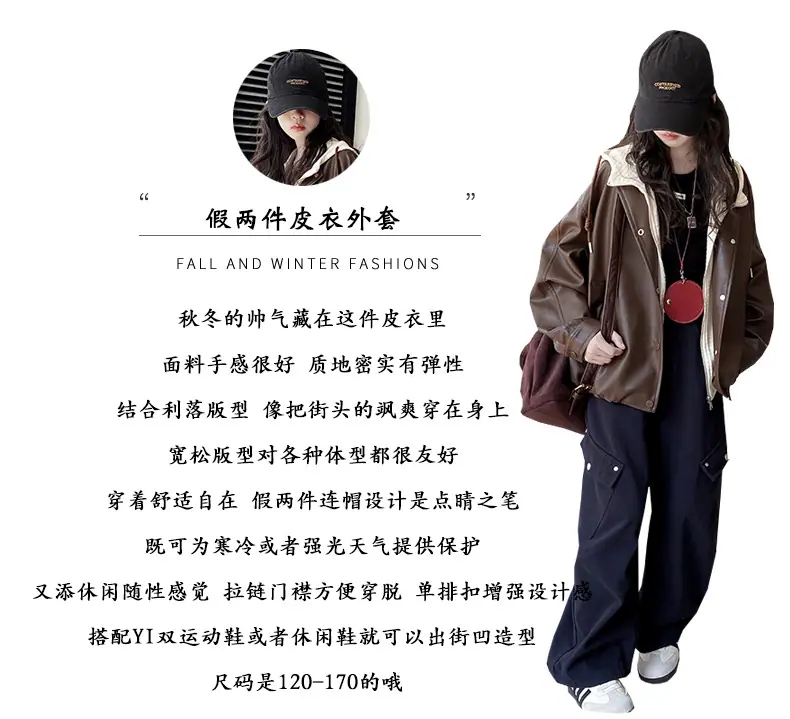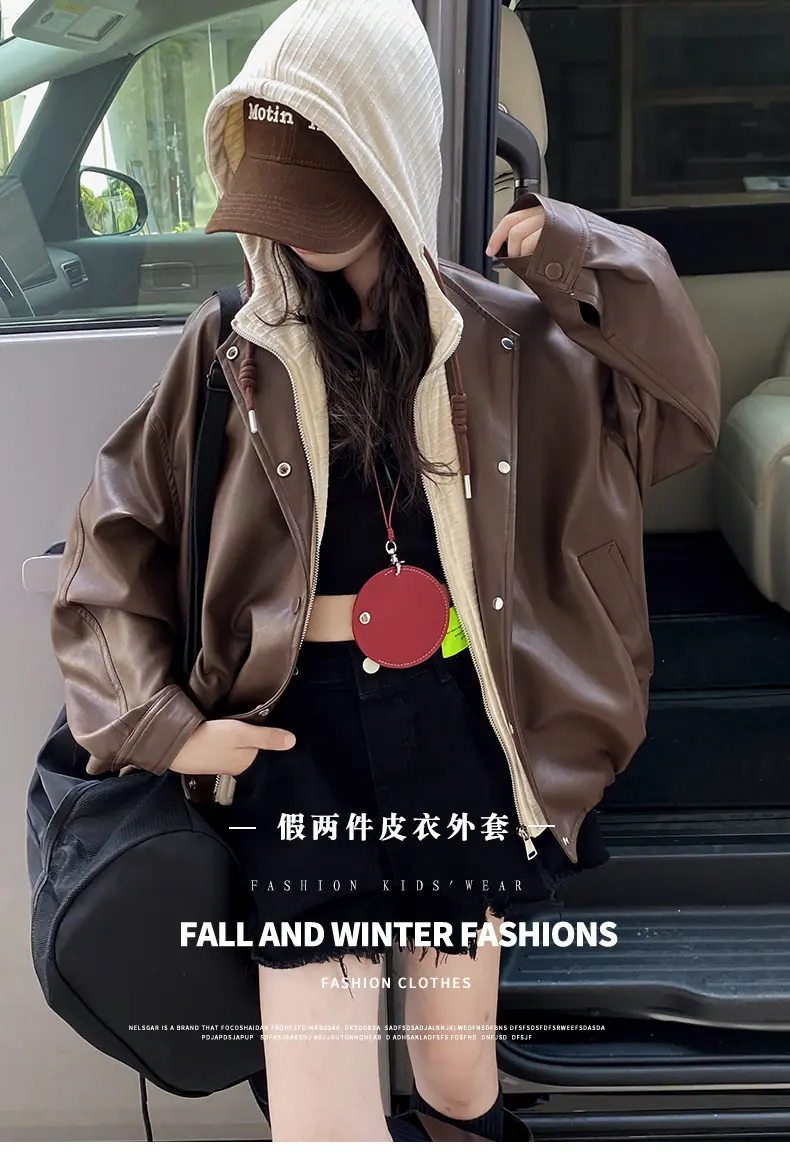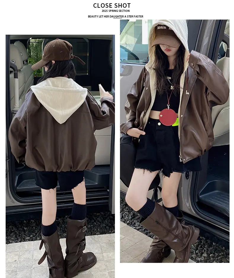 Chaqueta de Motociclista para Niñas Otoño 2025 Nuevo Estilo Niños Grandes Chaqueta de Cuero Retro Chaqueta de Cuero con Capucha Falsa de Dos Piezas para Niños