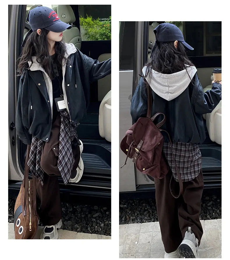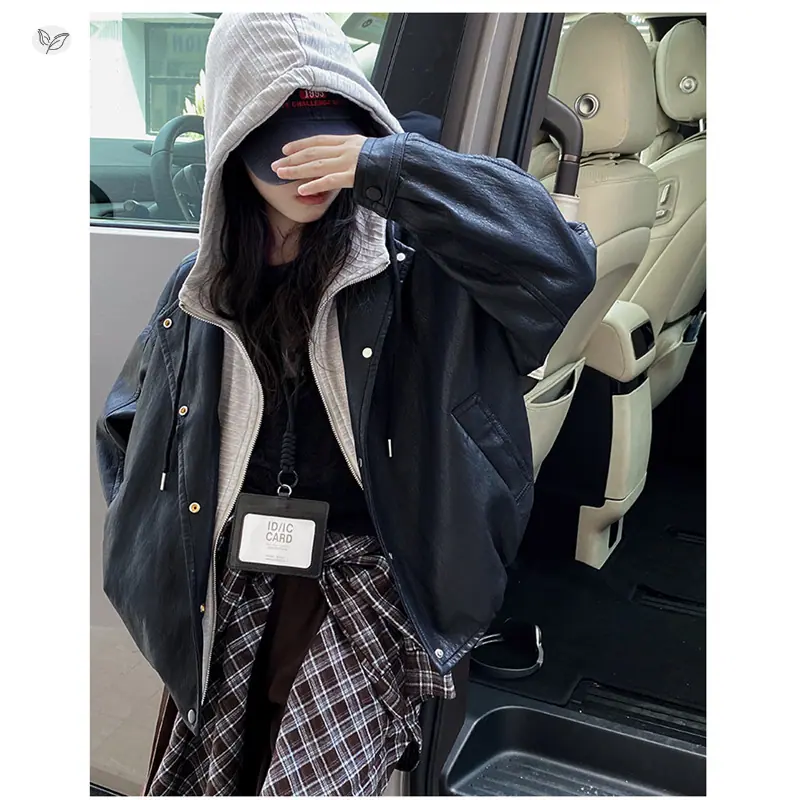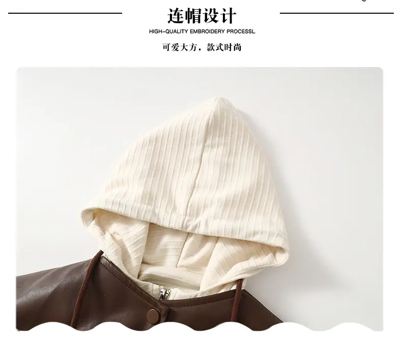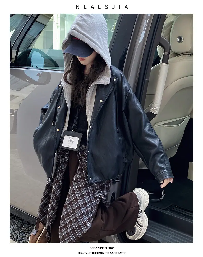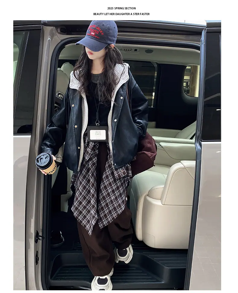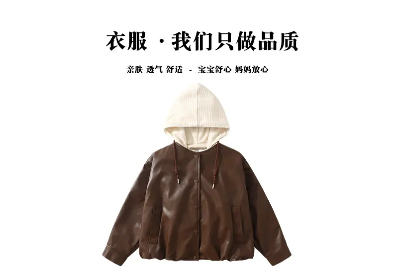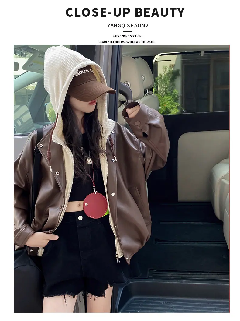 Chaqueta de Motociclista para Niñas Otoño 2025 Nuevo Estilo Niños Grandes Chaqueta de Cuero Retro Chaqueta de Cuero con Capucha Falsa de Dos Piezas para Niños
