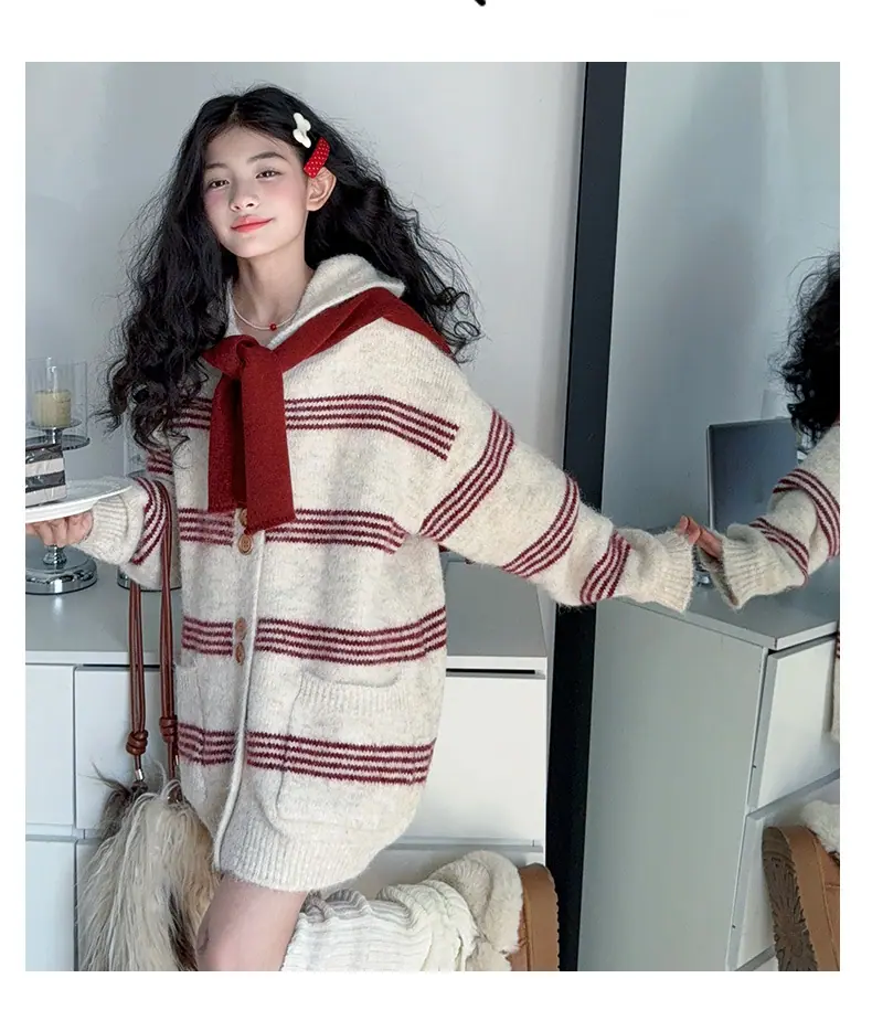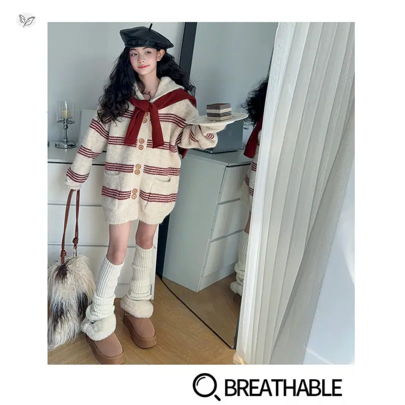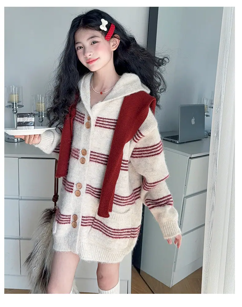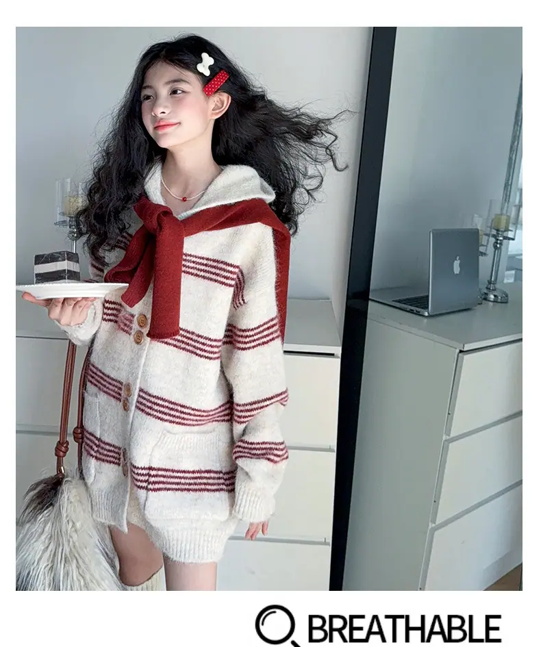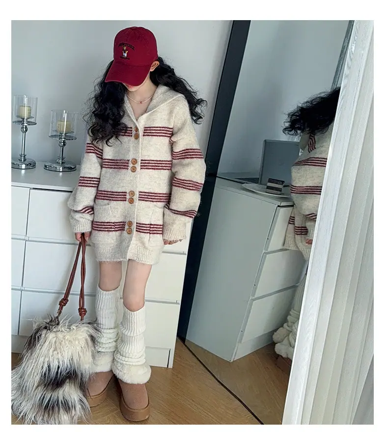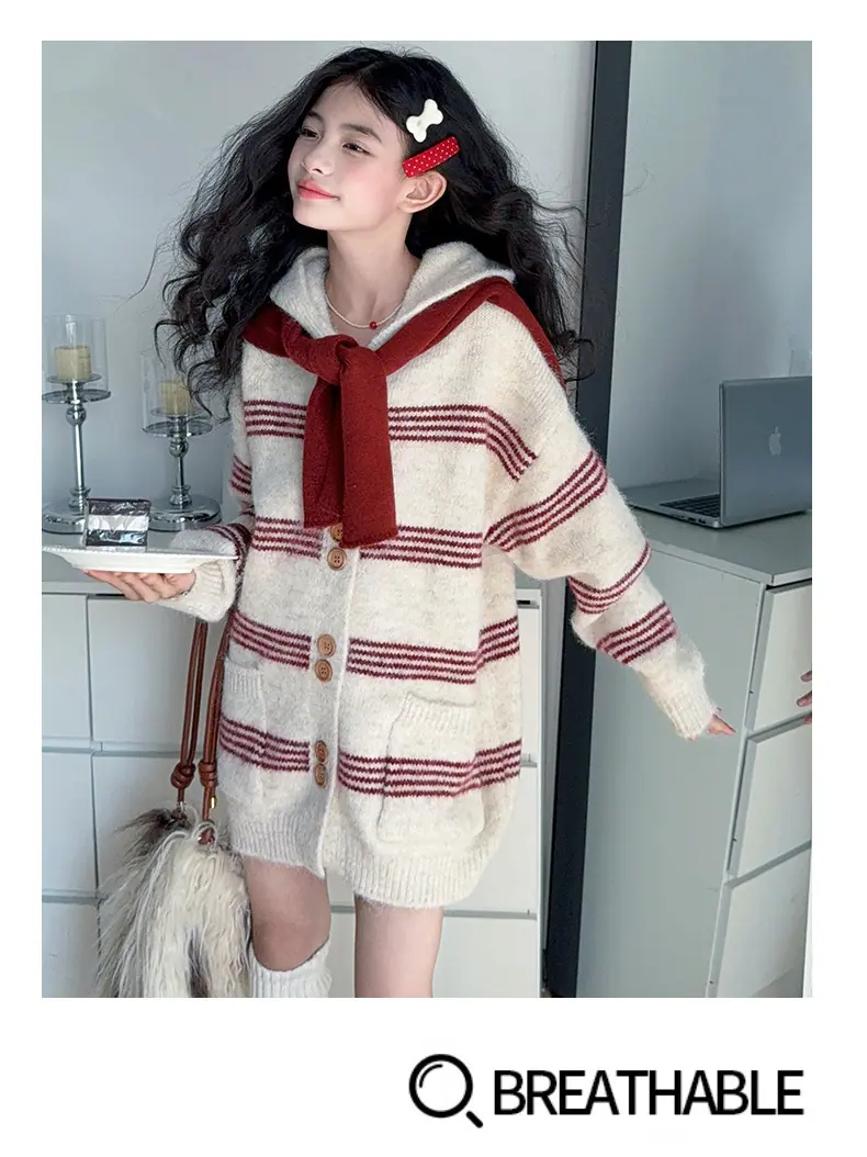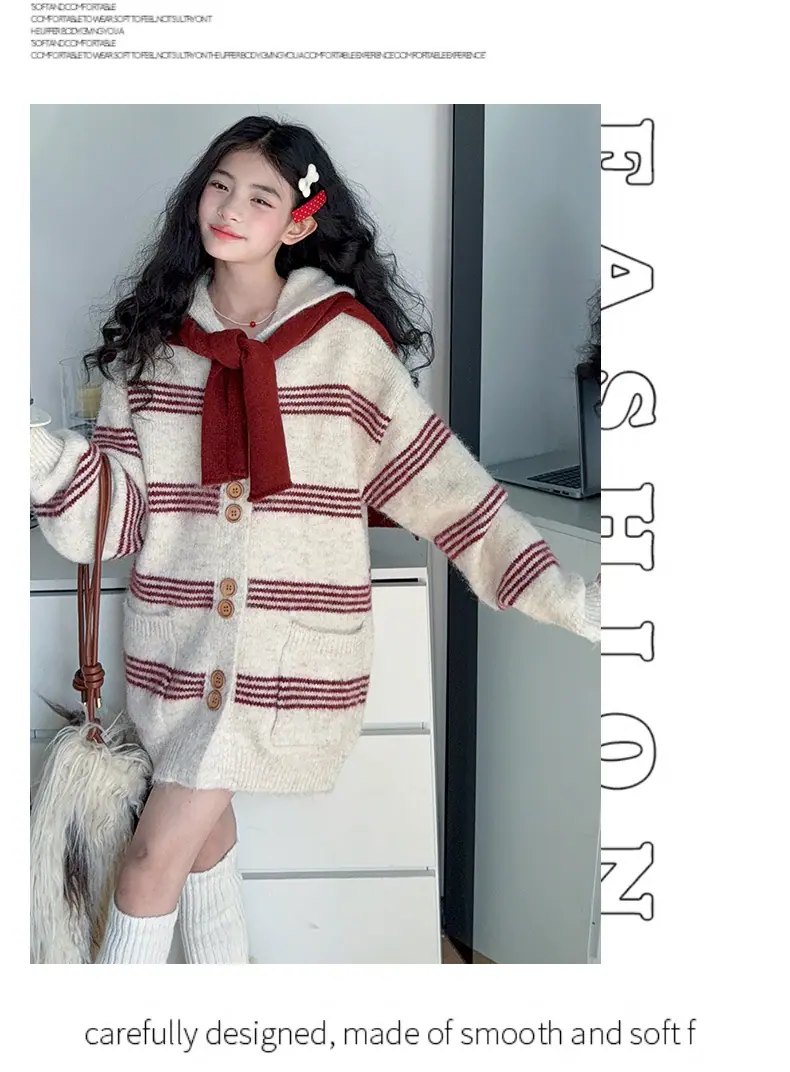 Vestido Cárdigan de Punto Grueso Rayado de Estilo Coreano con Capucha Larga para Niñas Otoño e Invierno Chal Suéter Abrigo para Niñas Grandes Primavera y Otoño
