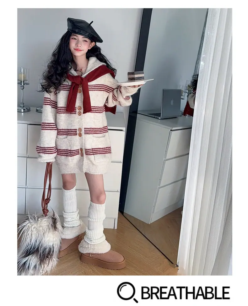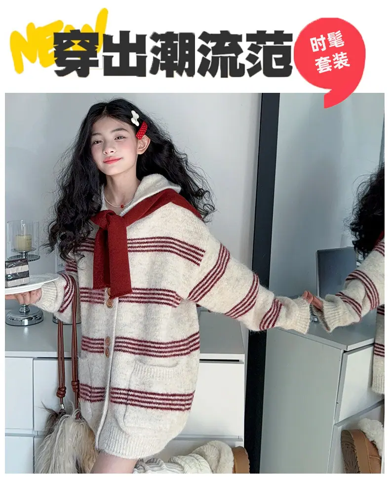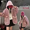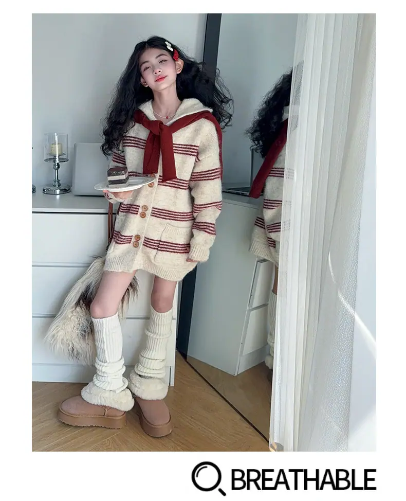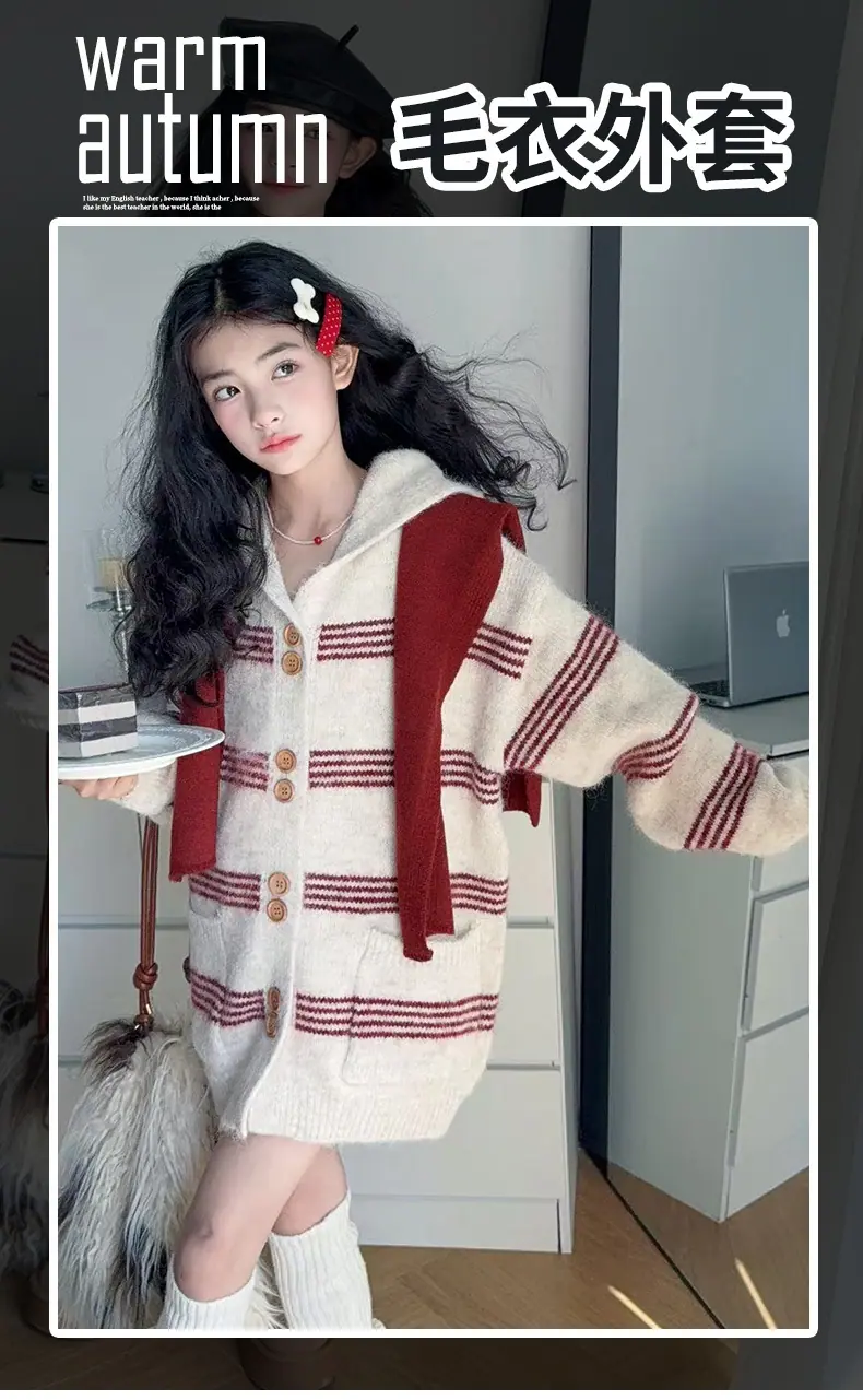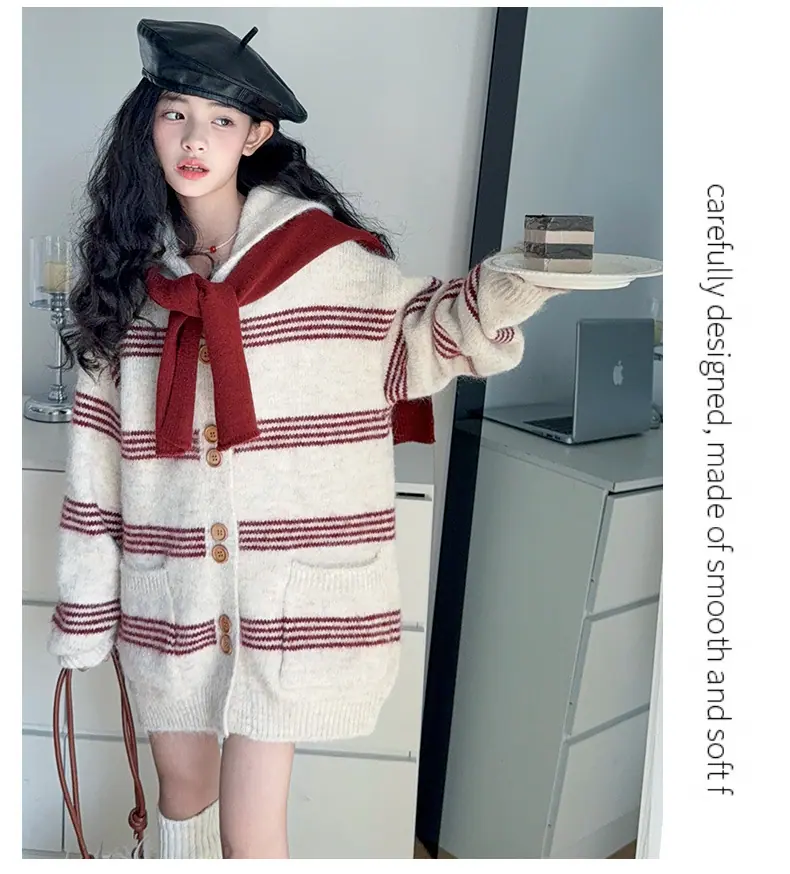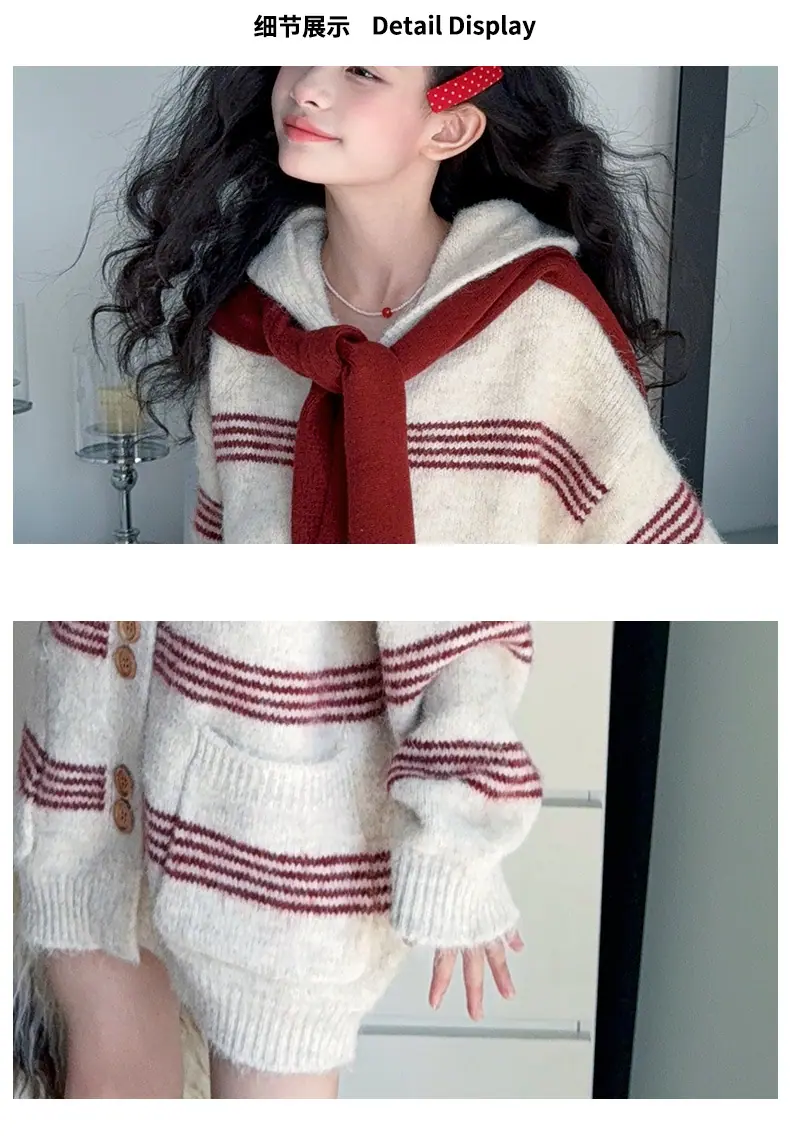 Vestido Cárdigan de Punto Grueso Rayado de Estilo Coreano con Capucha Larga para Niñas Otoño e Invierno Chal Suéter Abrigo para Niñas Grandes Primavera y Otoño