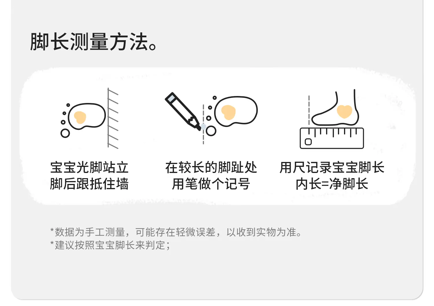 Recommended foot length for 1-3 years old: 11-13CM [shoe size 16-19]