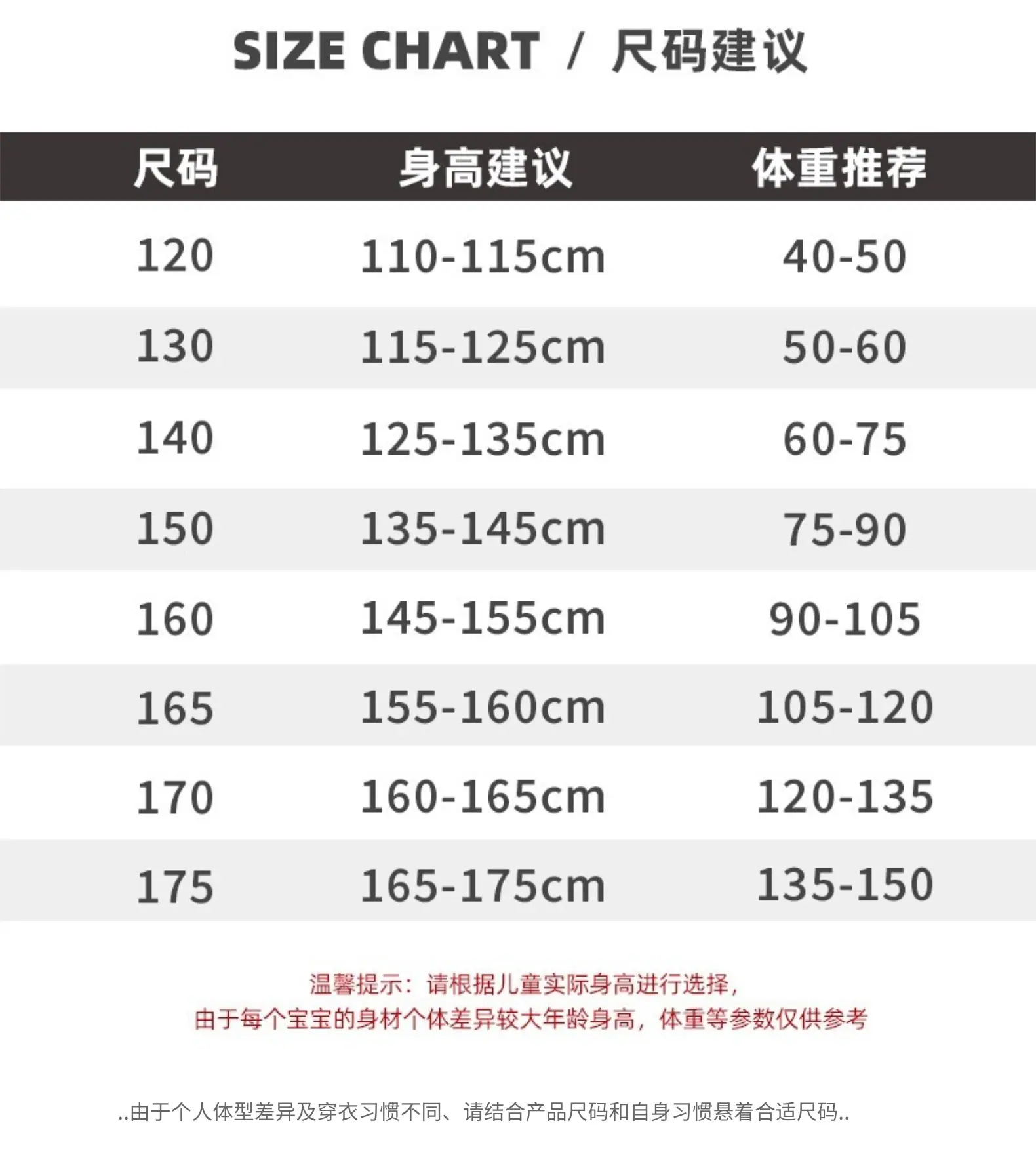 Size 120 (suggested height 115-120cm), Size 130 (recommended height 125-130cm), Size 140 (suggested height 135...