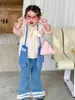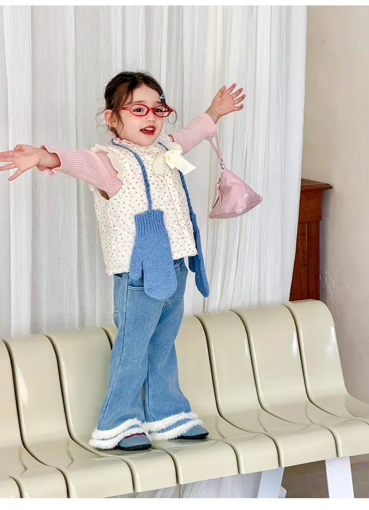 Floral vest, pink sweater, Lace denim flared pants