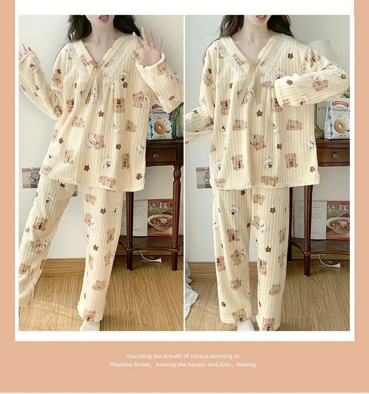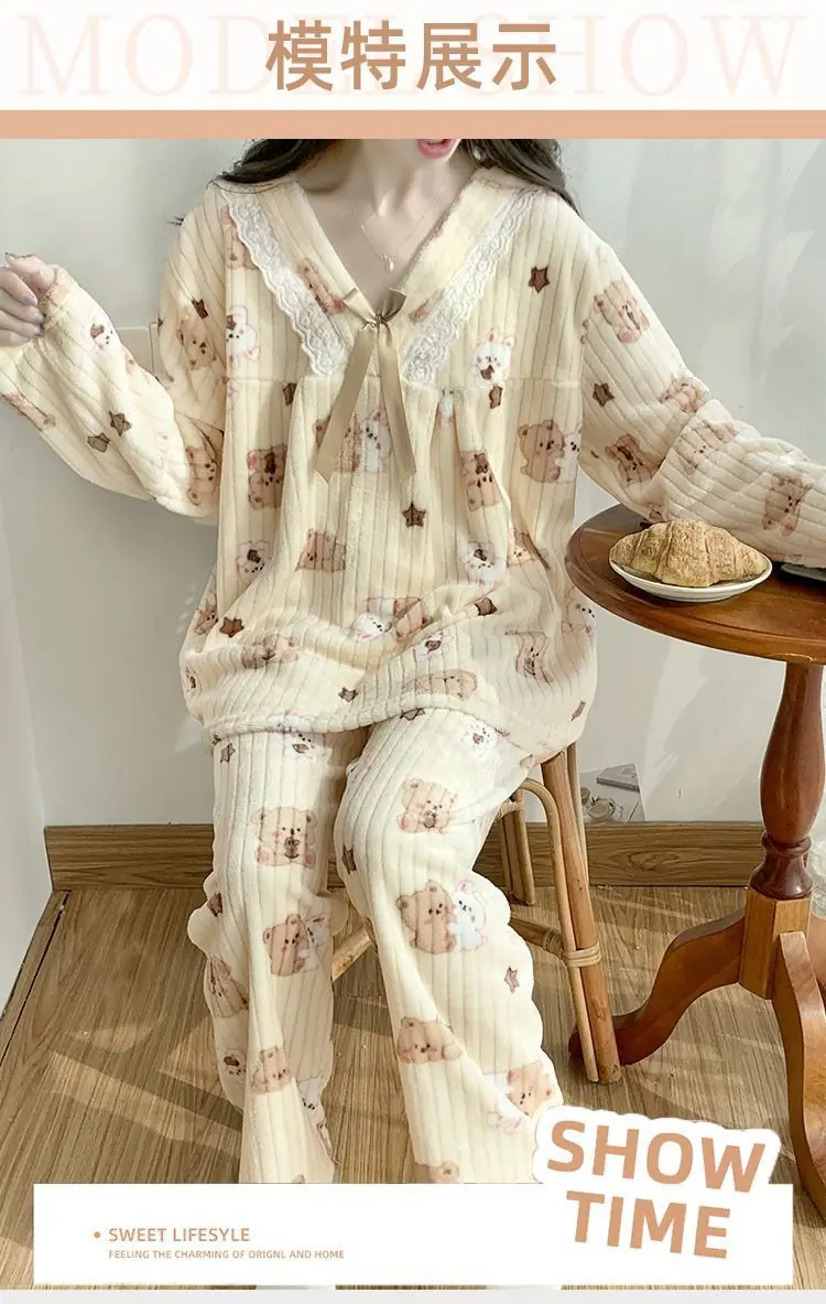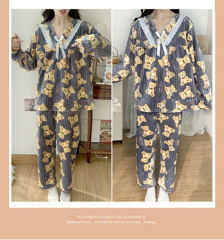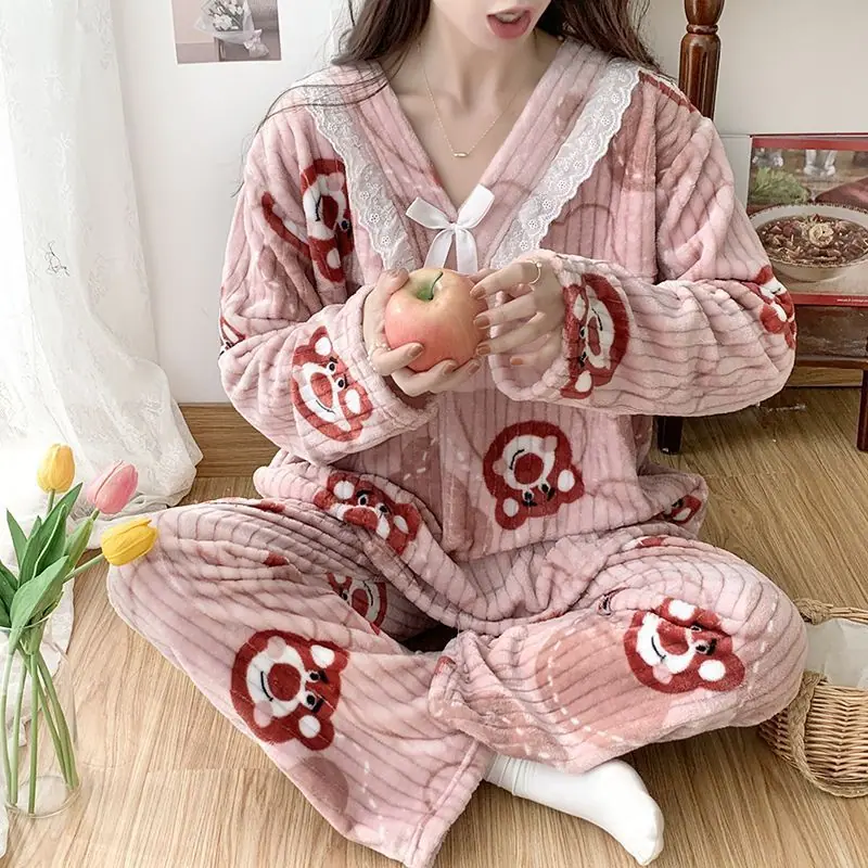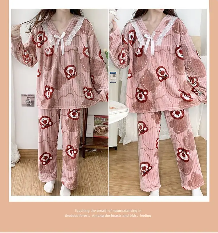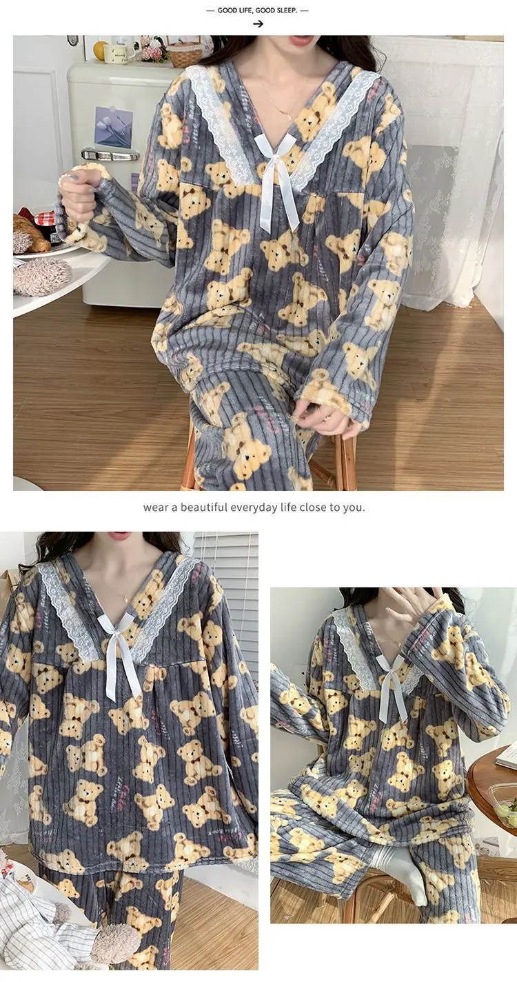 Pijamas de Mujer Niña Invierno Franela Engrosado Cálido Dibujos Animados Suelto Talla Grande Forro Polar Coral Conjunto Ropa de Casa Invierno