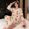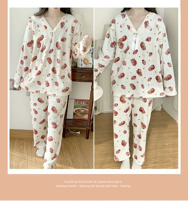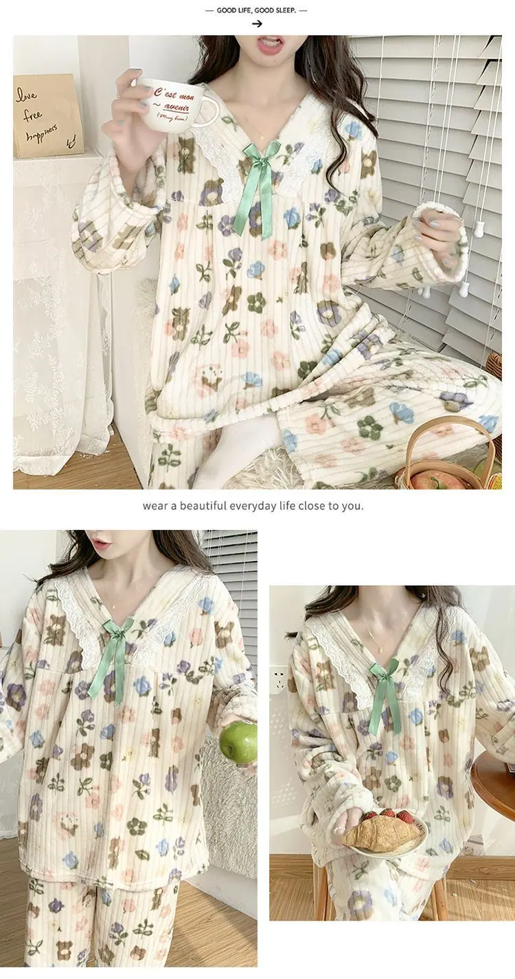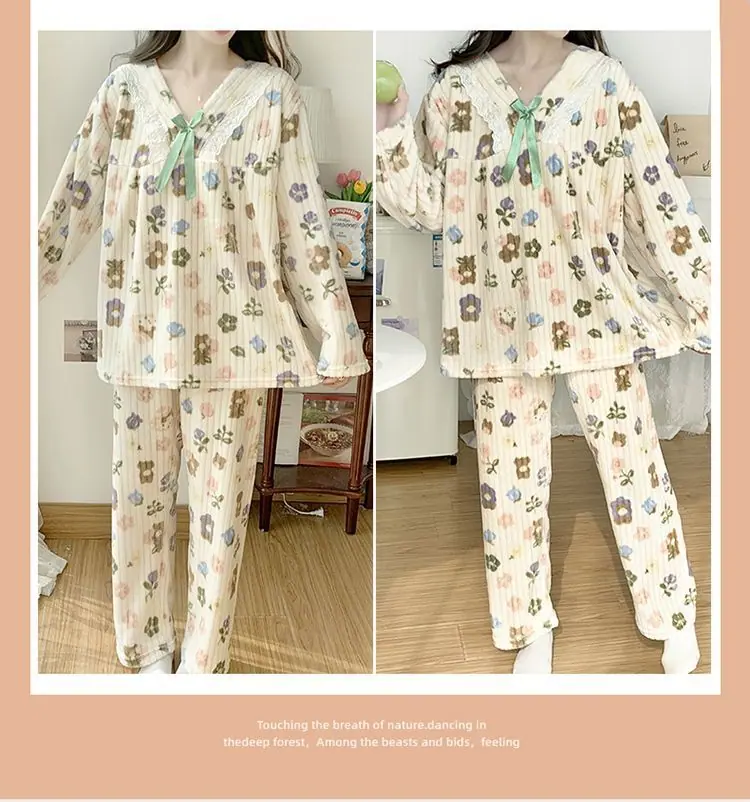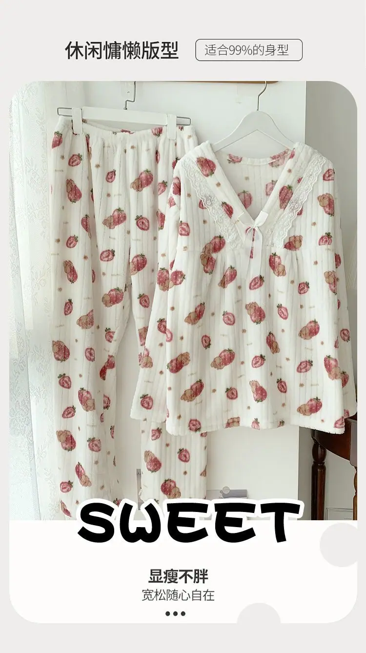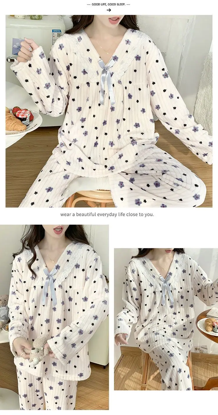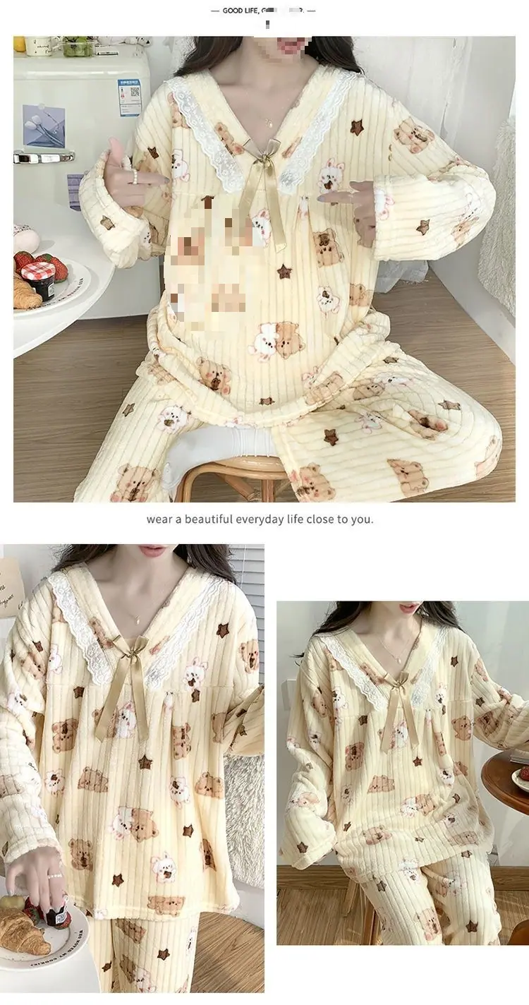 Pijamas de Mujer Niña Invierno Franela Engrosado Cálido Dibujos Animados Suelto Talla Grande Forro Polar Coral Conjunto Ropa de Casa Invierno