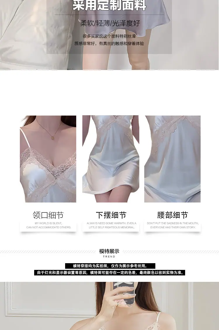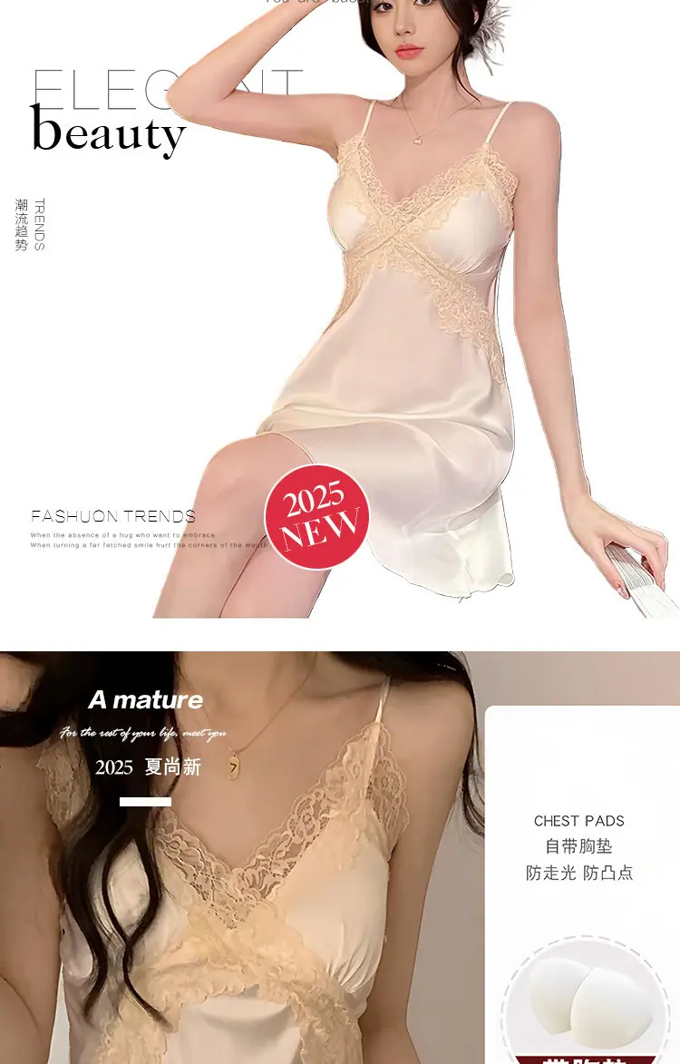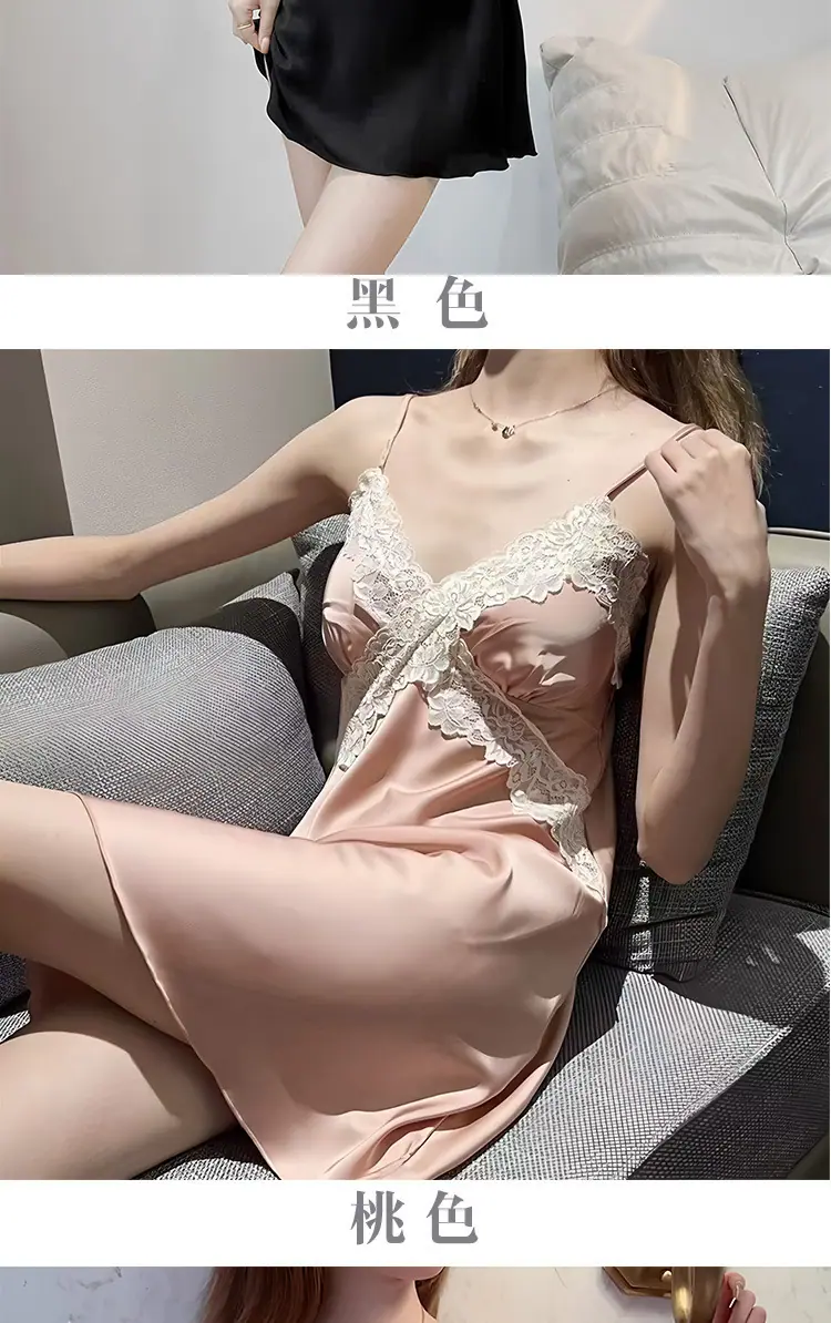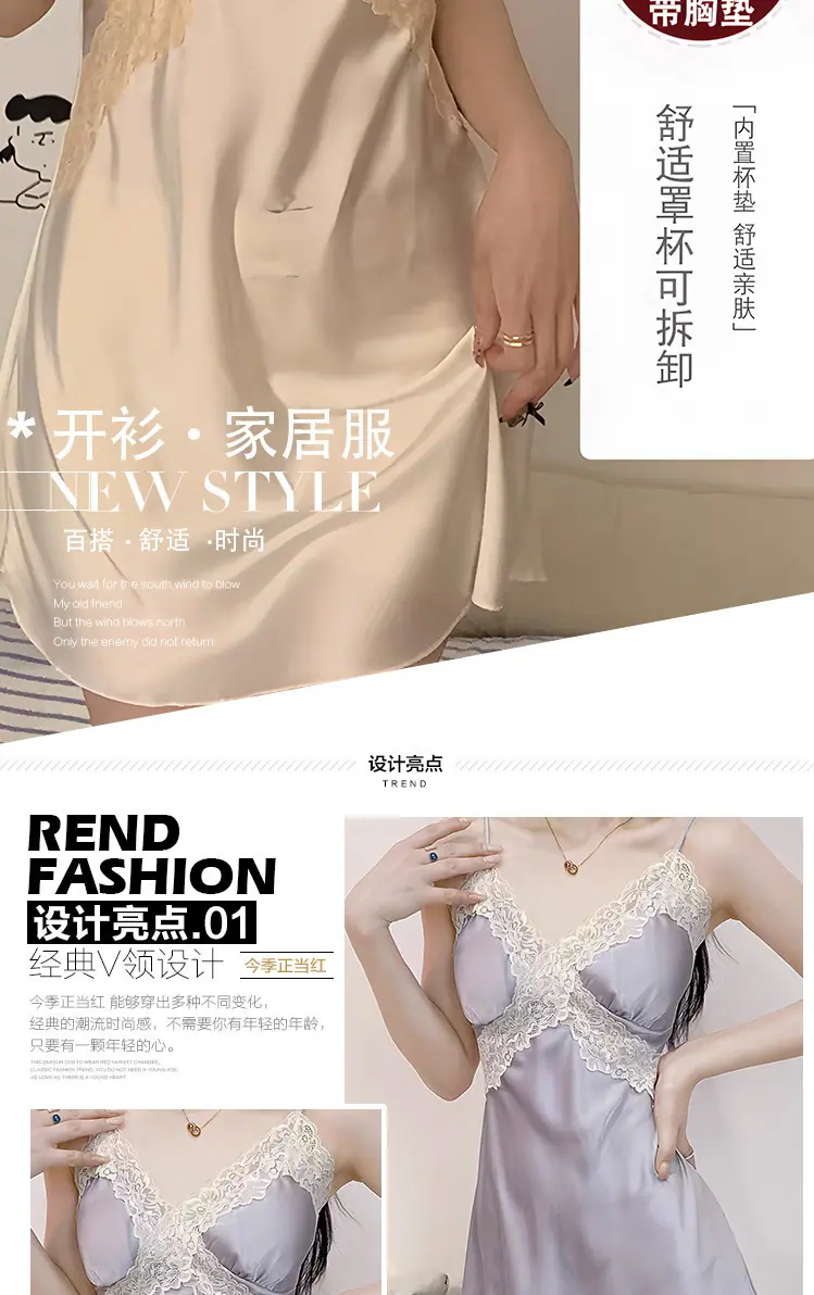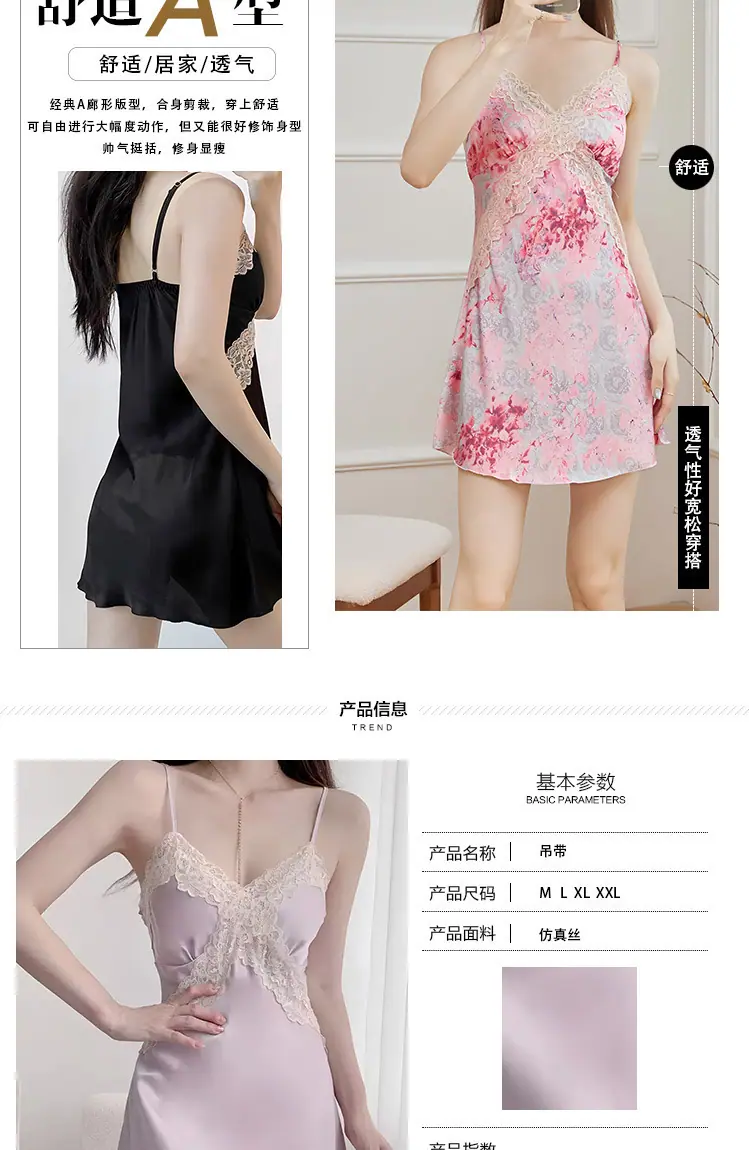 Camisón de Tirantes para Mujer Verano Estilo Delgado Seda de Hielo Deseo Puro Viento Sexy Encaje Pijama con Almohadilla en el Pecho Talla Grande Adelgazante Ropa para Estar en Casa
