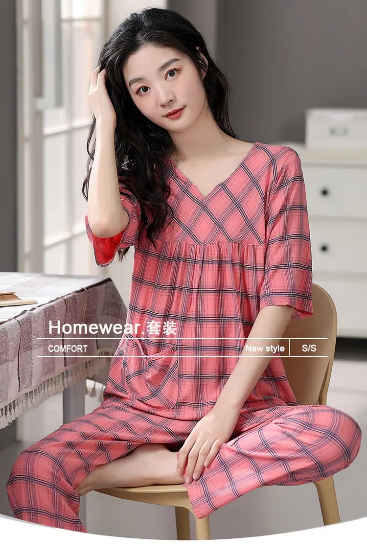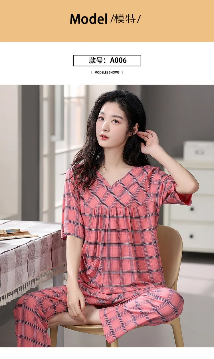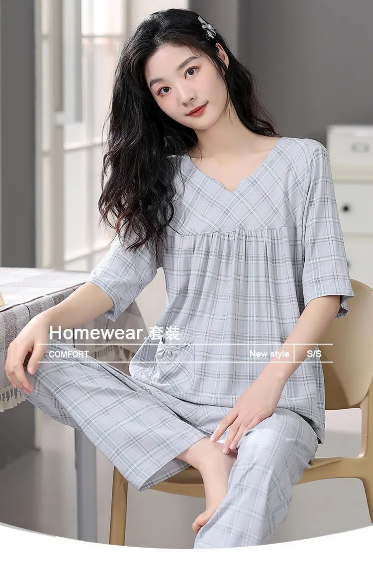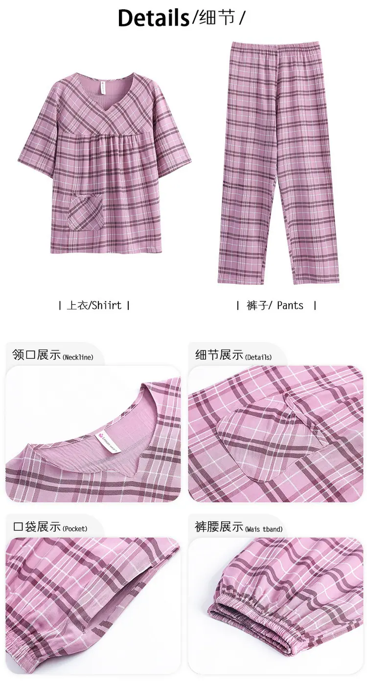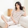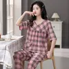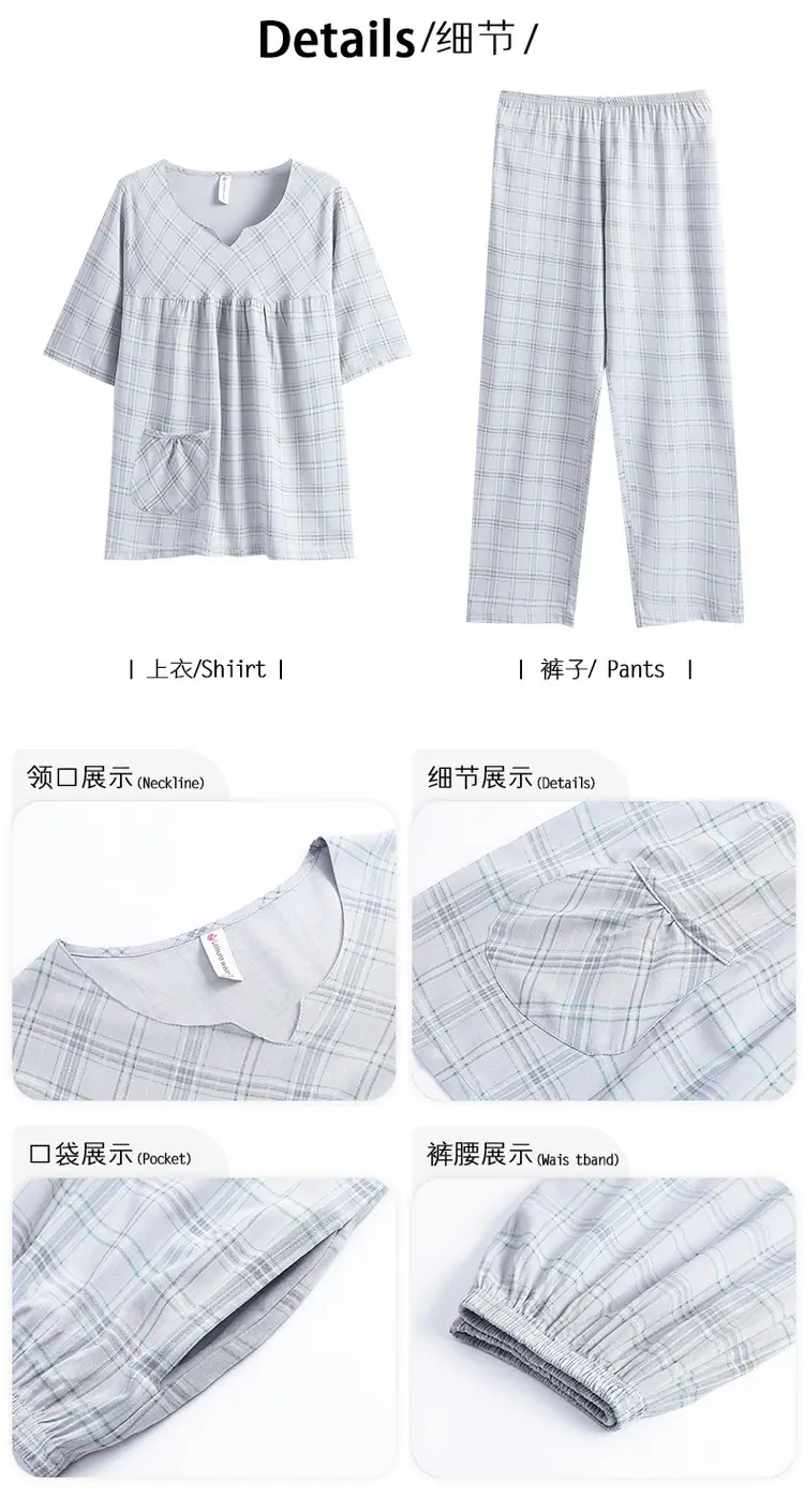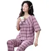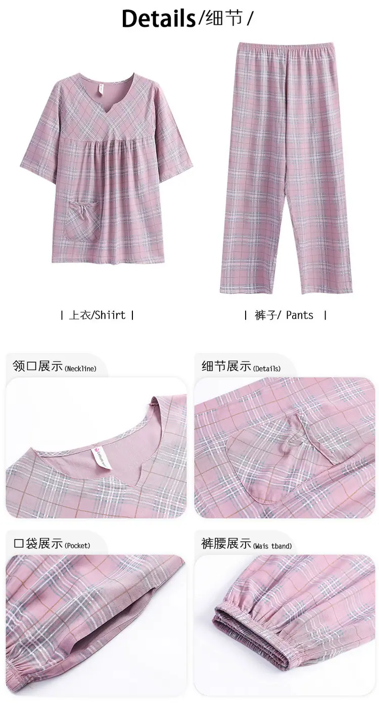 Pijama de Verano para Mujer de Manga Corta y Pantalón de Algodón Tejido Casual Talla Grande Ropa de Casa Traje de Verano para Exterior Delgado