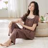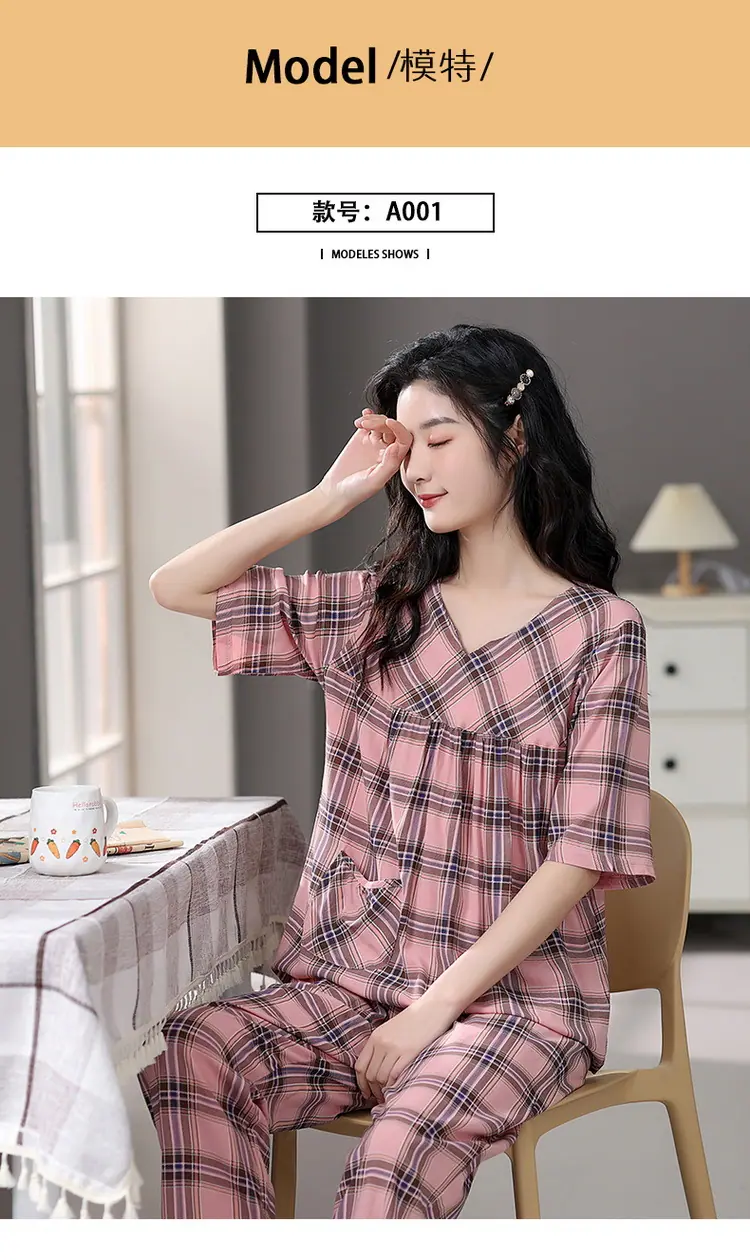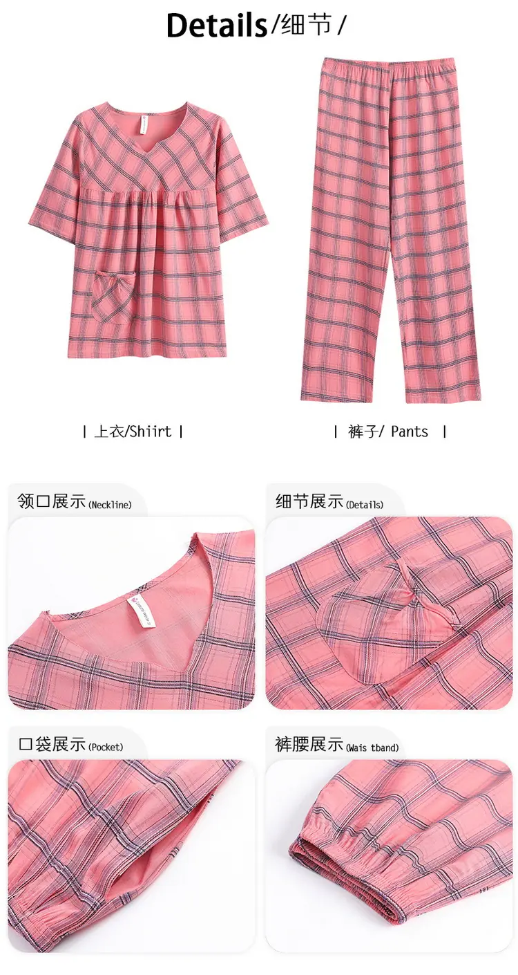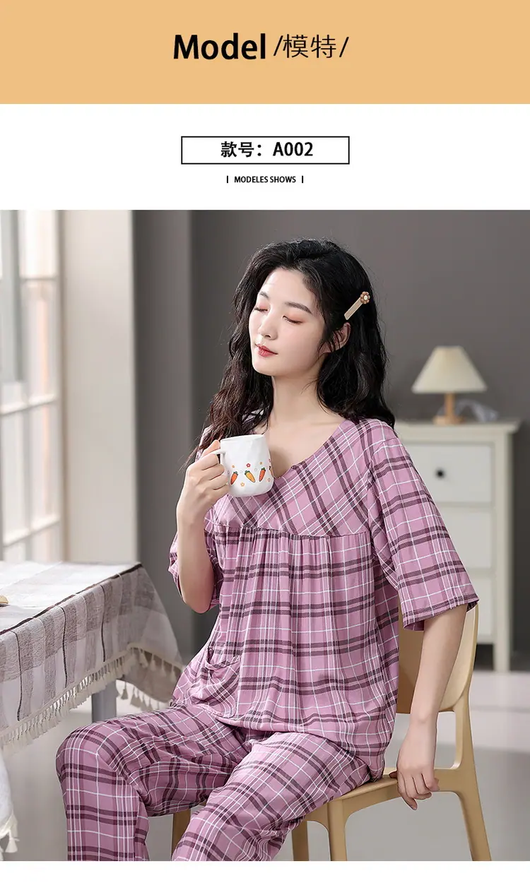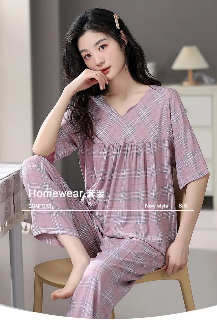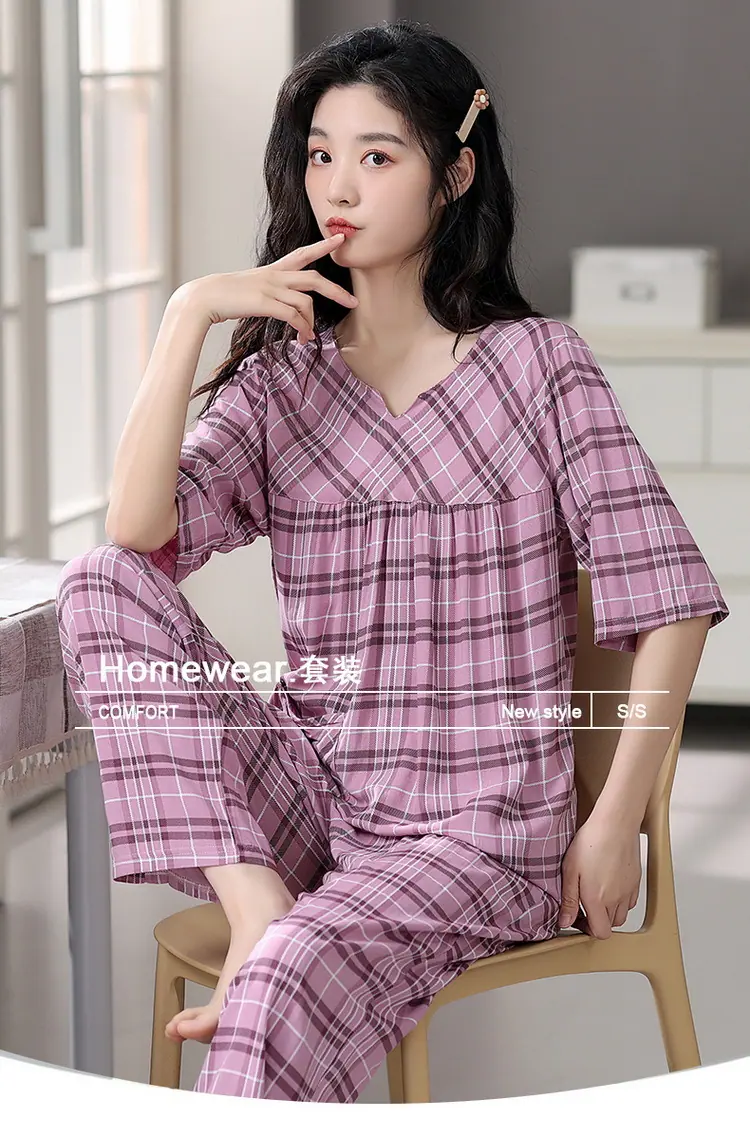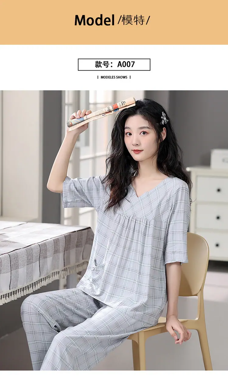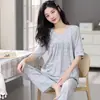 Pijama de Verano para Mujer de Manga Corta y Pantalón de Algodón Tejido Casual Talla Grande Ropa de Casa Traje de Verano para Exterior Delgado