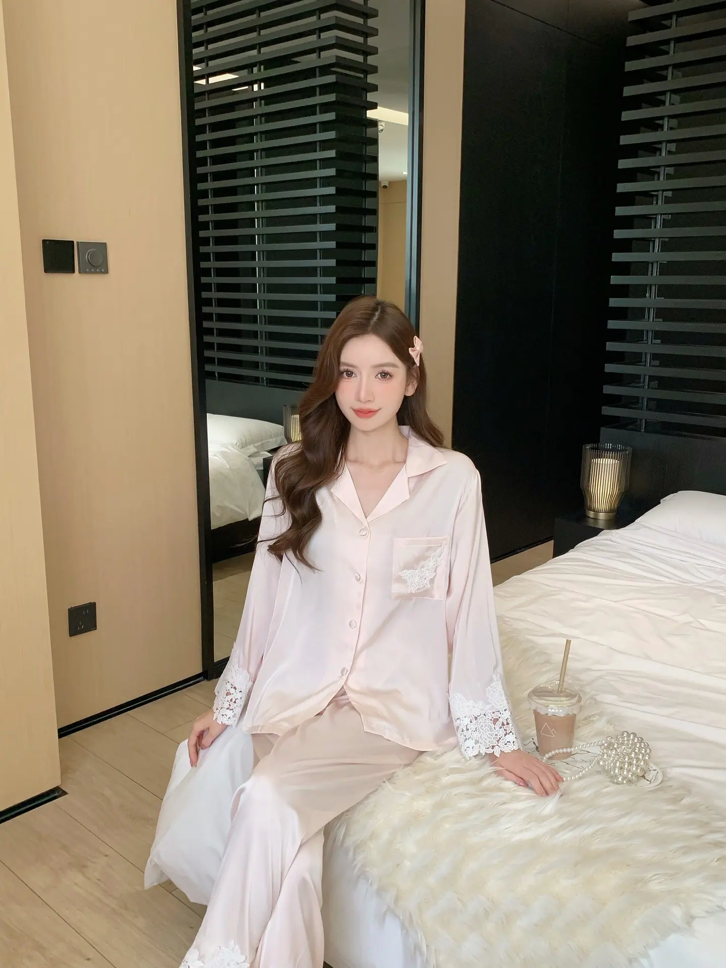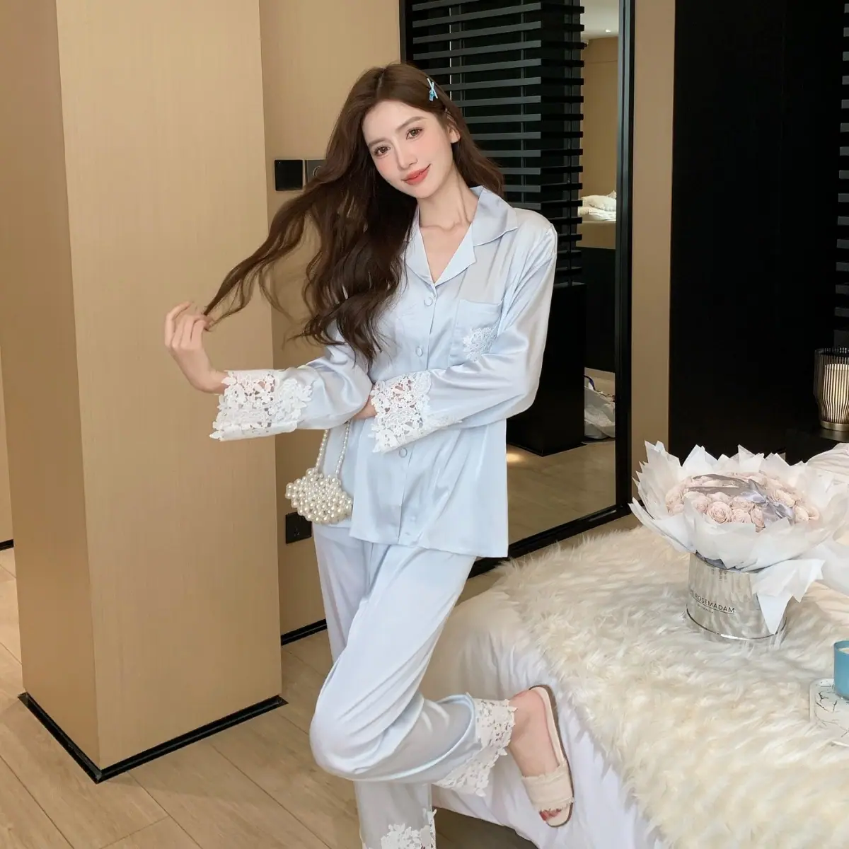 Pijamas de Seda de Hielo para Mujer Pijamas de Seda de Hielo para Mujer Otoño 5 Invierno de Alta Gama Nuevo Estilo Princesa Francesa Ropa de Hogar
