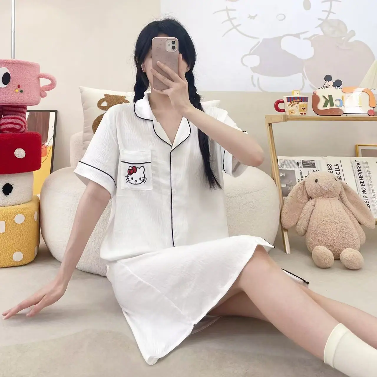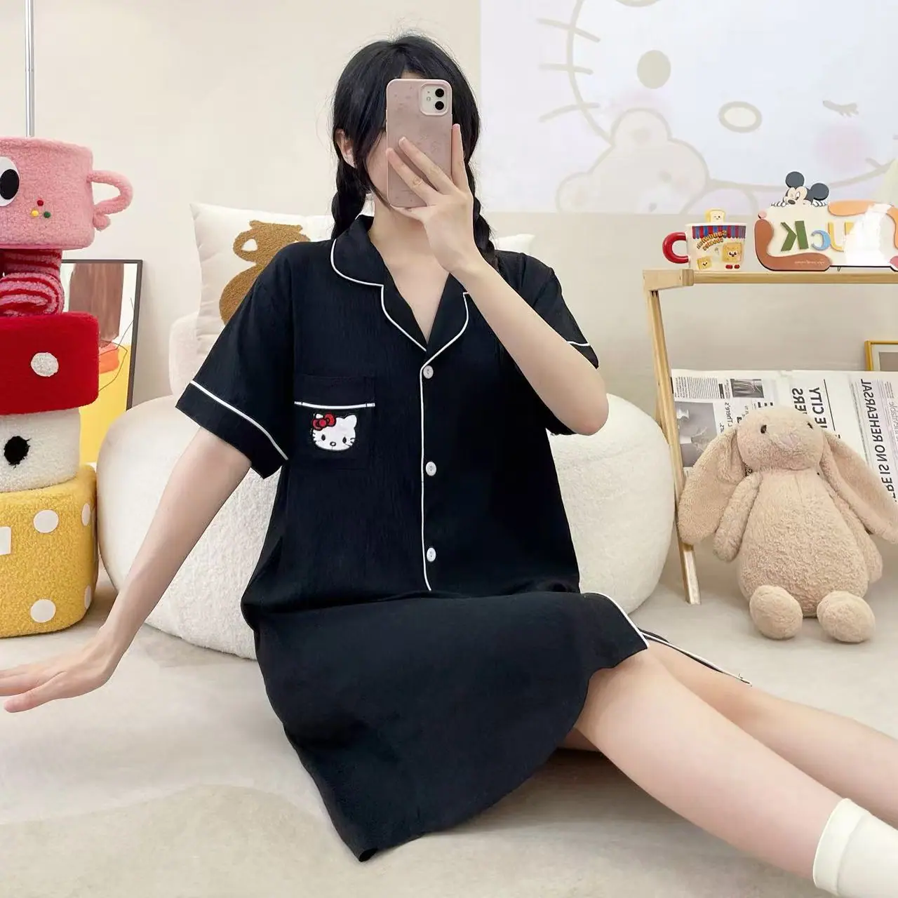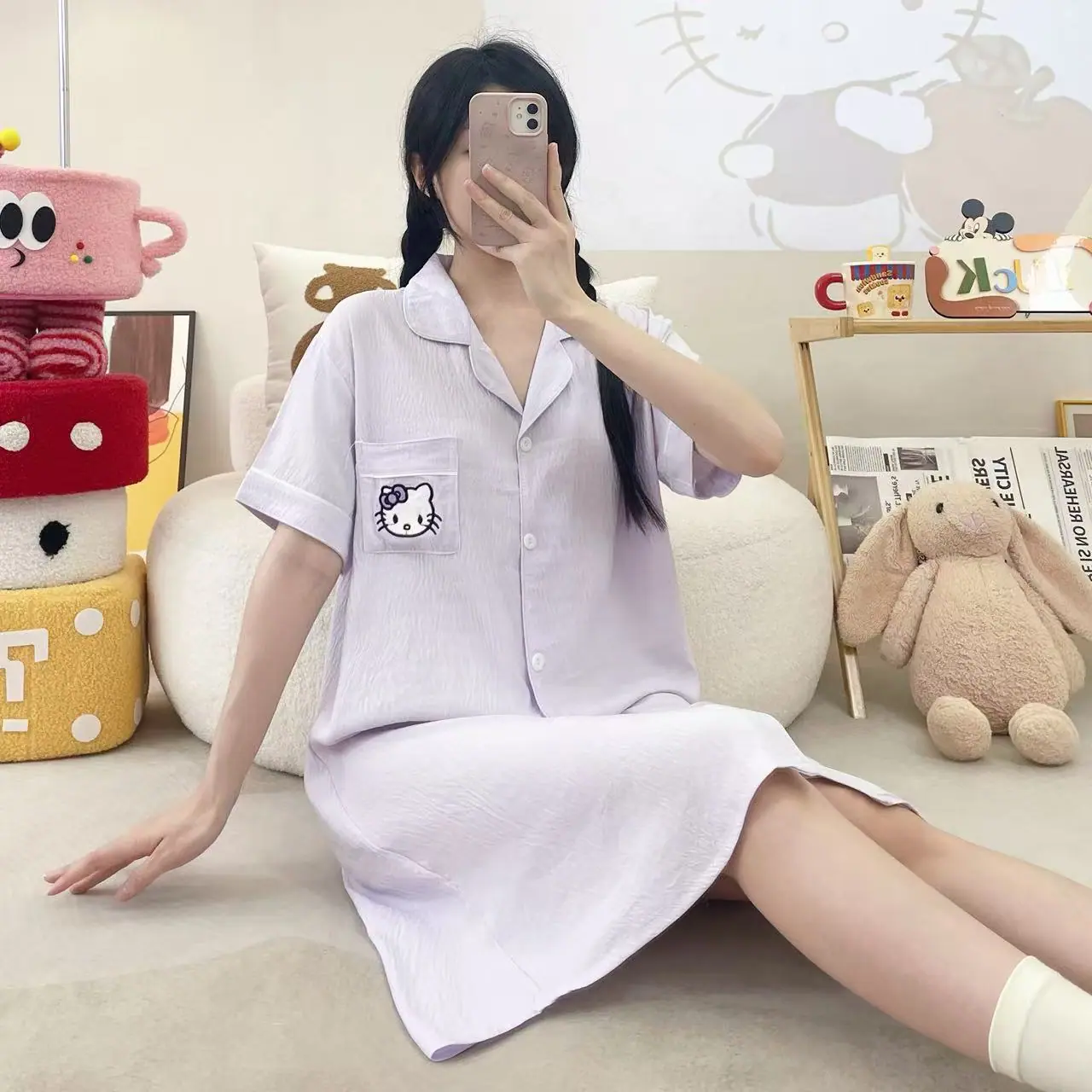 Ropa de Casa Estilo Verano Camisón de Manga Corta para Mujer Cárdigan Solapa Bordado de Dibujos Animados Nube Algodón Cómodo Transpirable Estilo Simple