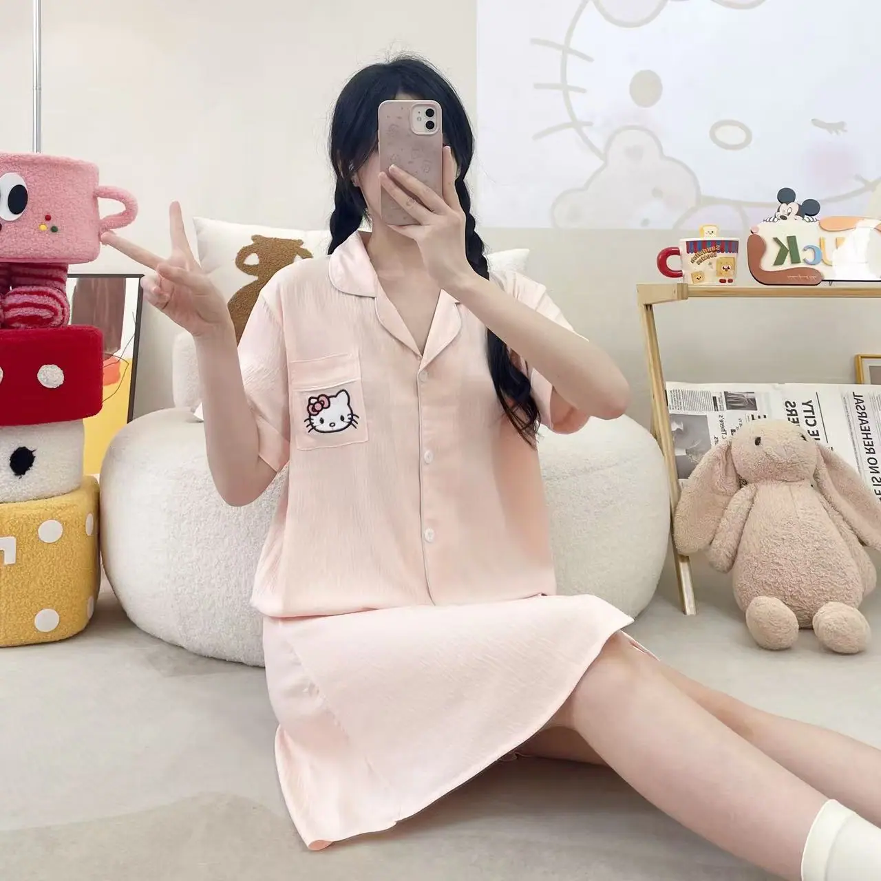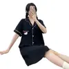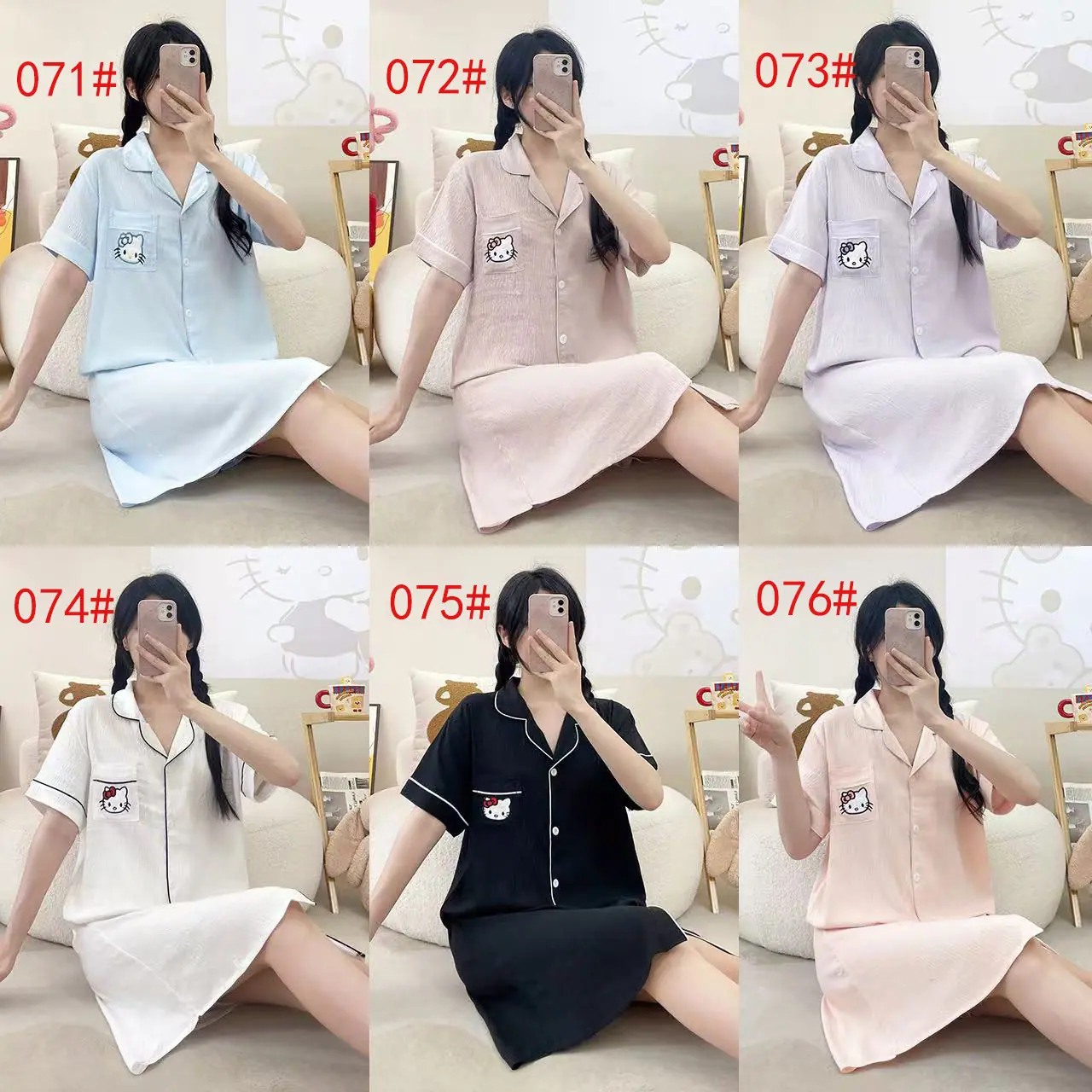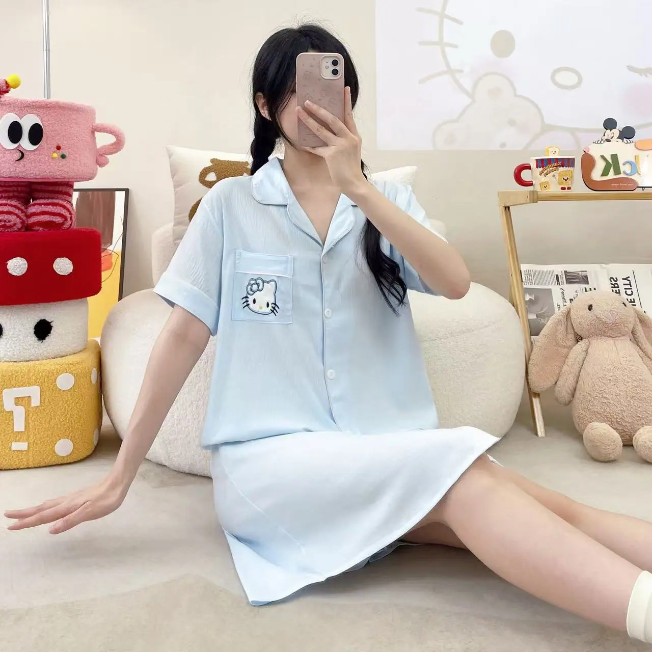 Ropa de Casa Estilo Verano Camisón de Manga Corta para Mujer Cárdigan Solapa Bordado de Dibujos Animados Nube Algodón Cómodo Transpirable Estilo Simple