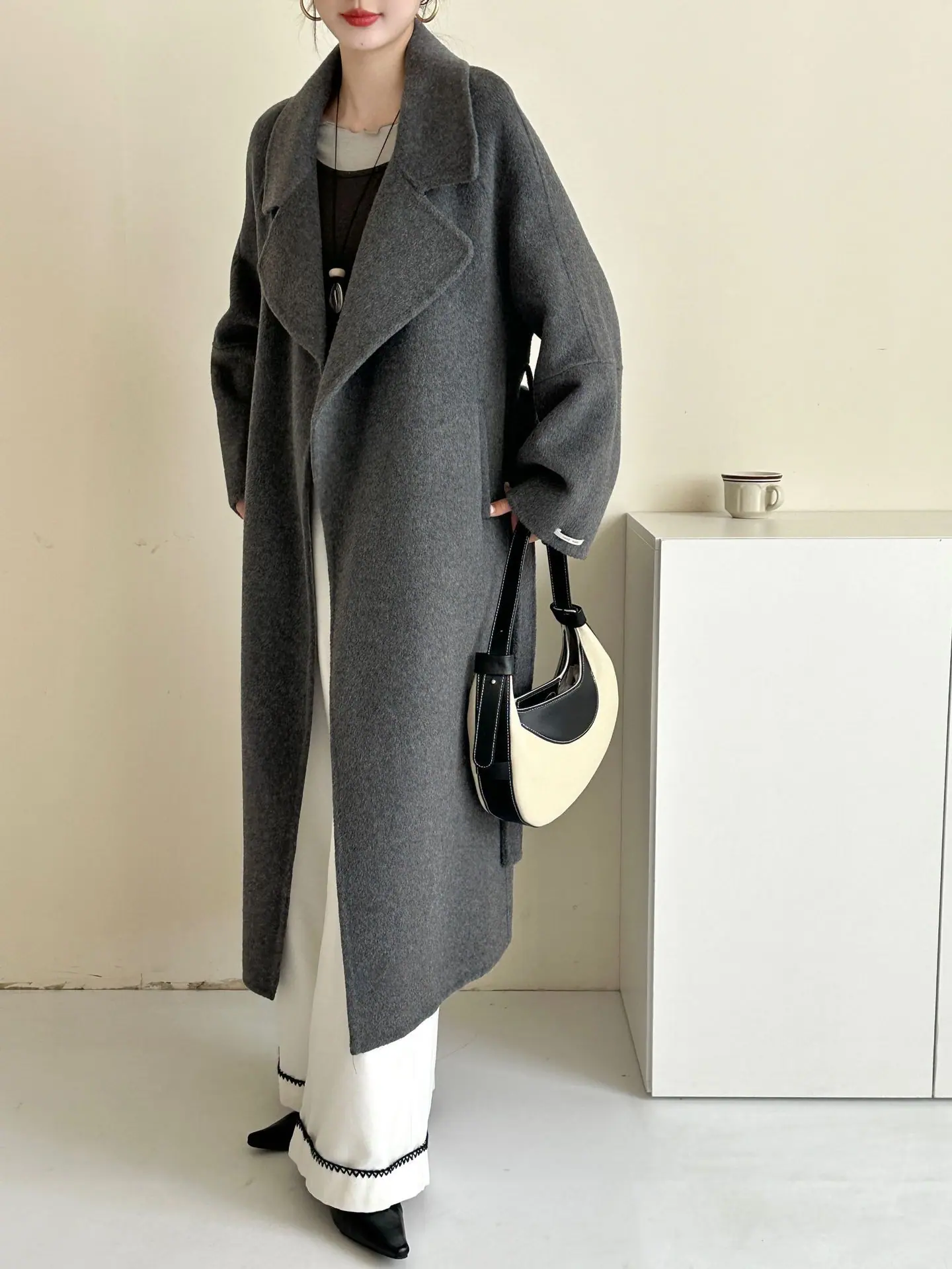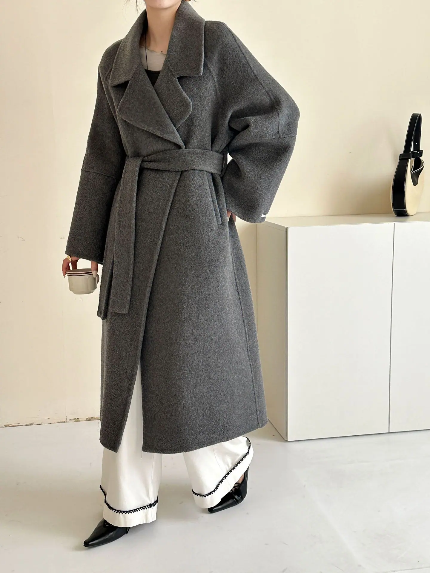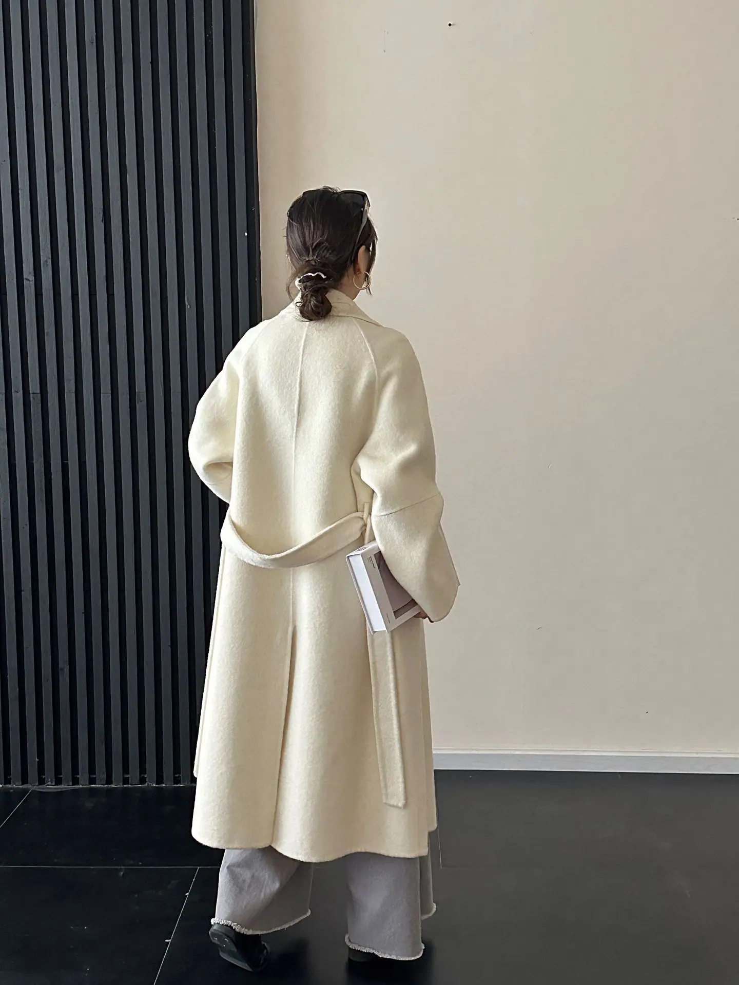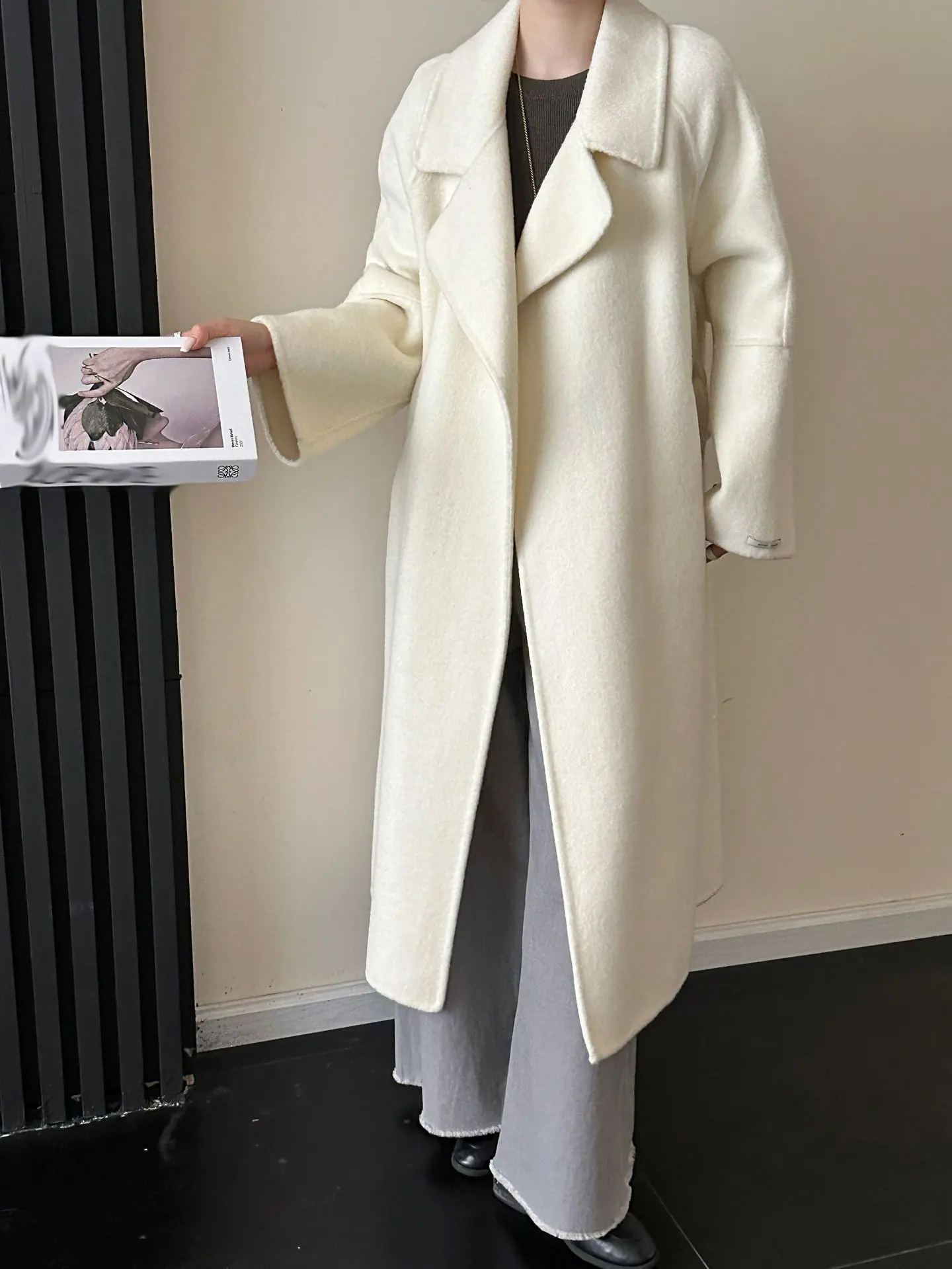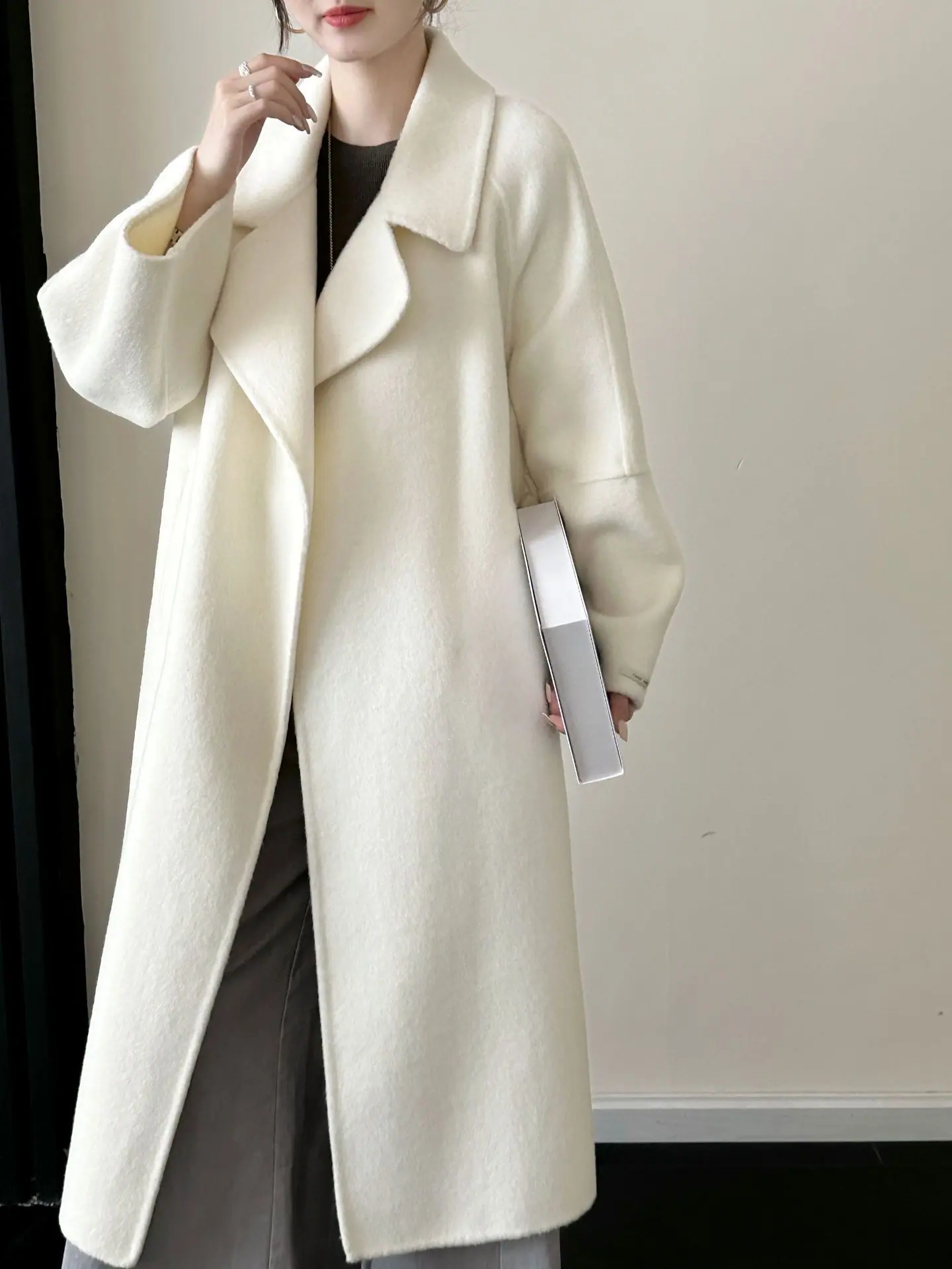 Abrigo de Lana de Doble Faz para Mujer con Cuello de Traje, Doble Botonadura, Manga Raglán, Manga Larga, Largo Extendido, Corte Tridimensional